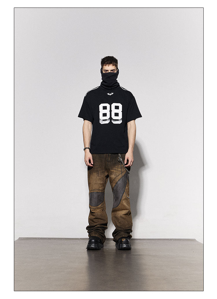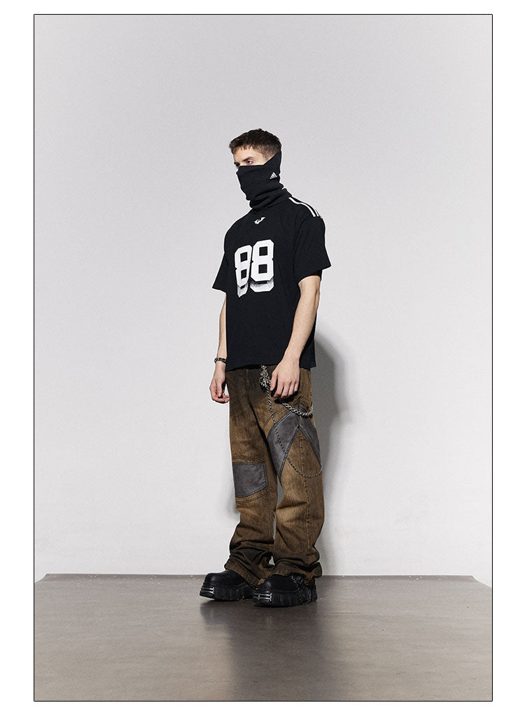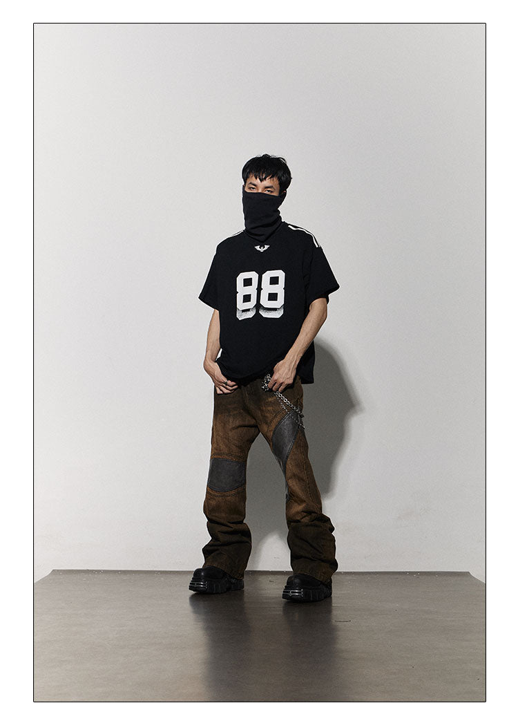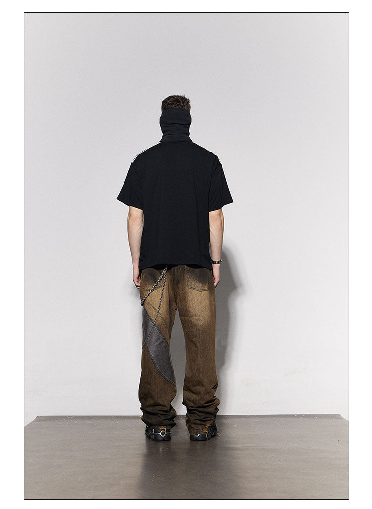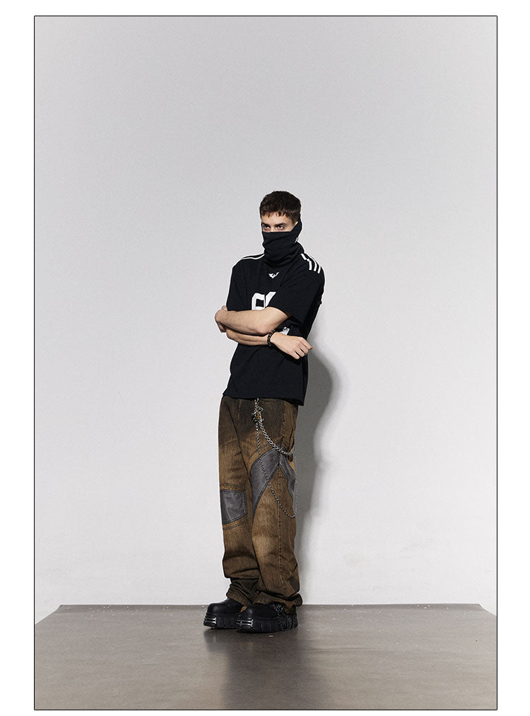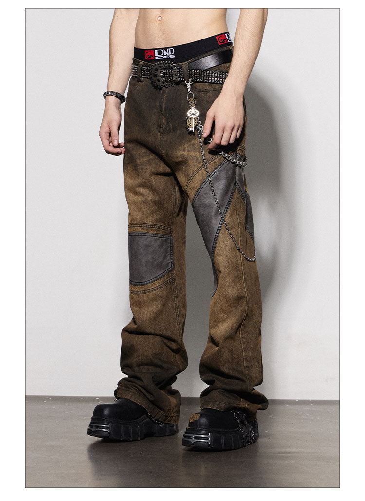 Distressed Brown Leather-Patched Jeans with Studded Belt