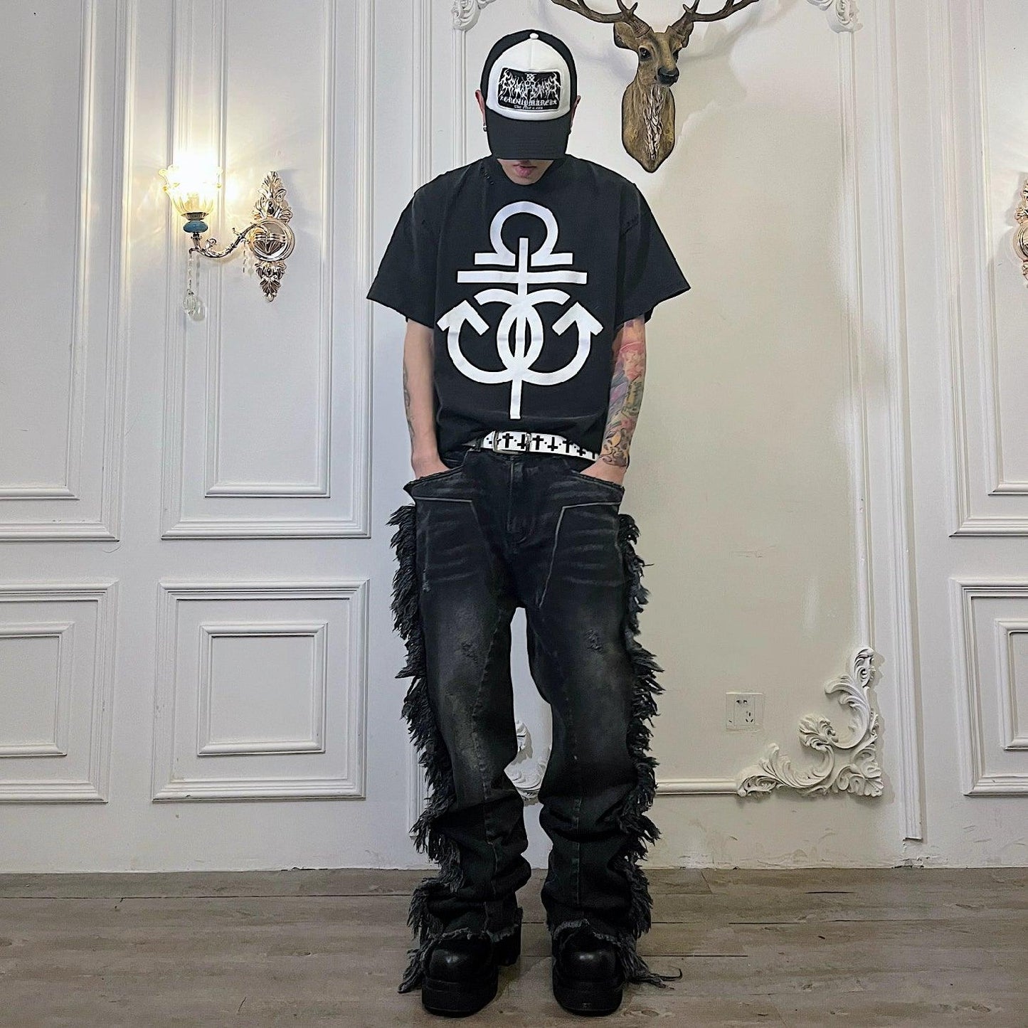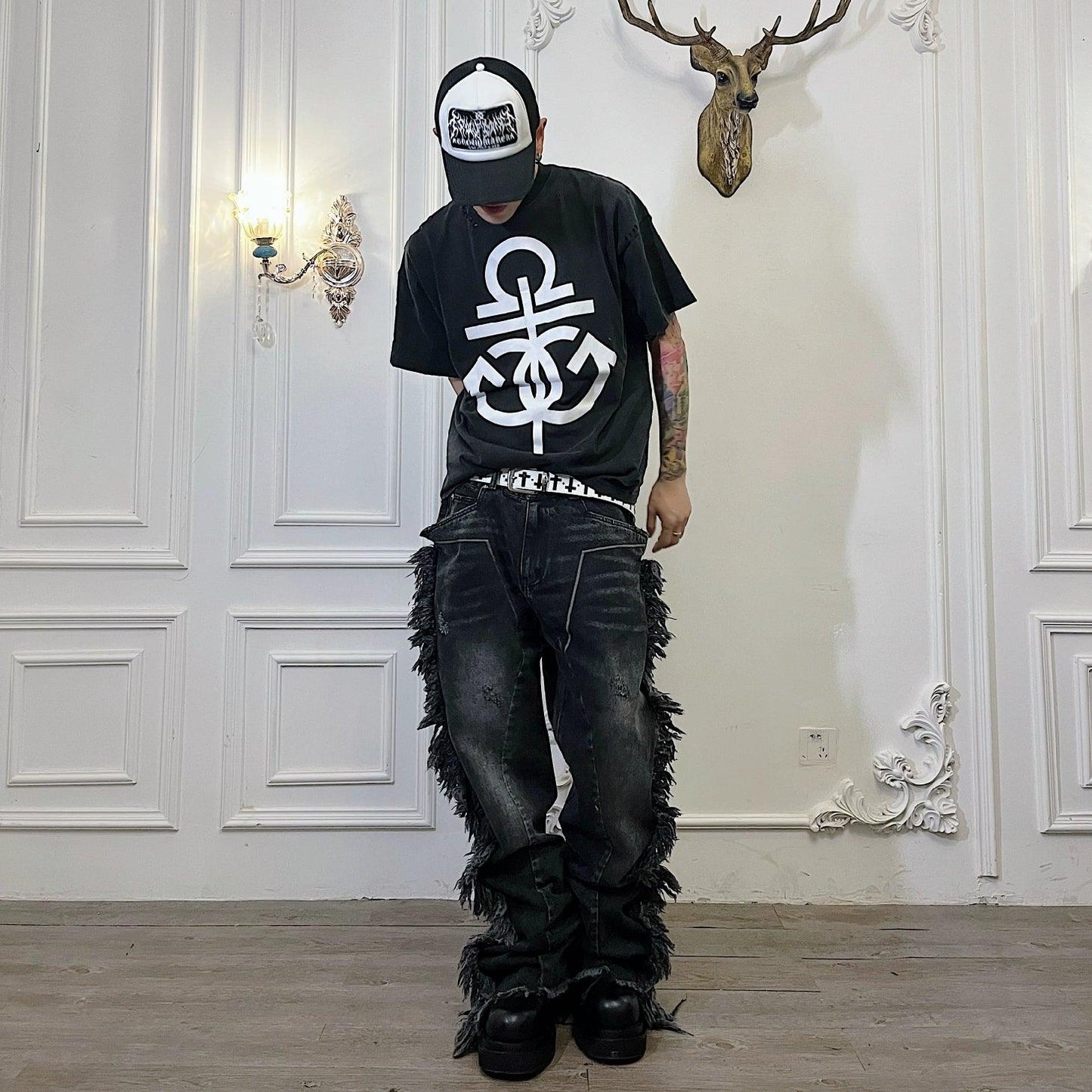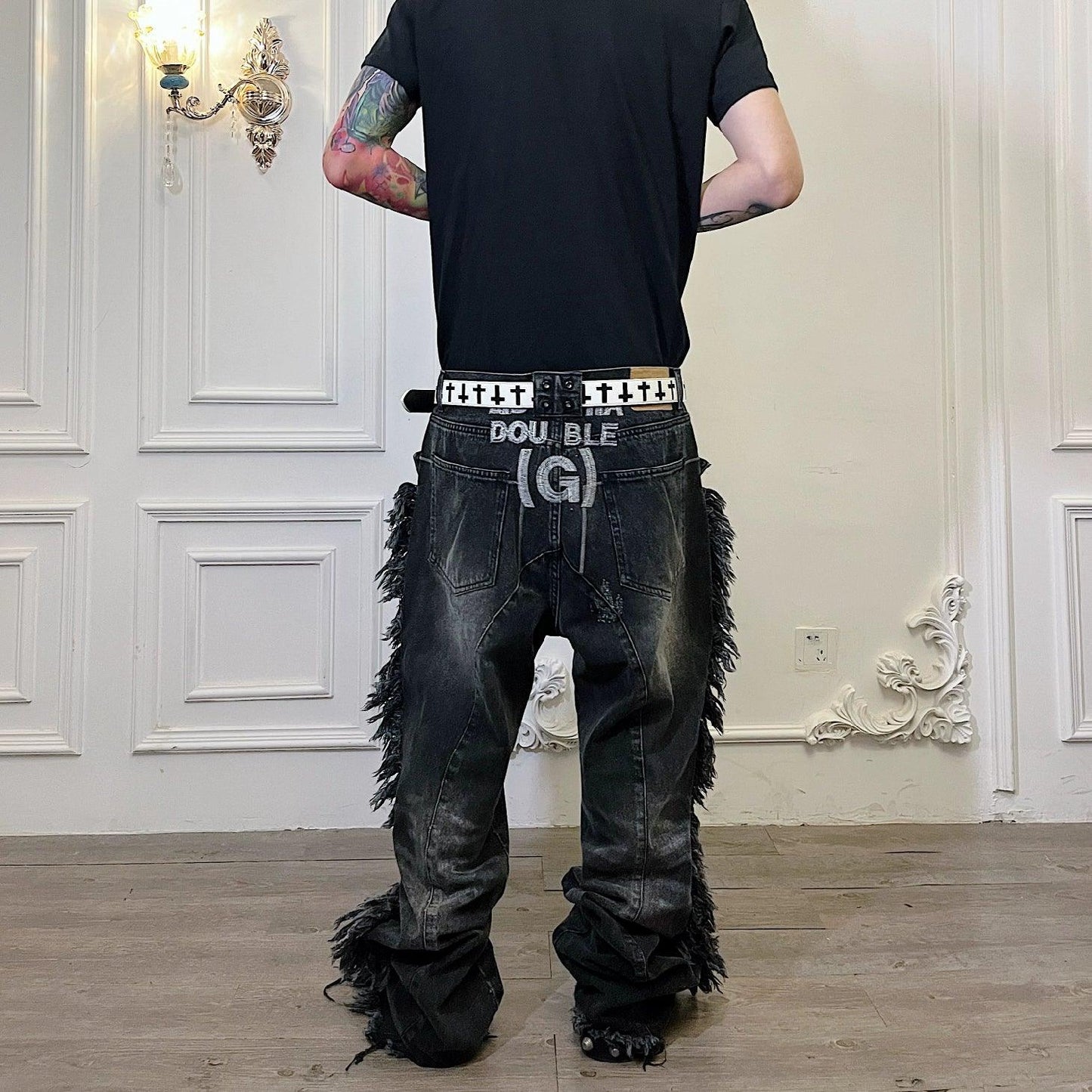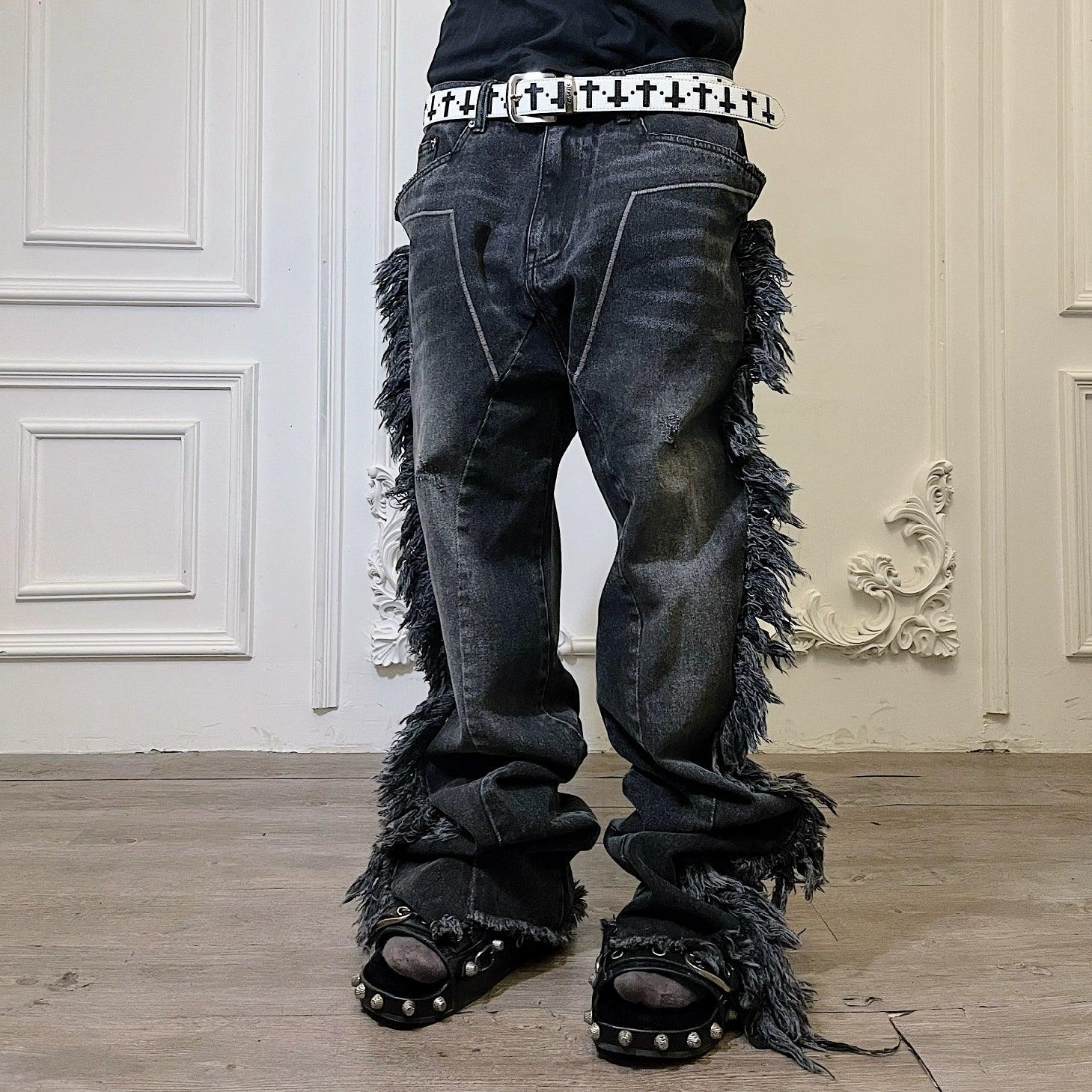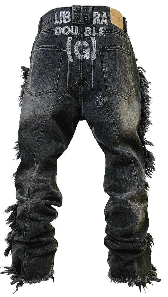 The Distressed Fur-Trimmed Gothic Jeans feature a bold and edgy design with distressed detailing and luxurious fur trims. perfect for making a statement. Crafted from high-quality. durable fabric. these jeans ensure long-lasting wear and comfort. The gothic-inspired elements. including the fur trims. add a unique and dramatic touch. while the distressed details provide a rugged aesthetic.