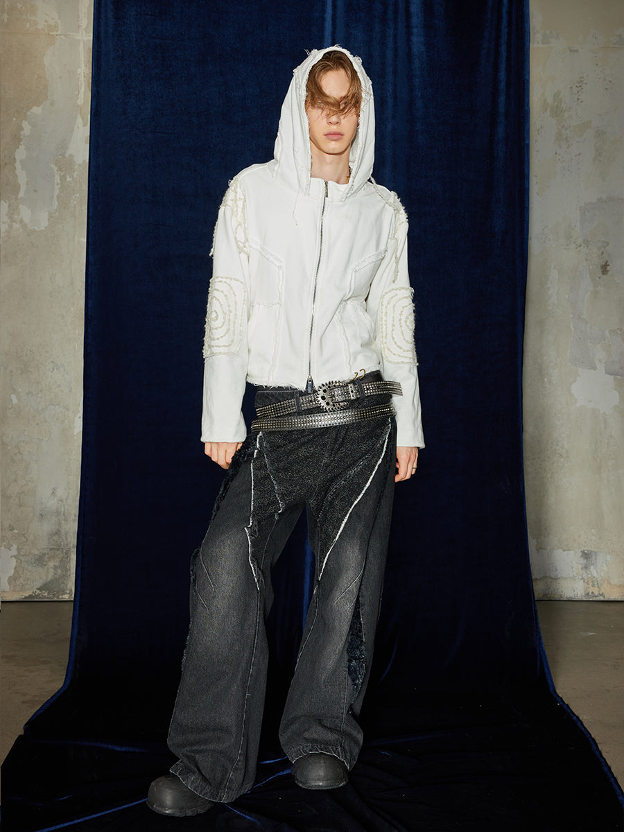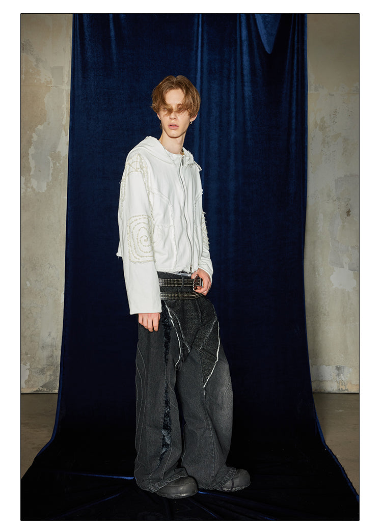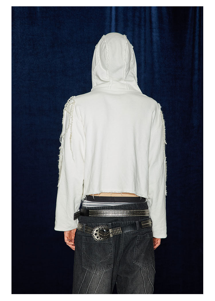 Add a touch of edgy charm to your wardrobe with our Distressed Ivory Cropped Zip-Up Textured Hoodie. Its unique distressed texture and cropped design bring a playful twist to a traditional hoodie. Keep warm and stylish in this must-have piece!
