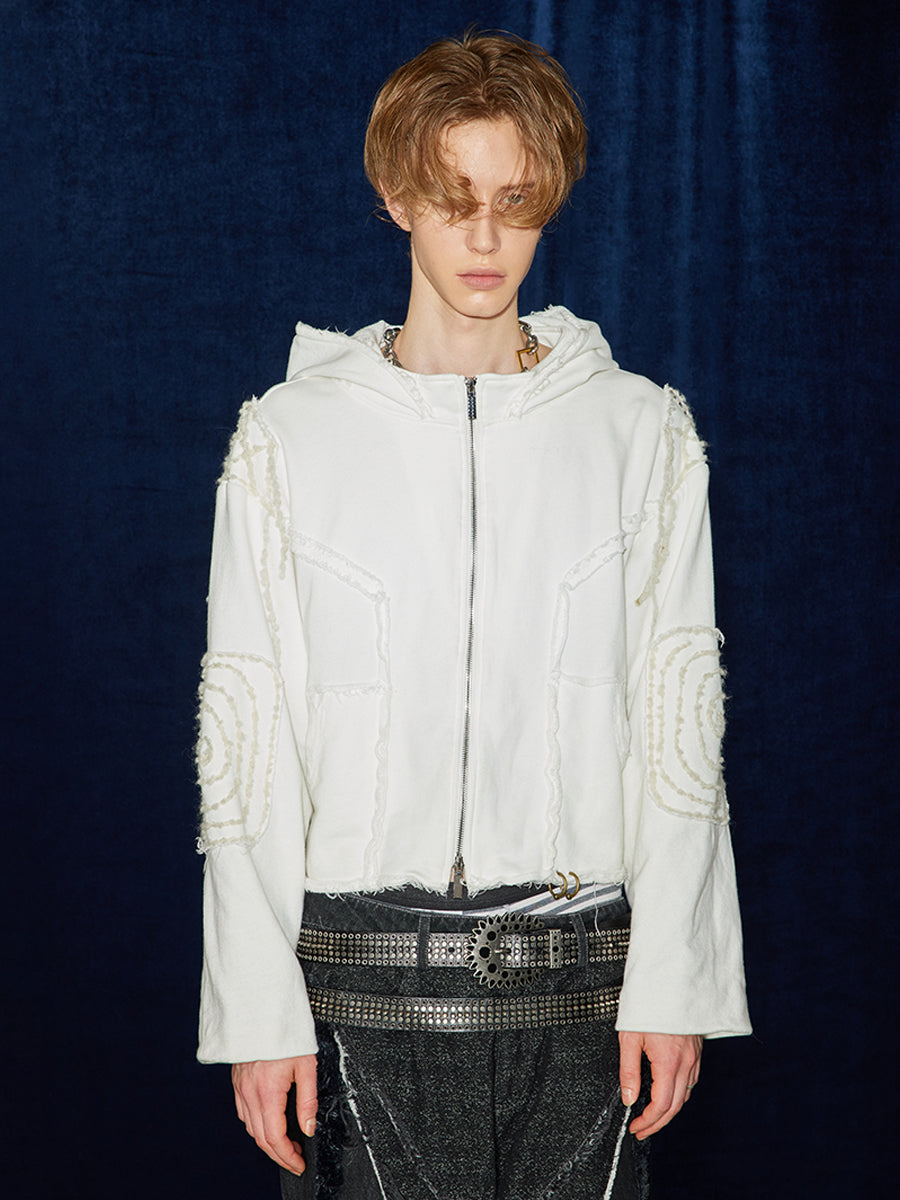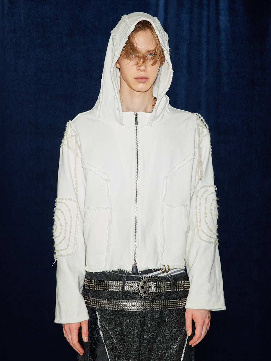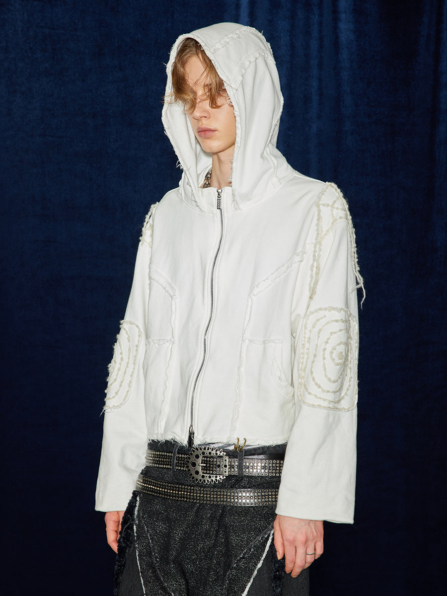 Distressed Ivory Cropped Zip-Up Textured Hoodie