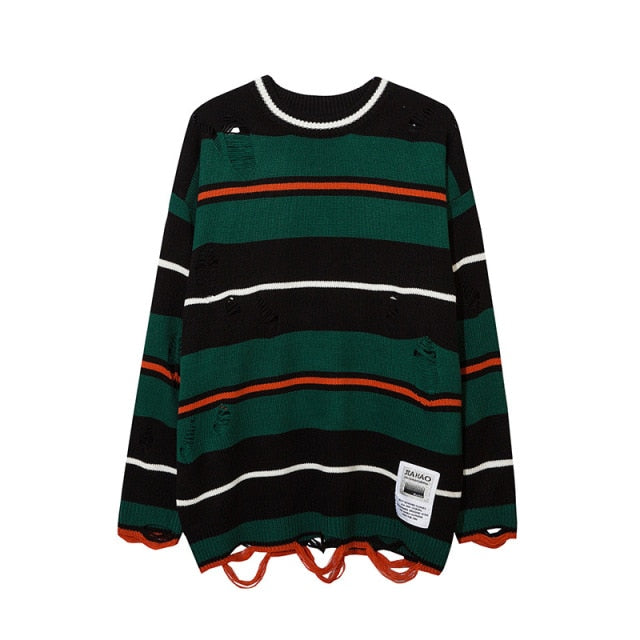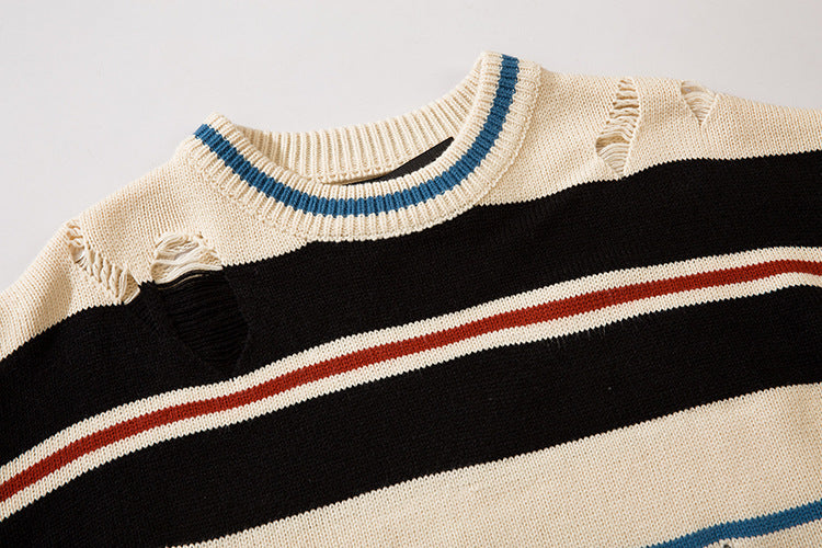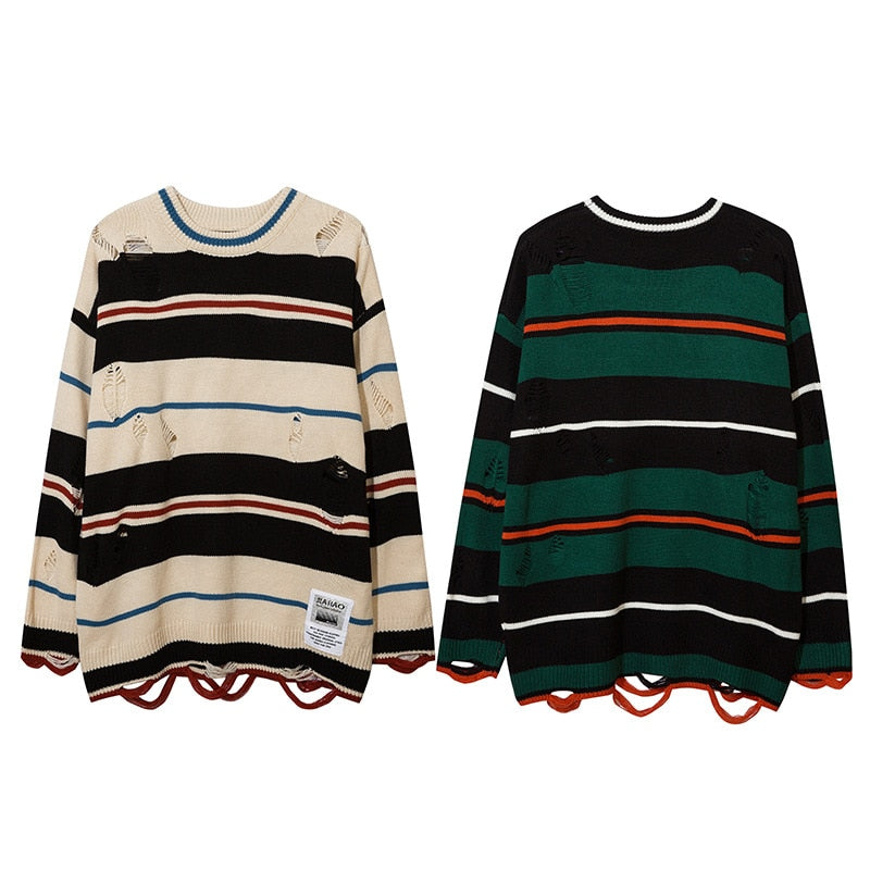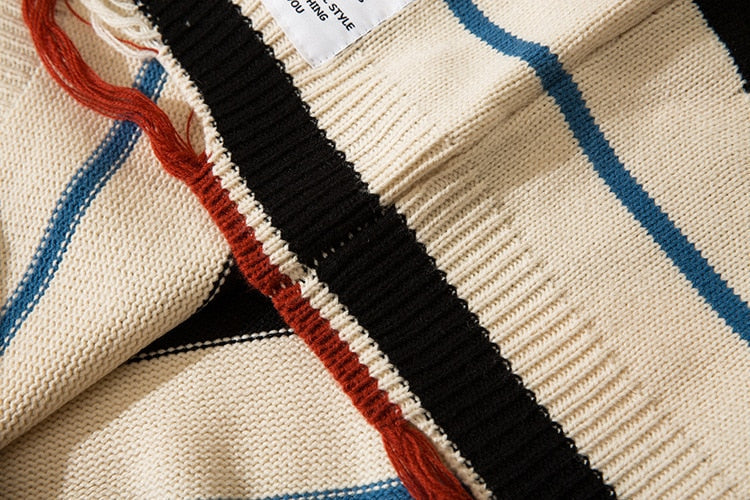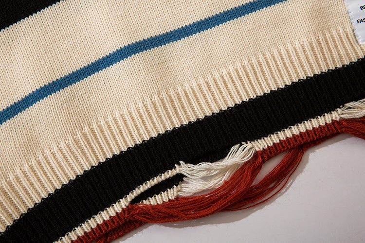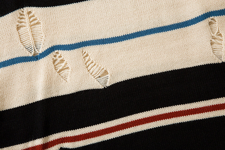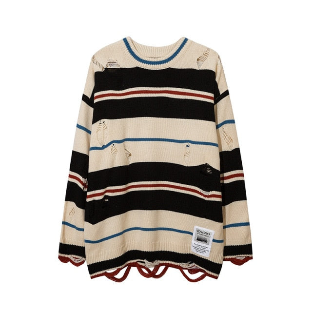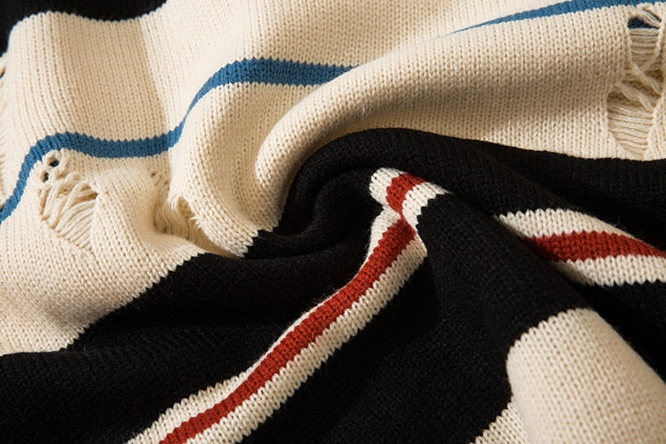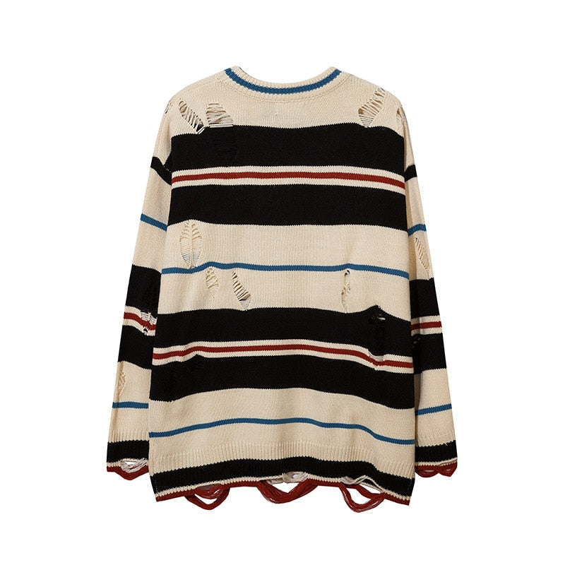 Oversized knit sweater featuring bold horizontal stripes in cream. black. blue. and red. The garment has a deliberately distressed look with intentional holes and frayed edges. particularly noticeable on the cream sections. The hem and cuffs show unique scalloped distressing in red. This sweater combines a classic striped pattern with an edgy. worn-in aesthetic for a grunge-inspired casual style.