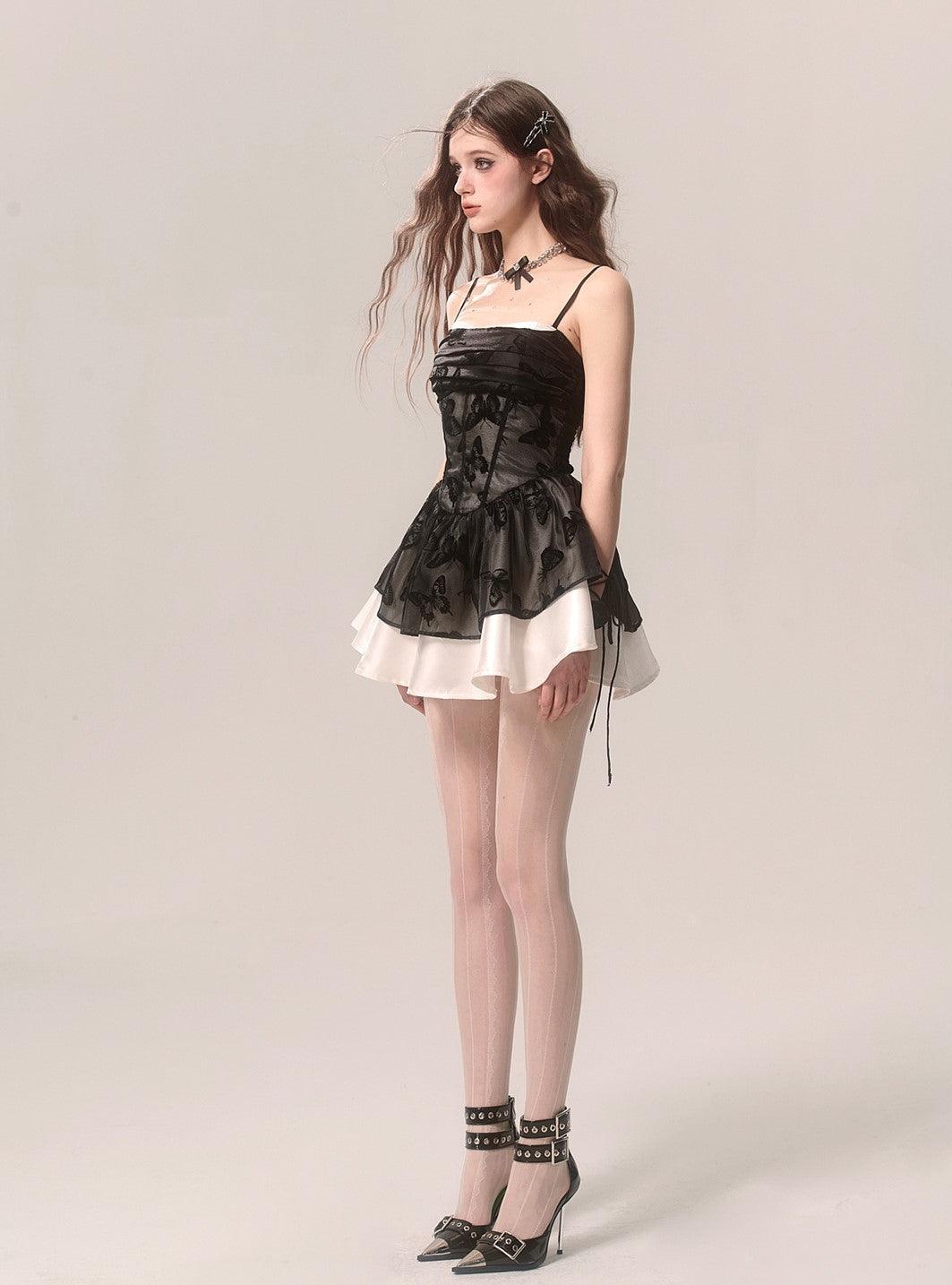 Elegant Black Butterfly Satin Layered Suspender Dress