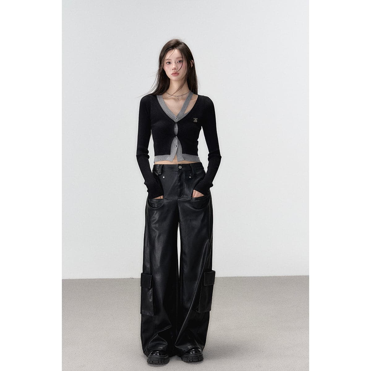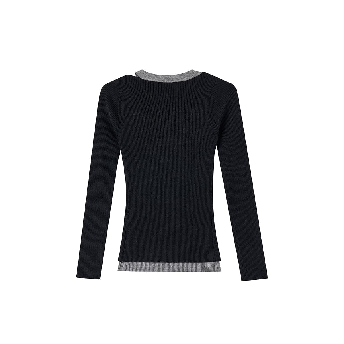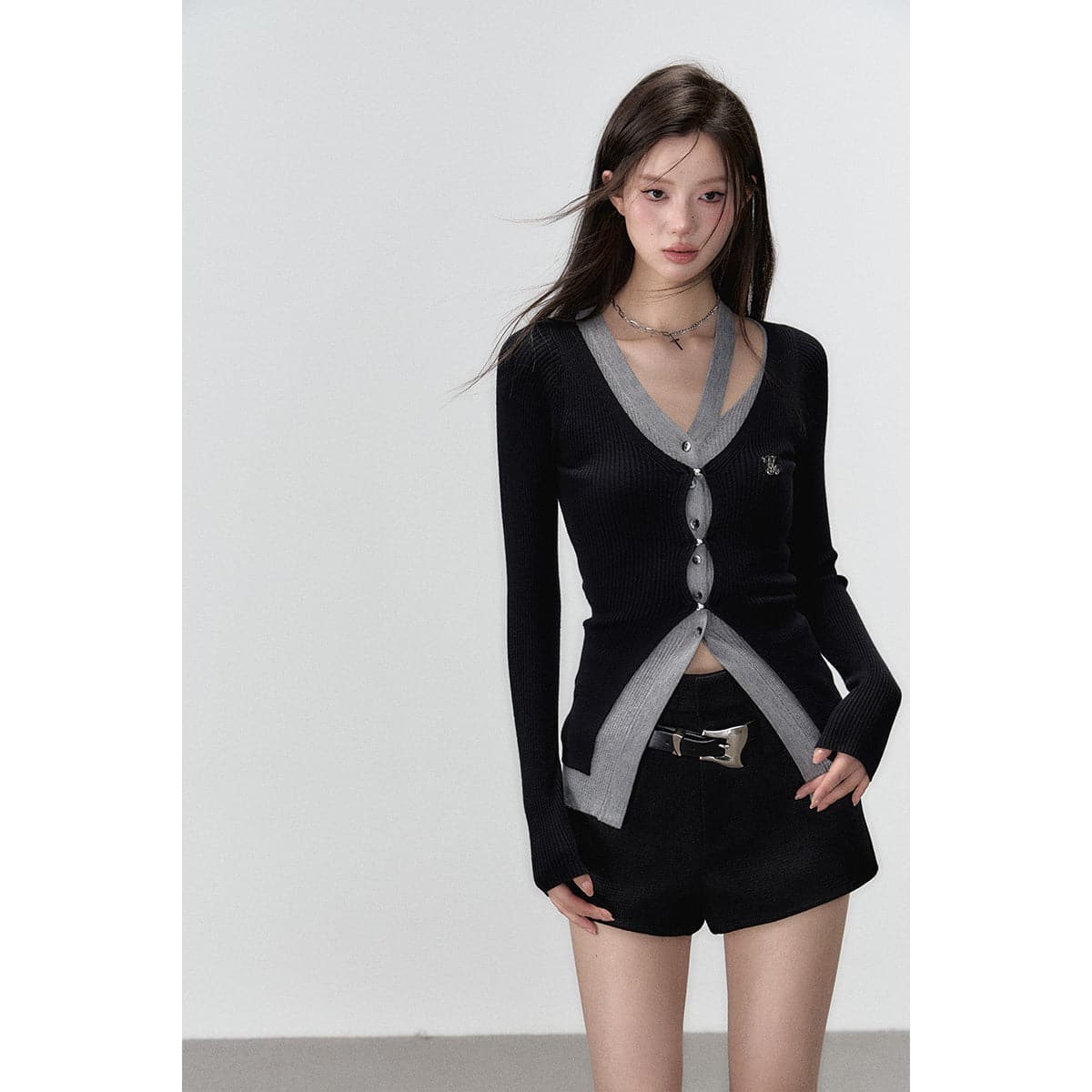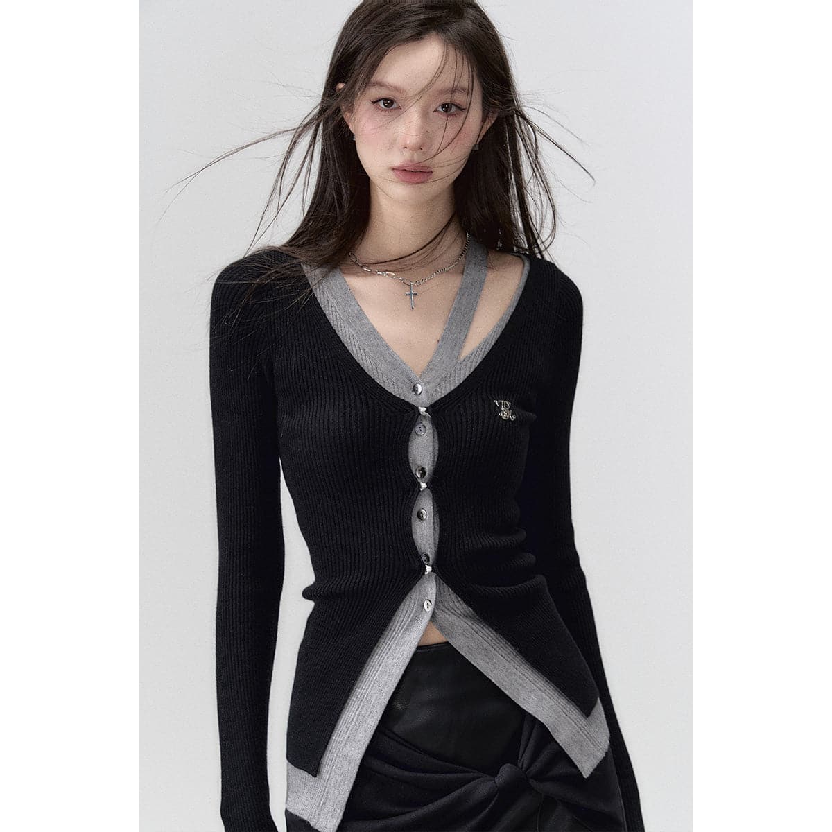 Via Pitti Fake-2-Piece Hollow Out Knit Long Cardigan Black