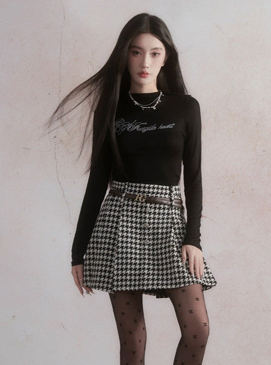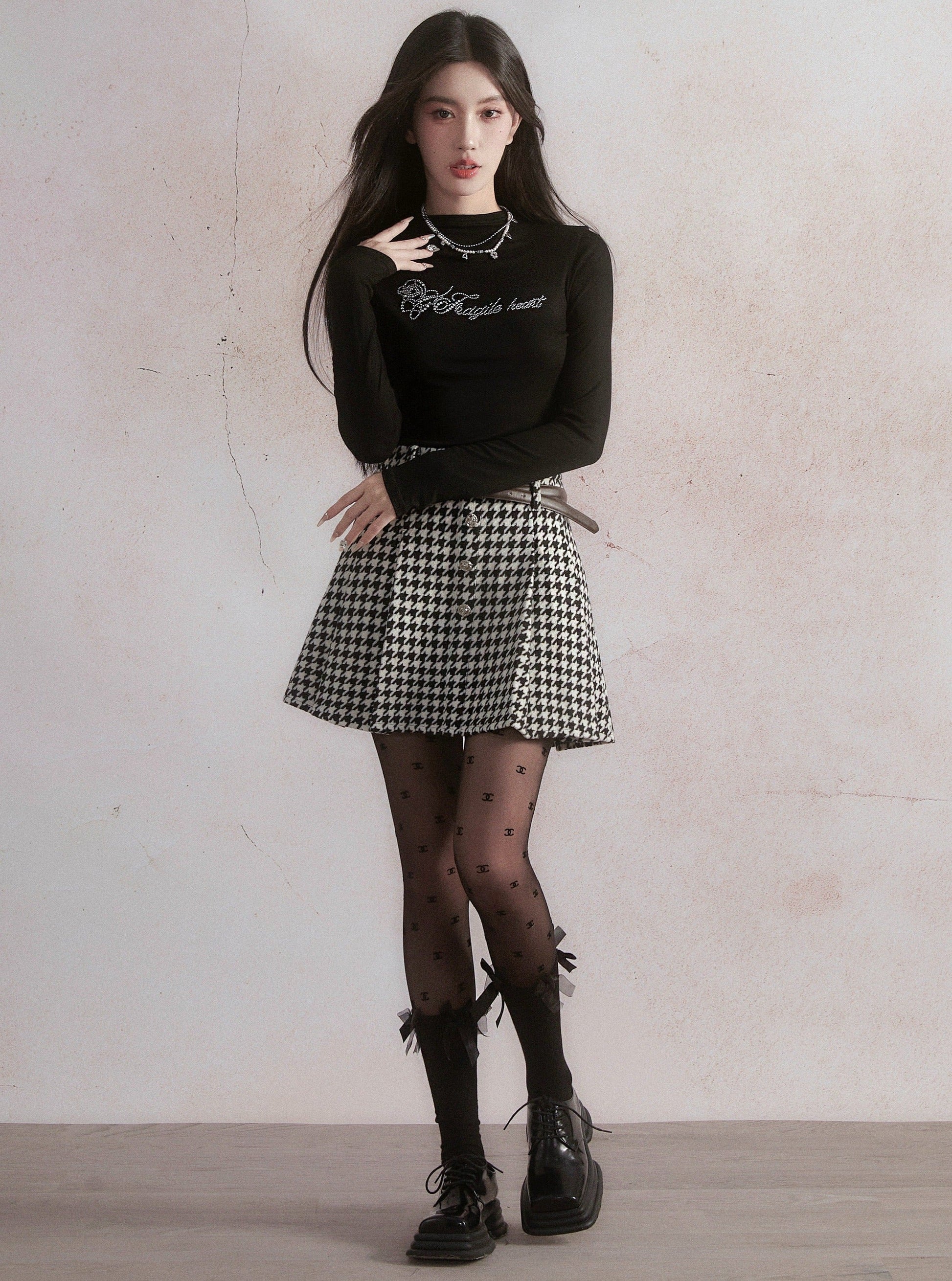 Elegant Contrast: Graphic Crop Top and Houndstooth Skirt Set