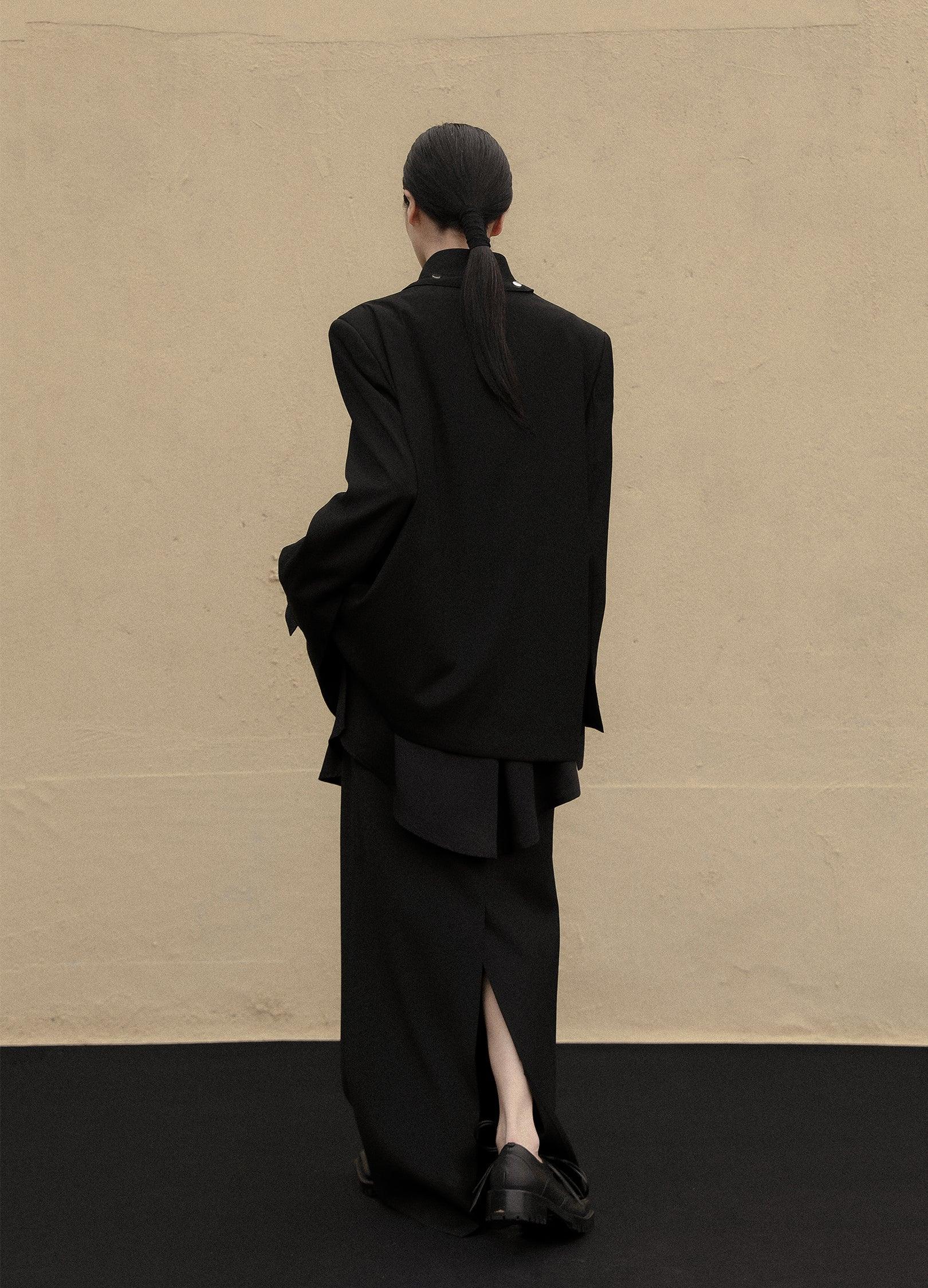 Elevate your style with the Elegant High-Waisted Full Body Skirt from the VAPOUR BLUE AW21 collection. This full body. long skirt features a straight. fitted cut and high waist with a back hem split. effortlessly combining elegance and comfort. Perfectly suited for winter. this unisex piece is made from high-grade. thick cotton and pairs easily with any outfit. Available in black in sizes from Small to Extra Large. See the detailed size chart below for specific measurements.