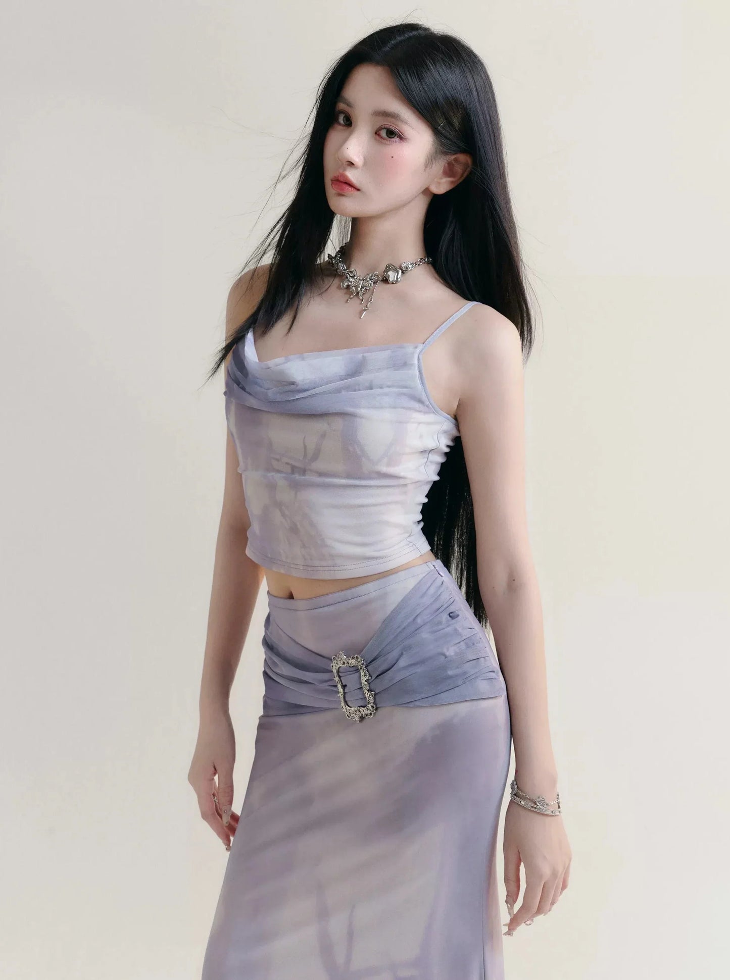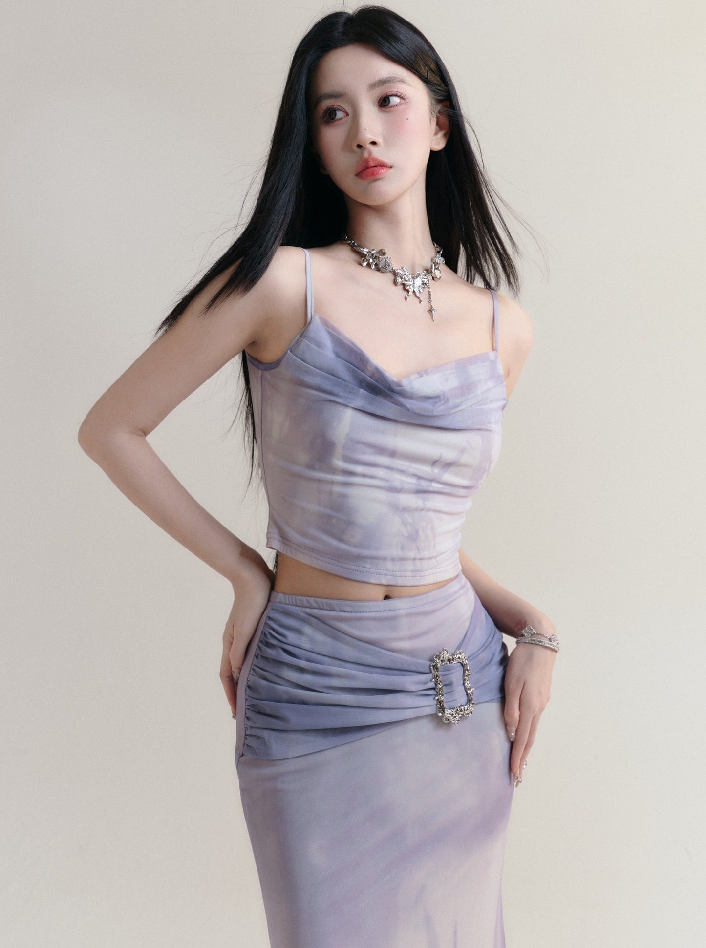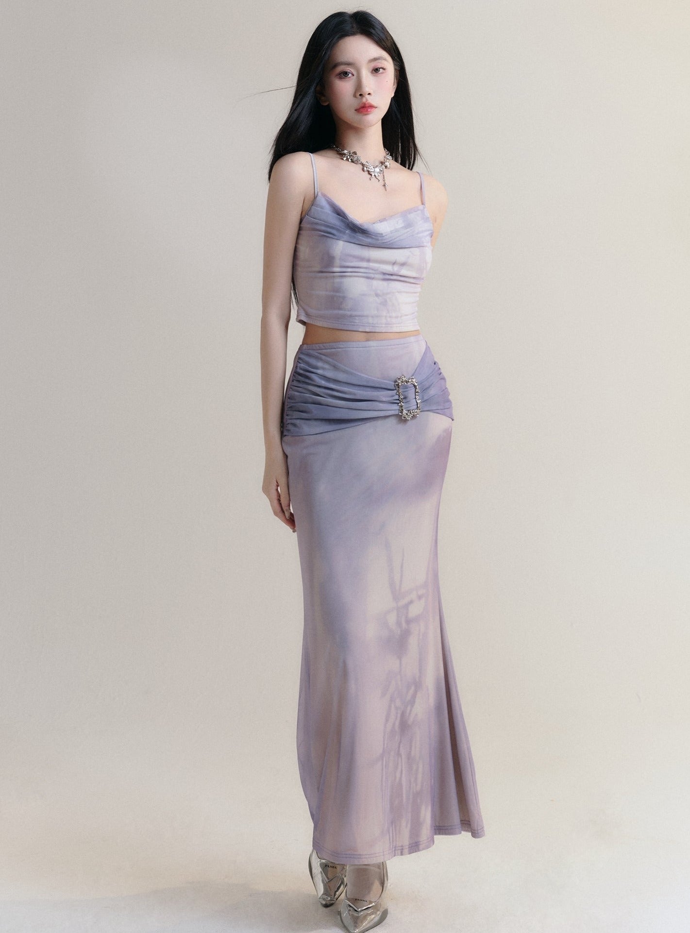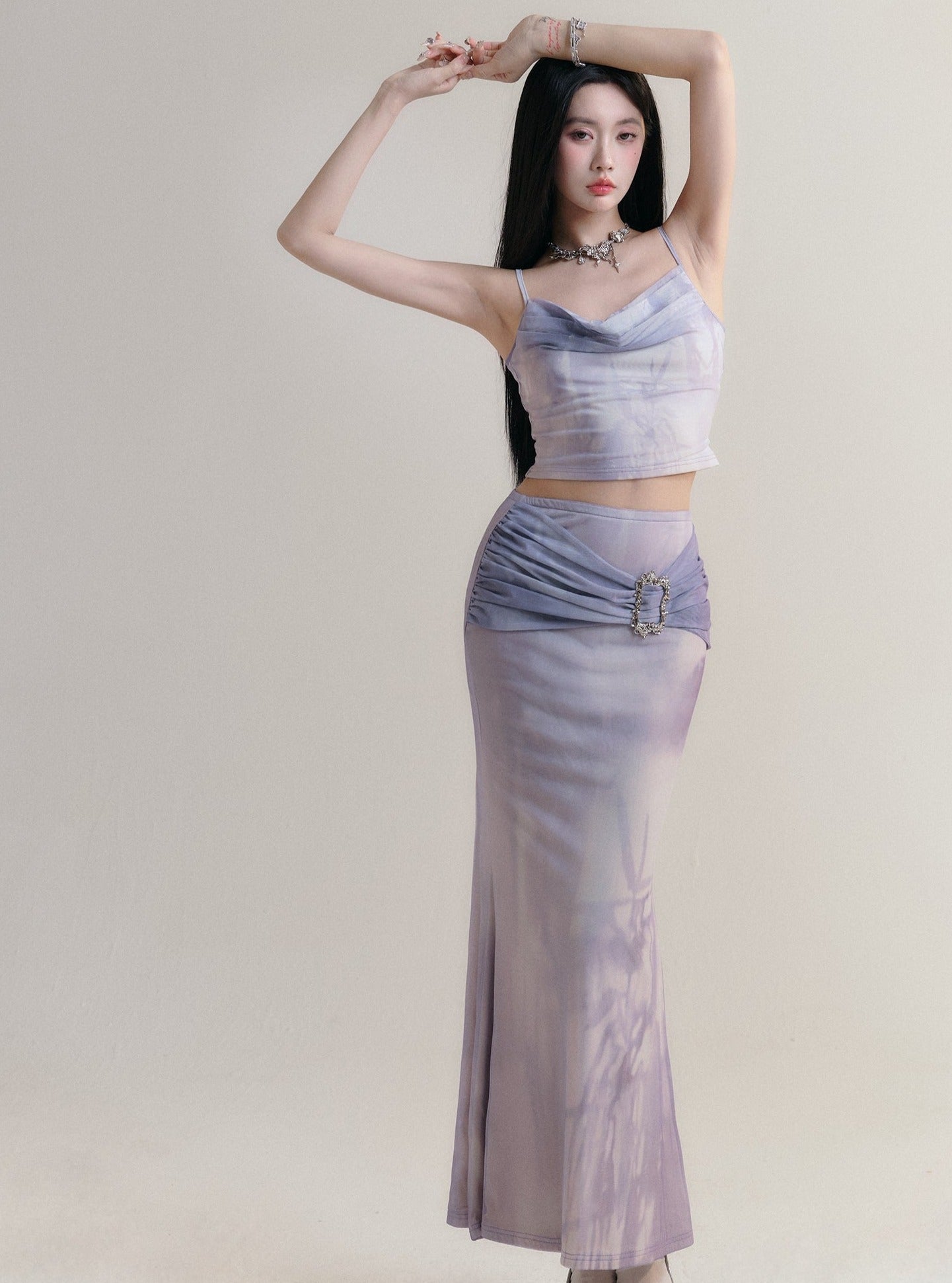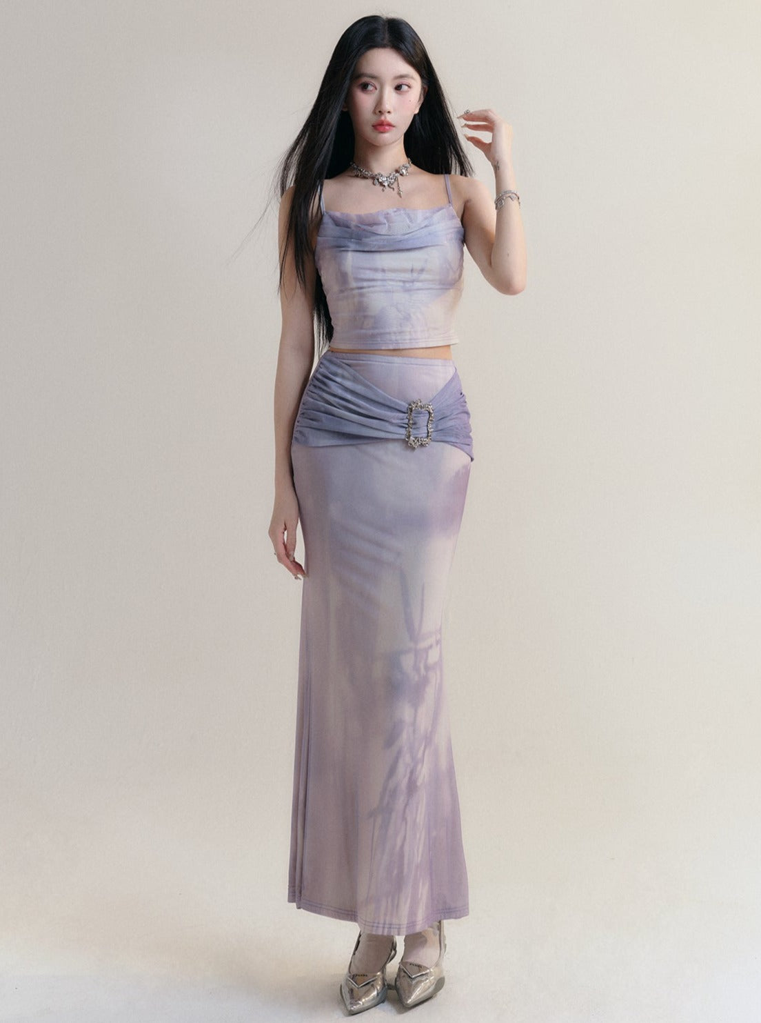 Elegant Lilac Satin Maxi Skirt with Rhinestone Buckle Detail
