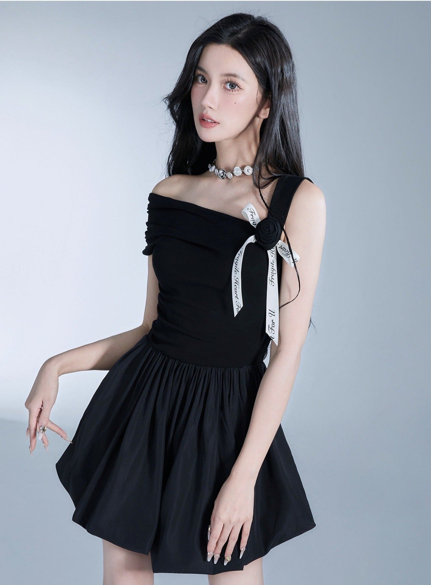 Elegant Off-Shoulder Black Mini Dress with Contrast Bow Detail