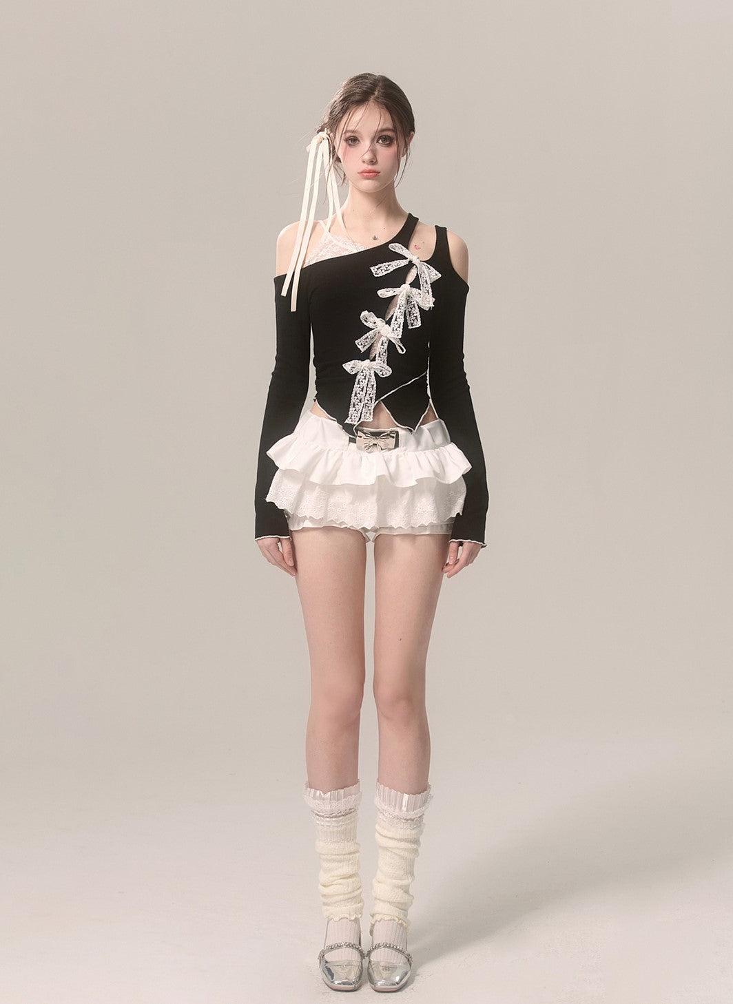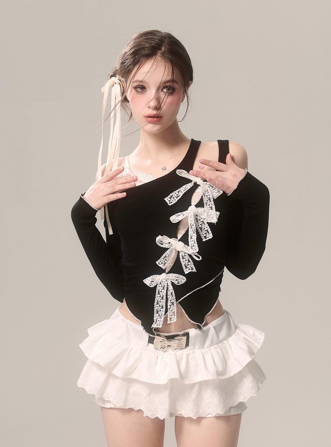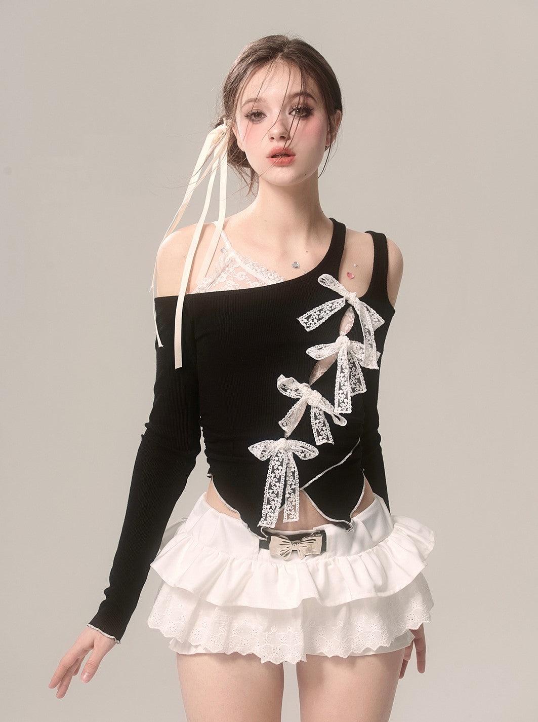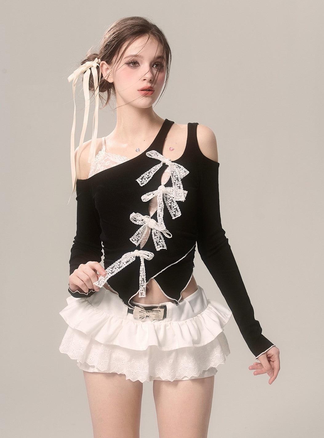 Elegant Off-Shoulder Lace Long Sleeve Bow T-Shirt