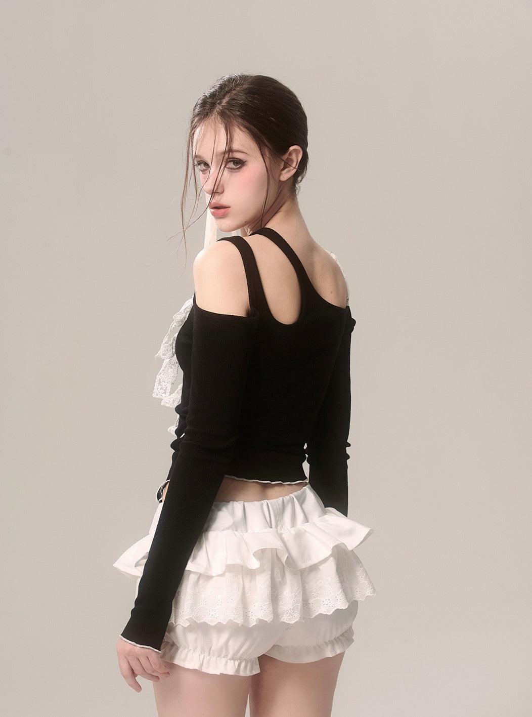 Upgrade your wardrobe with our Elegant Off-Shoulder Lace Long Sleeve Bow T-Shirt in classic black. This chic T-shirt features a delicate lace design. long sleeves. and a stylish bow. perfect for any occasion.