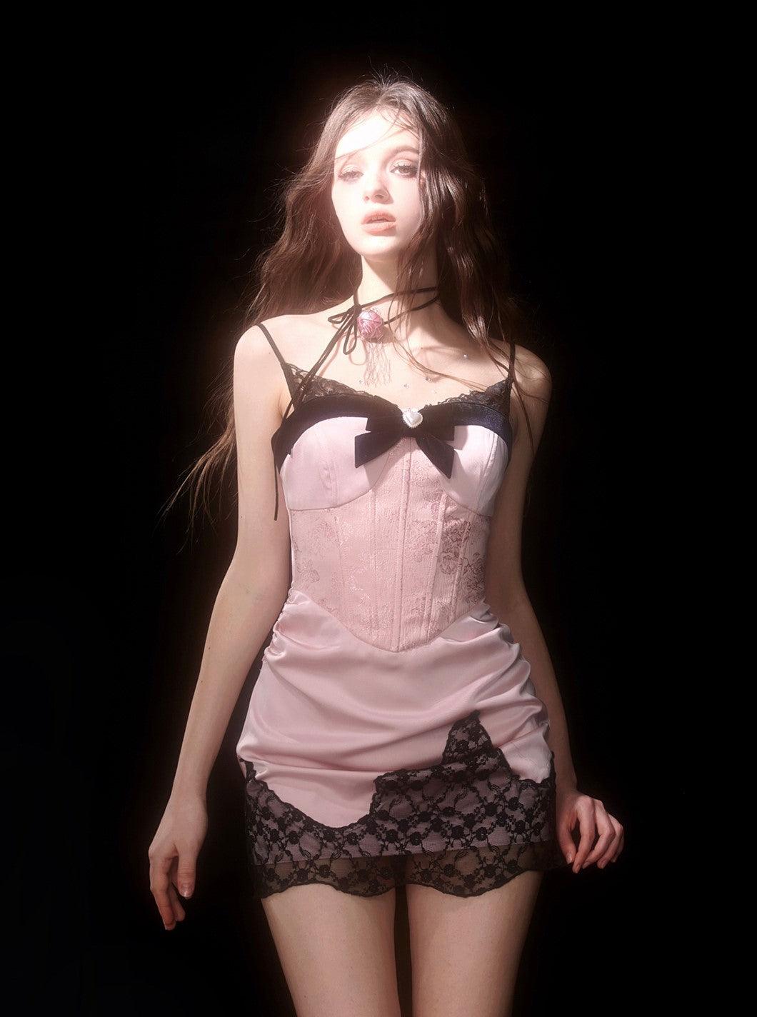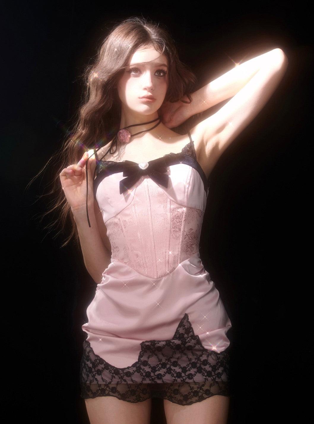 Elegant Pink Jacquard Lace Suspender Mini Dress