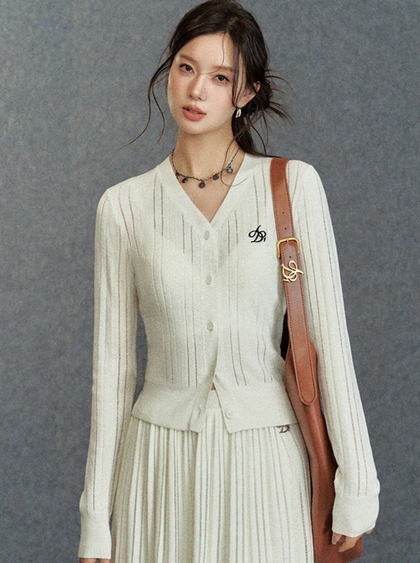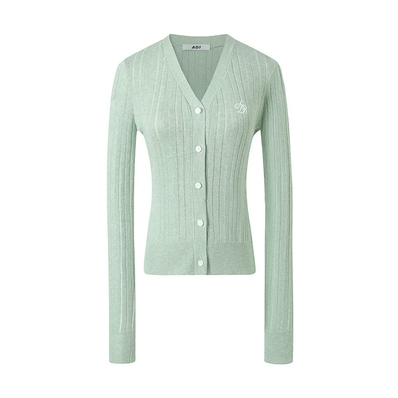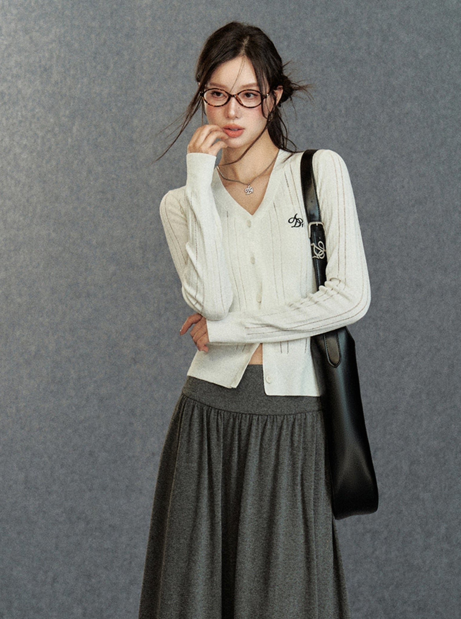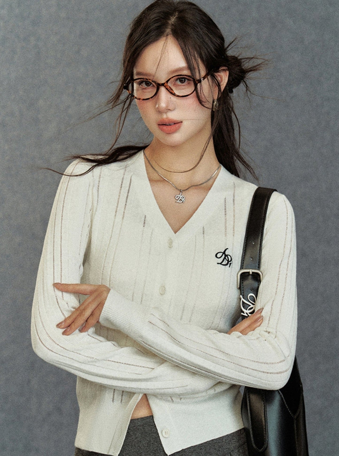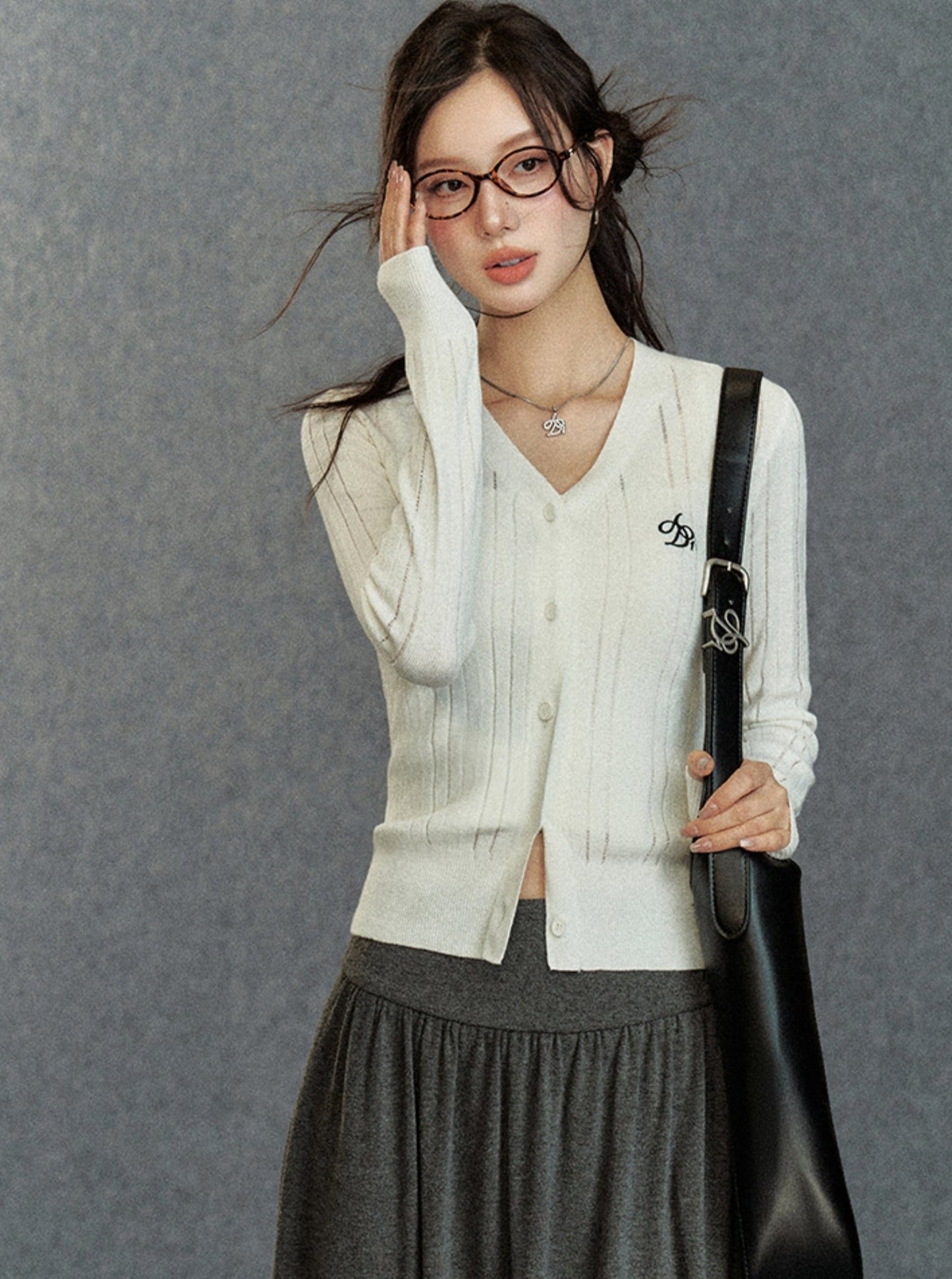 Elegant Ribbed Cardigan: Classic V-Neck with Signature Embroidery