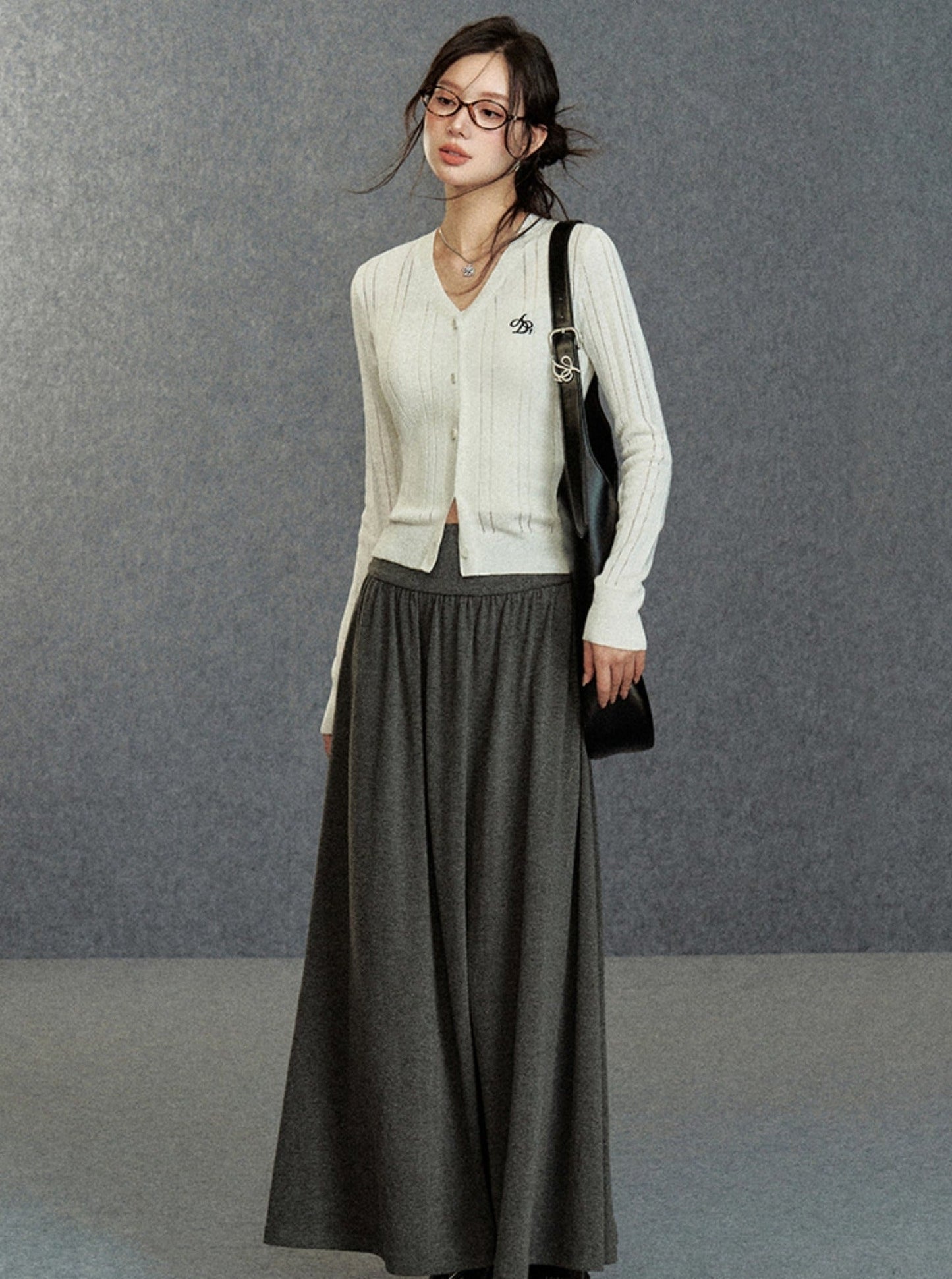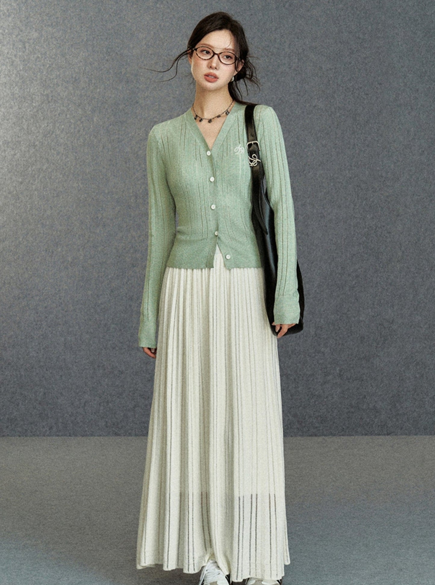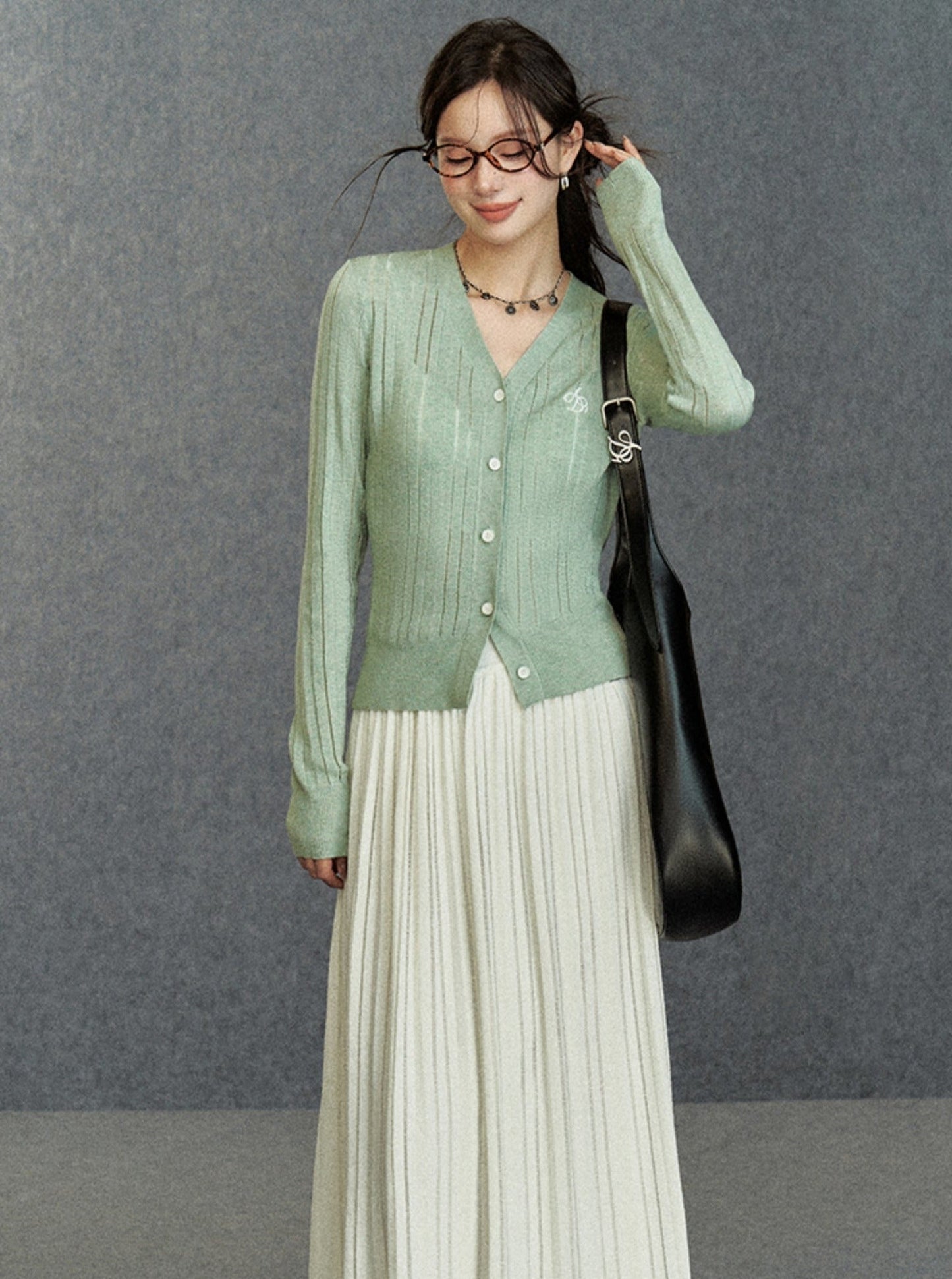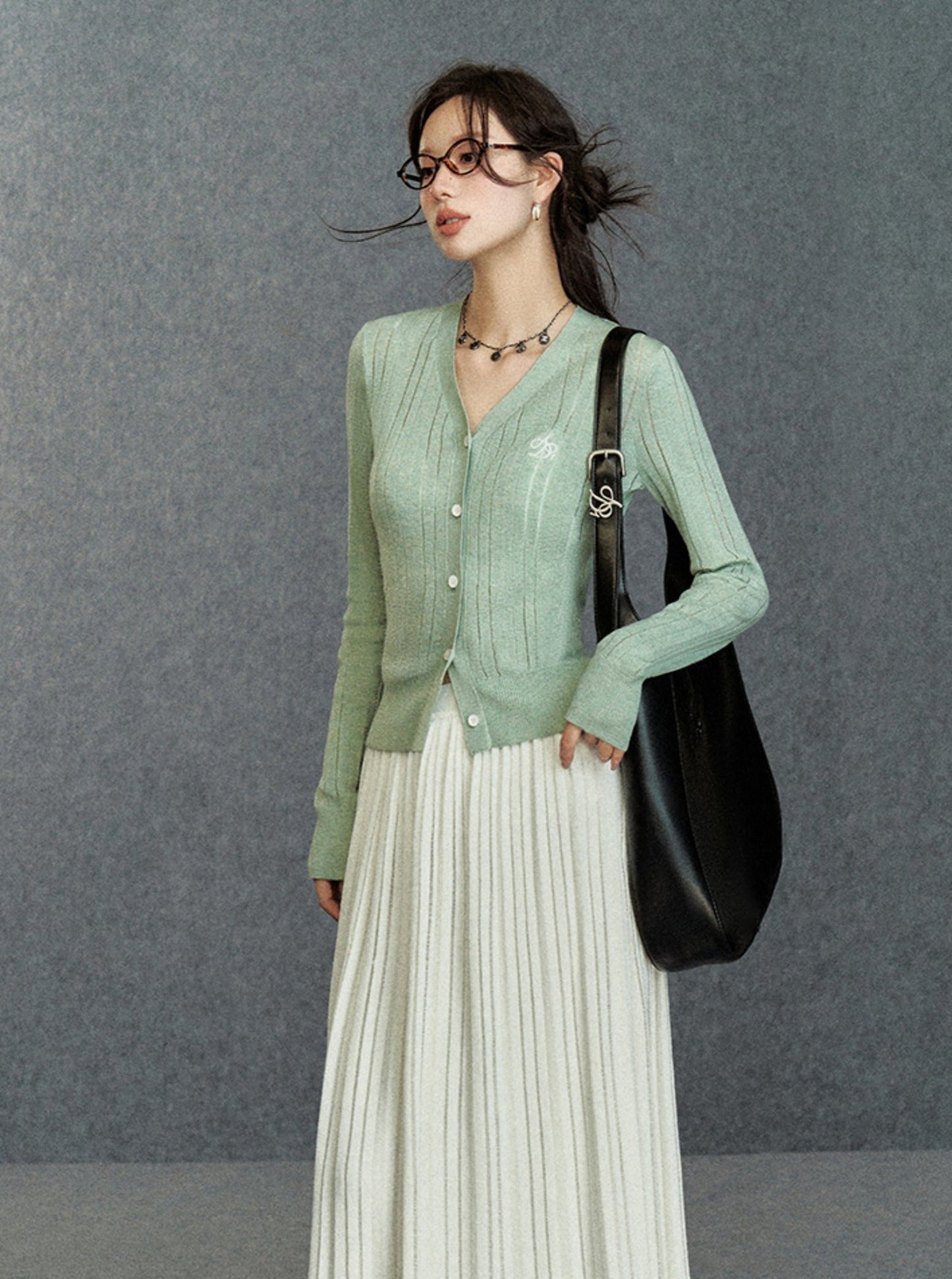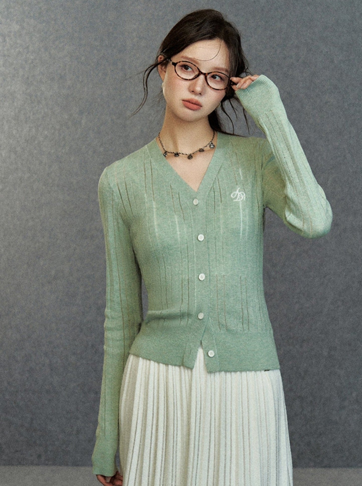 Elegant Ribbed Cardigan: Classic V-Neck with Signature Embroidery