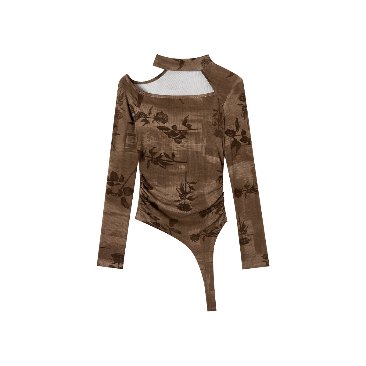 Via Pitti Hollow High Collar Rose Printed Top Brown