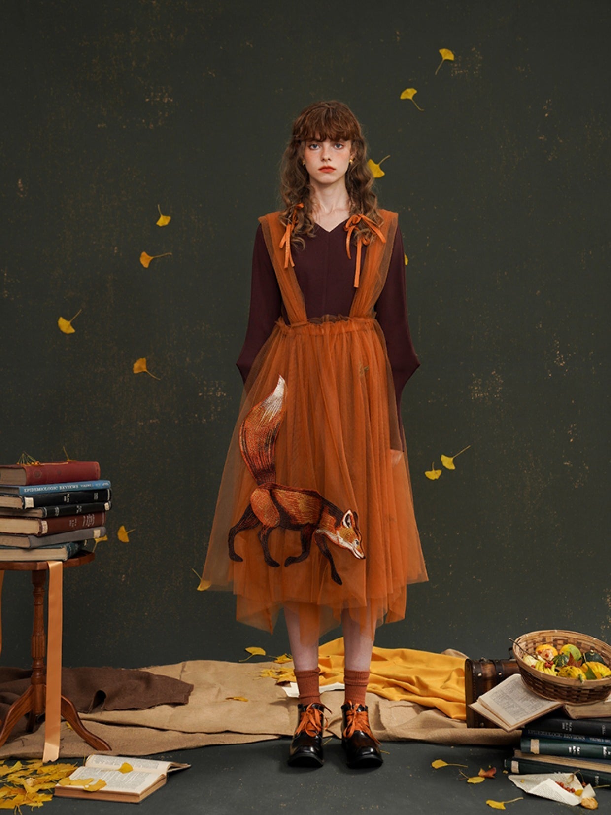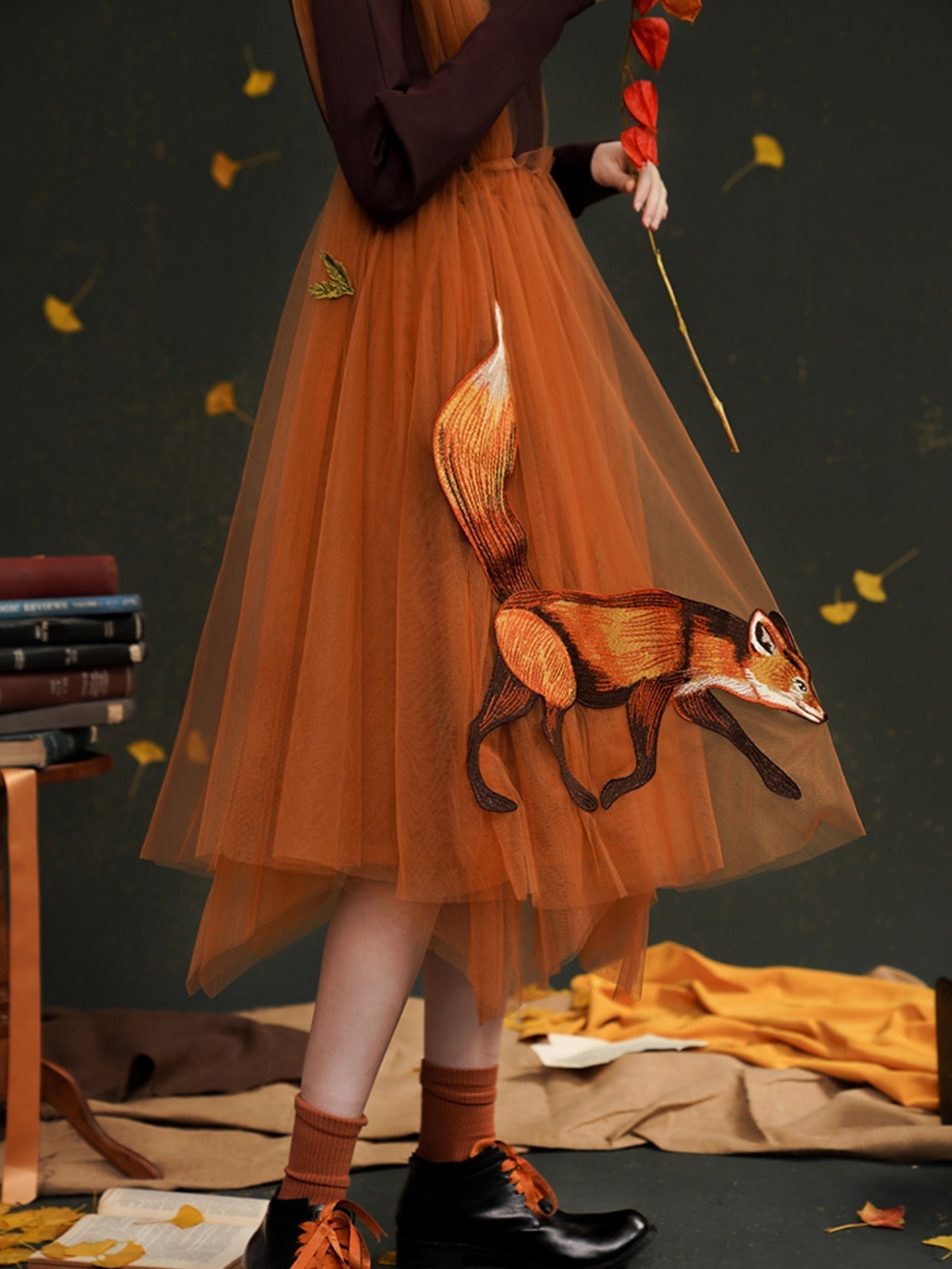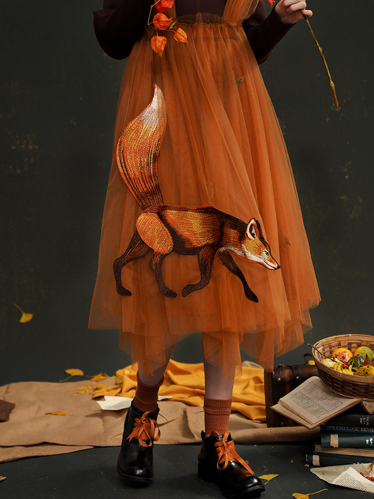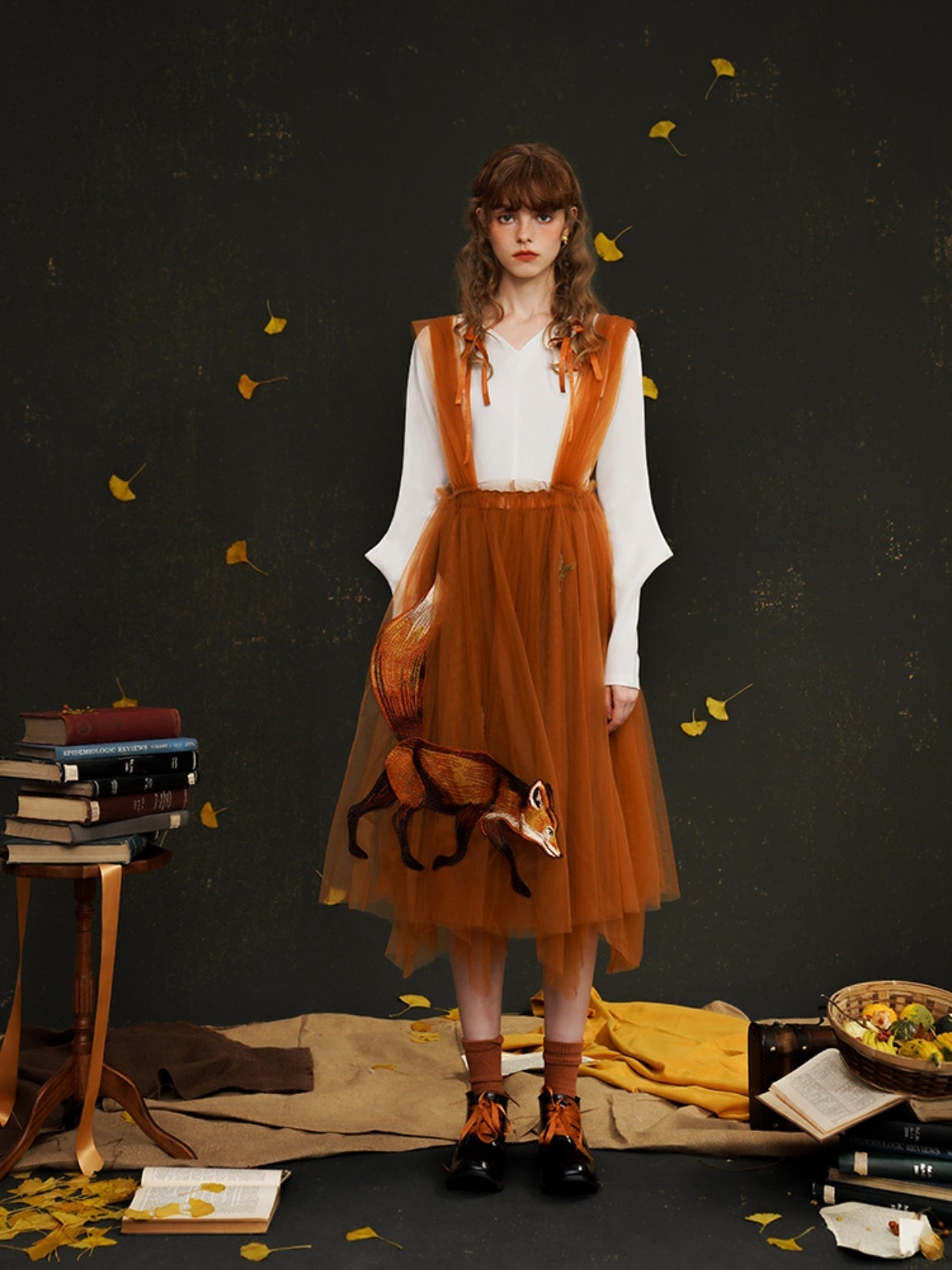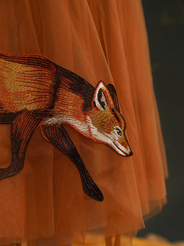 Step into a fairytale world with our Whimsical Nordic Fox Embroidered Chiffon Strap Skirt. as if you have leapt into a Nordic fairytale picture book. This enchanting skirt features an oil painting-style embroidered red fox. adding a touch of artistic elegance to your wardrobe. The lightweight chiffon fabric creates a soft. flowing silhouette. giving an ethereal impression. Be captivated by the fox's sharp yet endearing eyes. dynamic stride. and the beautiful fur that seems to be bathed in the glow of the setting sun.