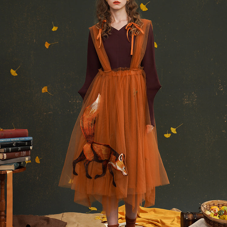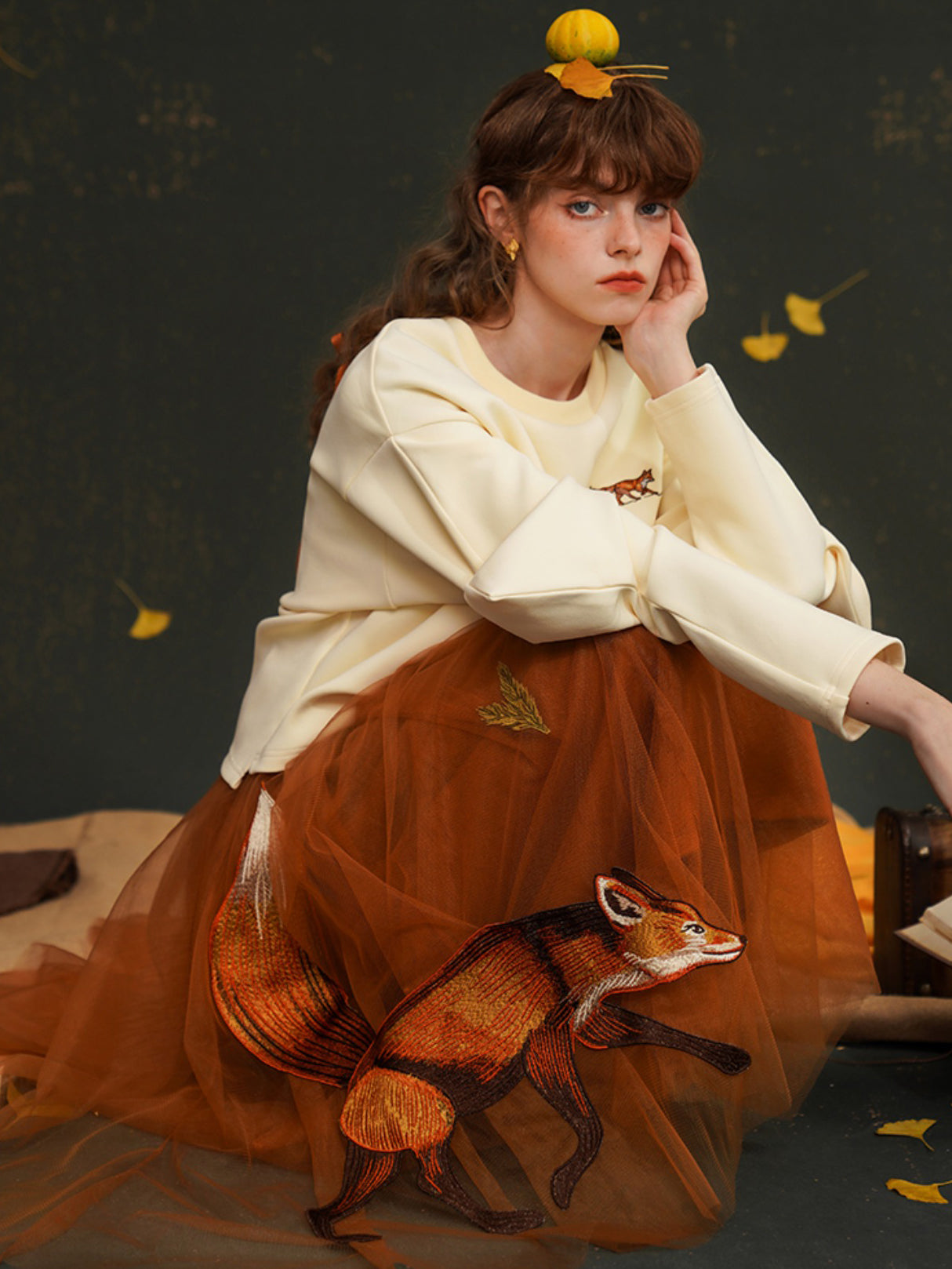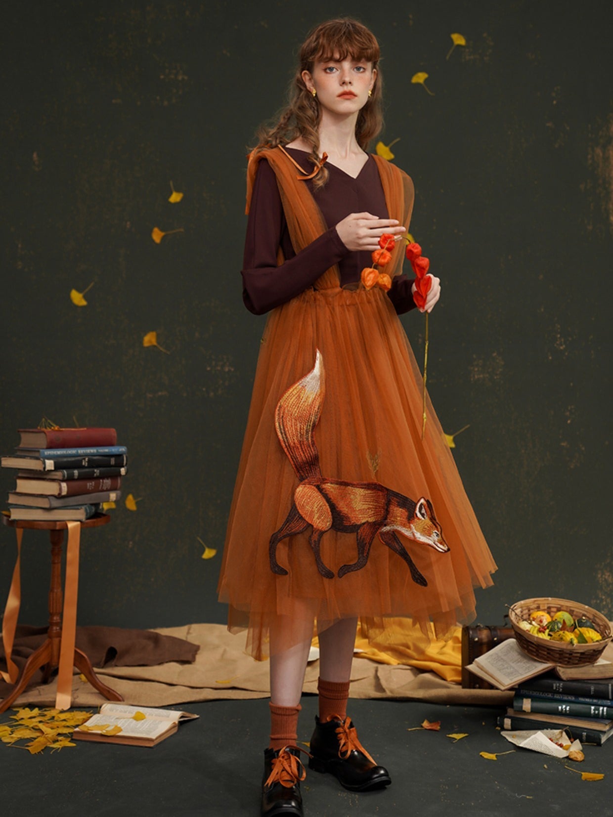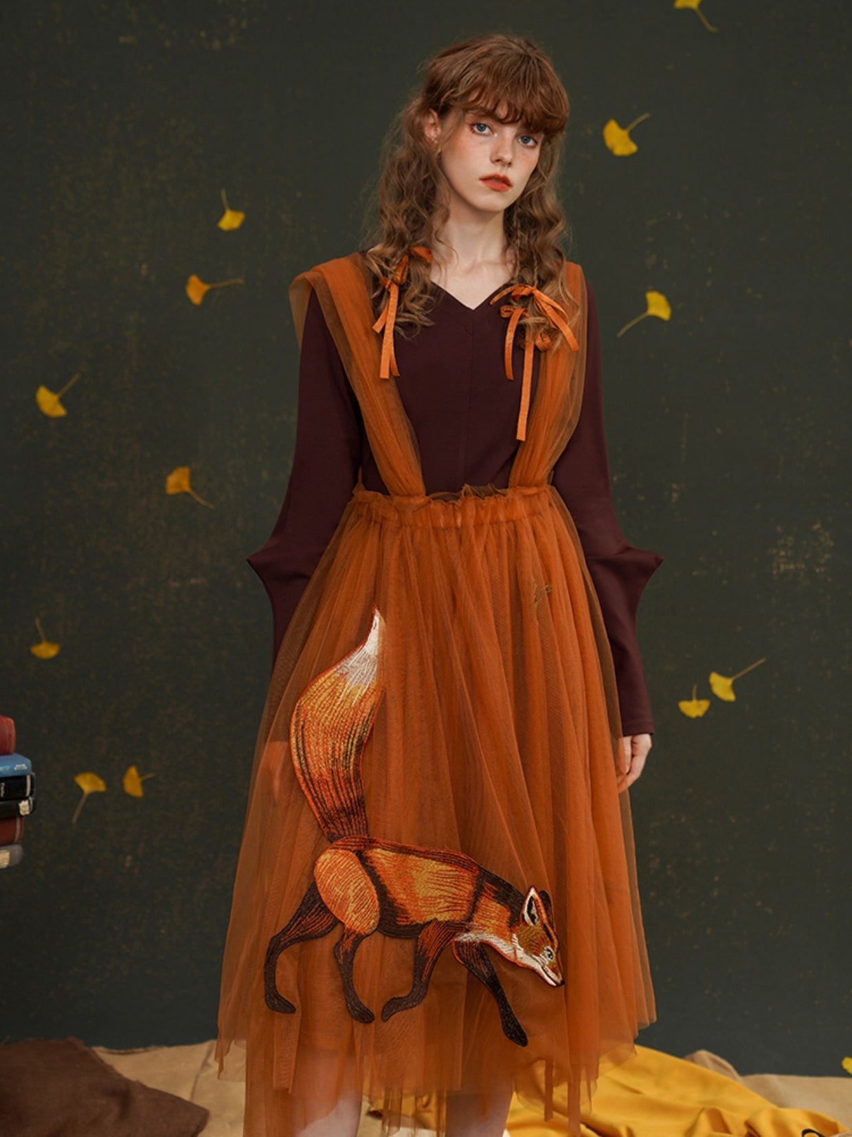 Step into a fairytale world with our Whimsical Nordic Fox Embroidered Chiffon Strap Skirt. as if you have leapt into a Nordic fairytale picture book. This enchanting skirt features an oil painting-style embroidered red fox. adding a touch of artistic elegance to your wardrobe. The lightweight chiffon fabric creates a soft. flowing silhouette. giving an ethereal impression. Be captivated by the fox's sharp yet endearing eyes. dynamic stride. and the beautiful fur that seems to be bathed in the glow of the setting sun.