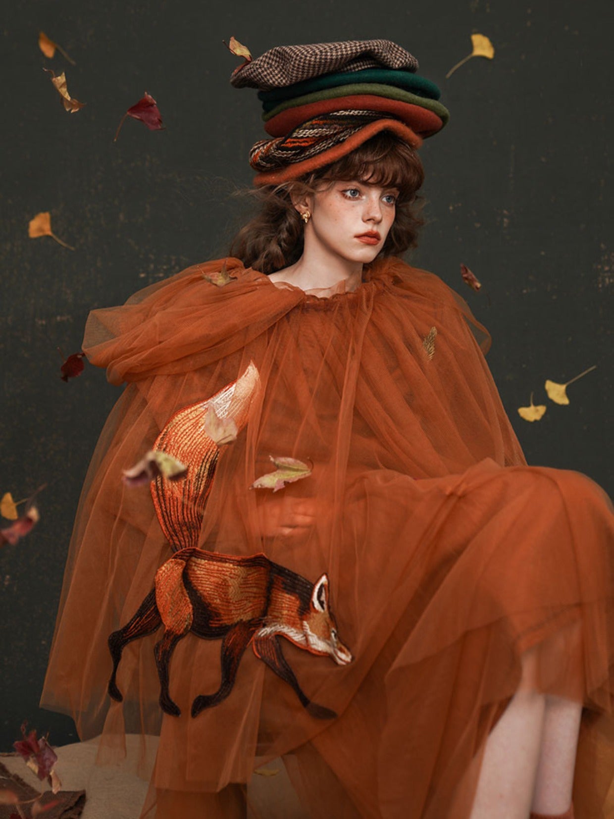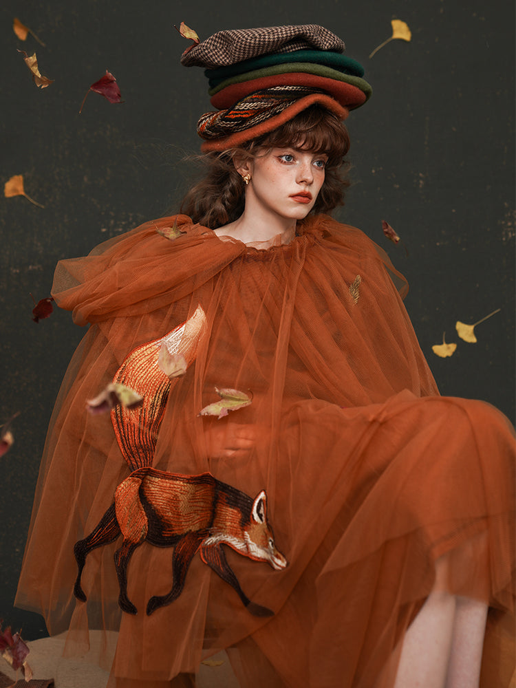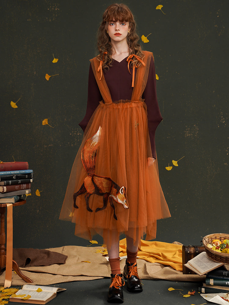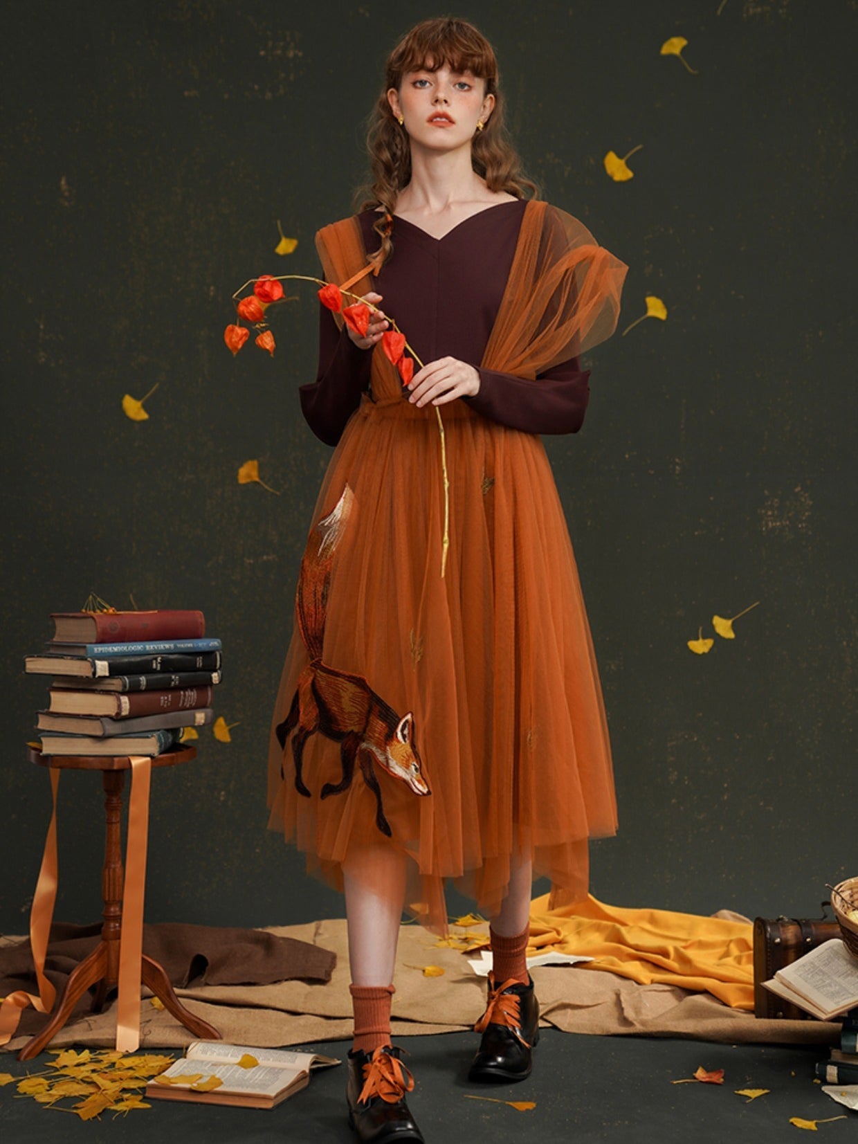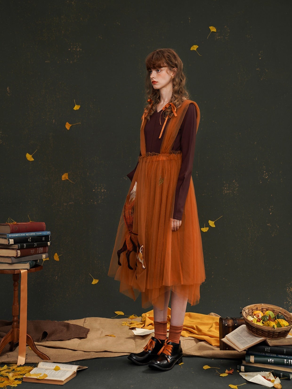 Step into a fairytale world with our Whimsical Nordic Fox Embroidered Chiffon Strap Skirt. as if you have leapt into a Nordic fairytale picture book. This enchanting skirt features an oil painting-style embroidered red fox. adding a touch of artistic elegance to your wardrobe. The lightweight chiffon fabric creates a soft. flowing silhouette. giving an ethereal impression. Be captivated by the fox's sharp yet endearing eyes. dynamic stride. and the beautiful fur that seems to be bathed in the glow of the setting sun.