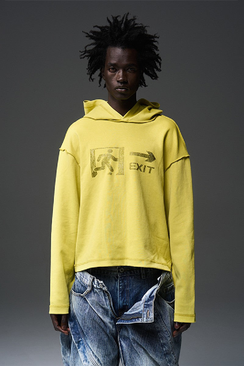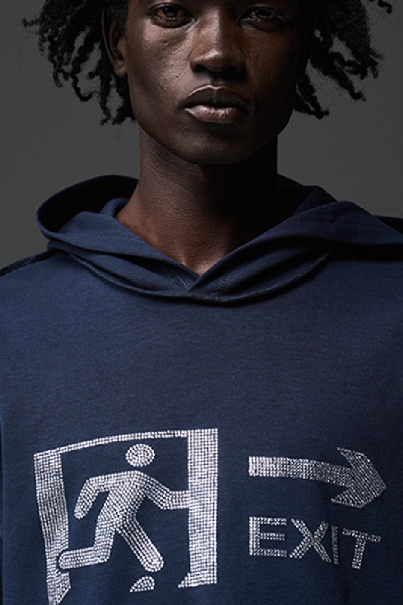 Emergency Exit Hoodie by BLIND/NO PLAN from the Spring/Summer '24 collection. This black/blue and yellow hoodie. made of 80% cotton and 20% polyester. offers an oversized fit for ultimate comfort. Perfect for casual wear. it can be machine or hand washed under 40°C. with no bleach. and should be ironed reversed at low temperature. The male model is wearing size L. standing at 1.85 m (6'1'') and 58.5 kg (129 lbs).
