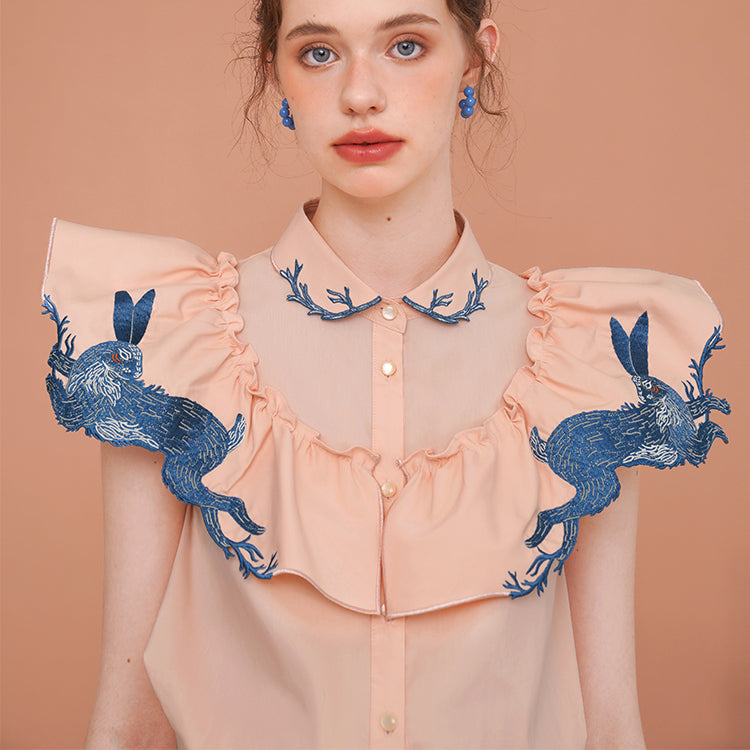 Running hares embroidered on the blouse evoke scenes of rabbits dashing through meadows. adding an element of fantasy inspired by the rabbits living peacefully under the moonlit night sky or in the serene forest. The blouse is richly adorned with bold ruffles from the shoulders down to the chest. creating a striking and elegant look.