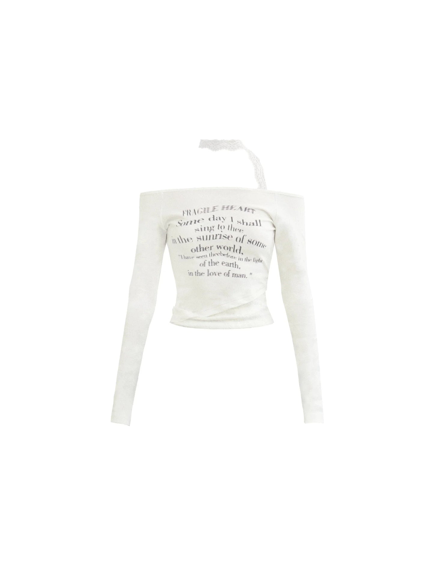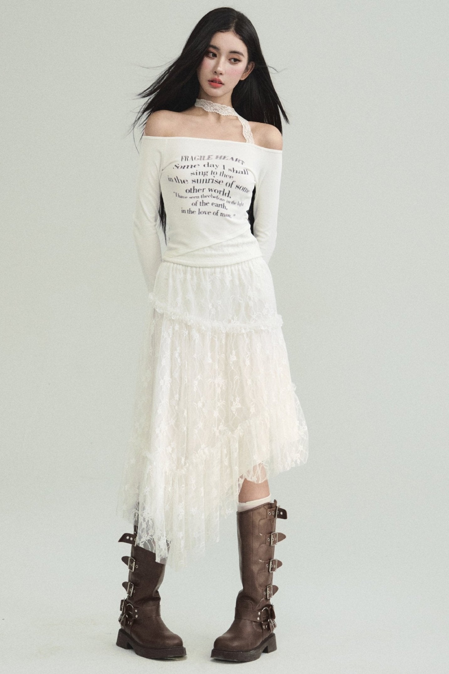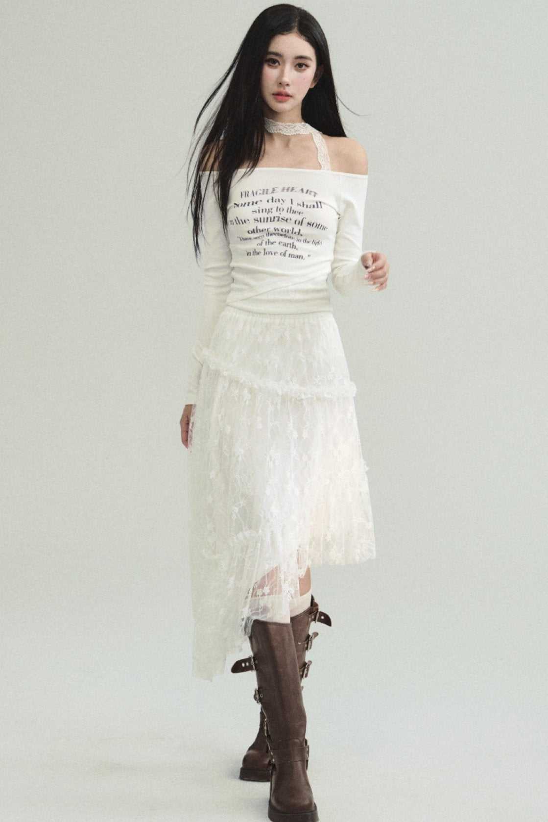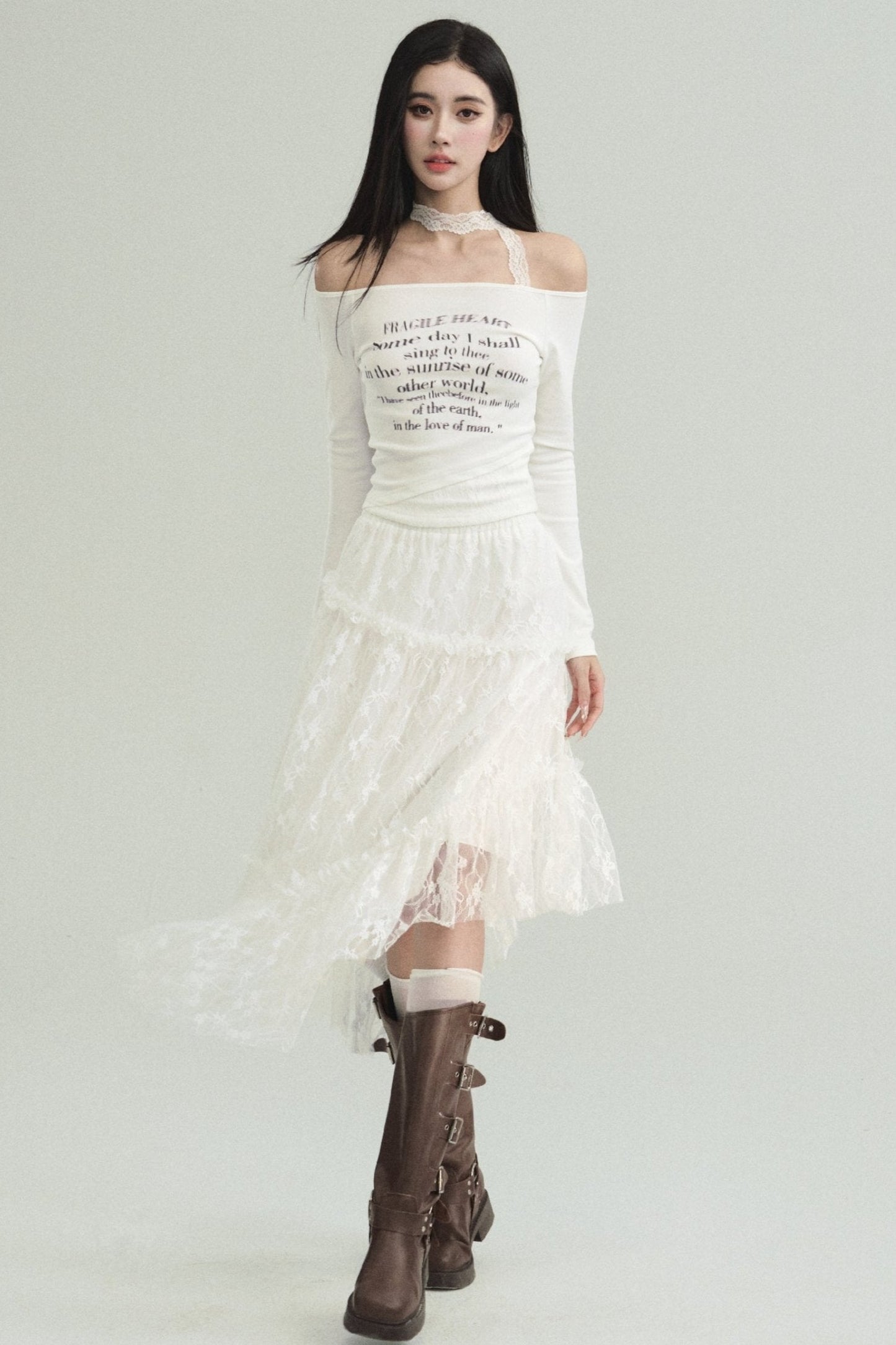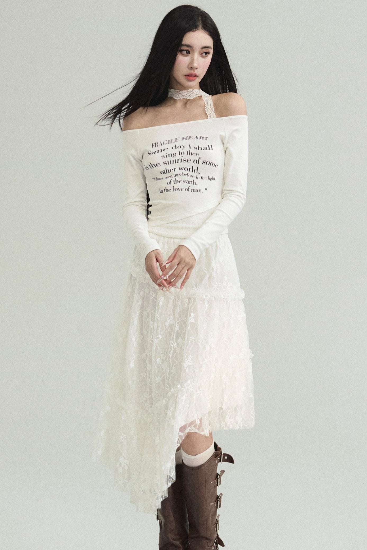 Ethereal Elegance Set: Off-Shoulder Poetic Print Crop Top & Asymmetric Lace Midi Skirt