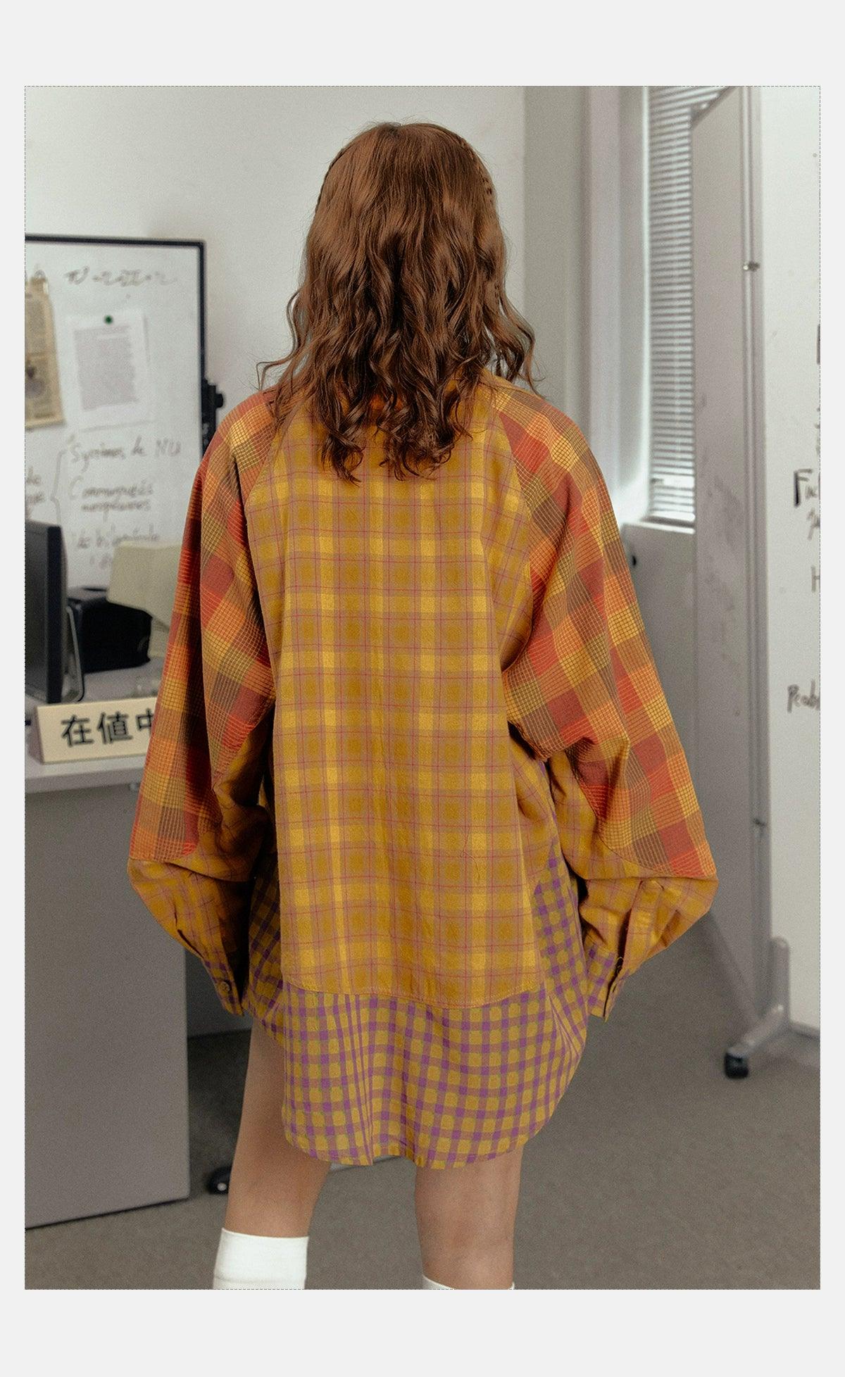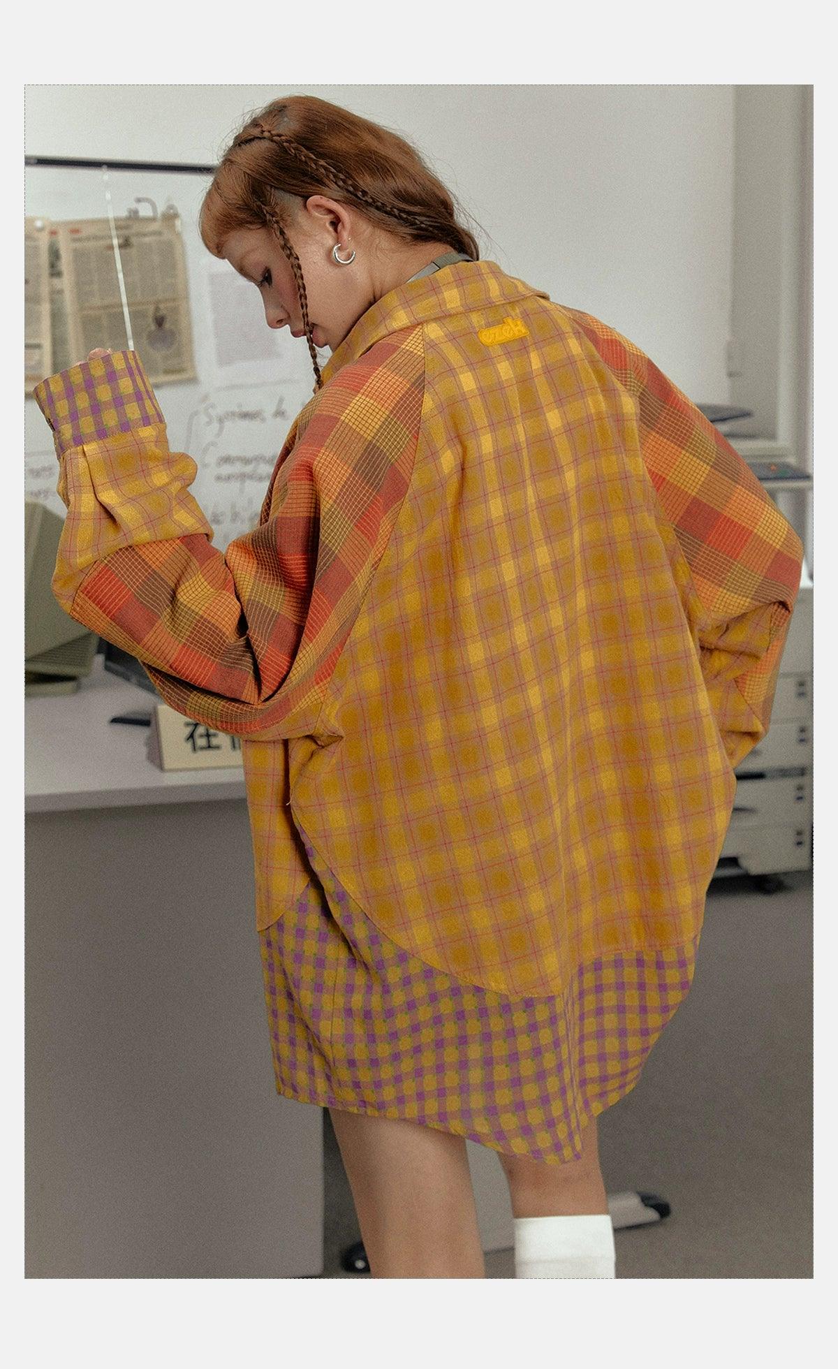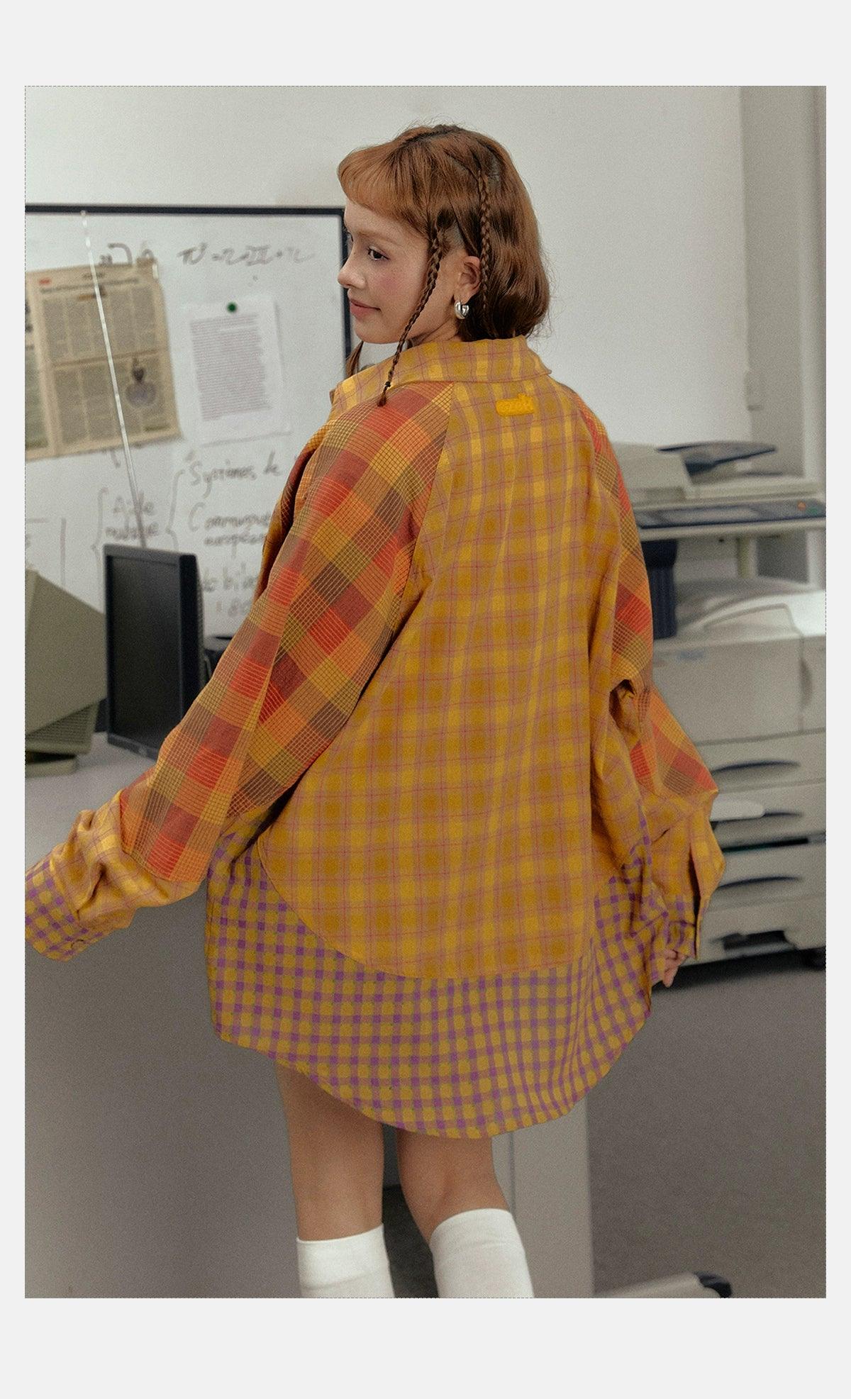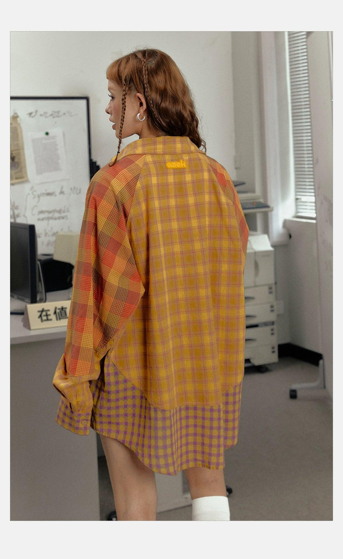 Ezek Mustard Plaid Oversized Shirt Jacket - Unisex Colorblock Flannel Shacket With Purple Checks