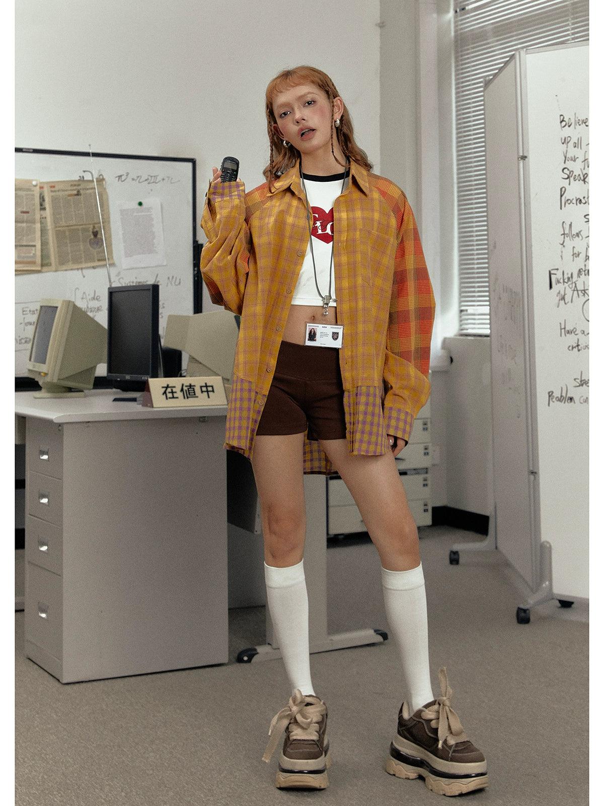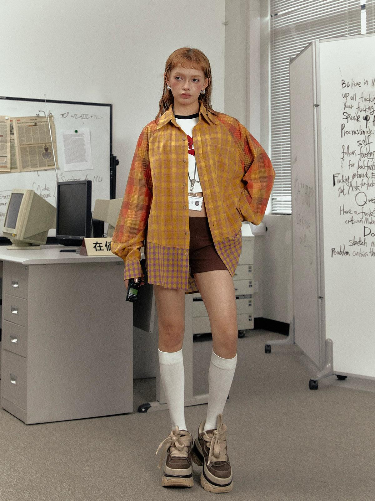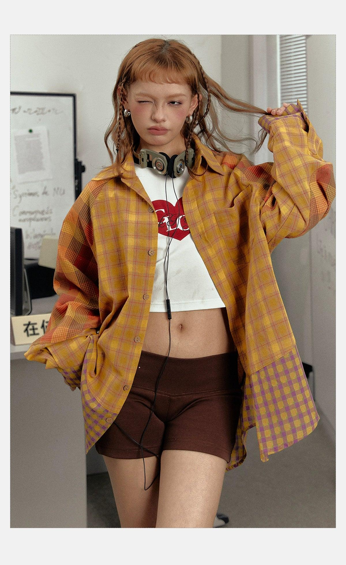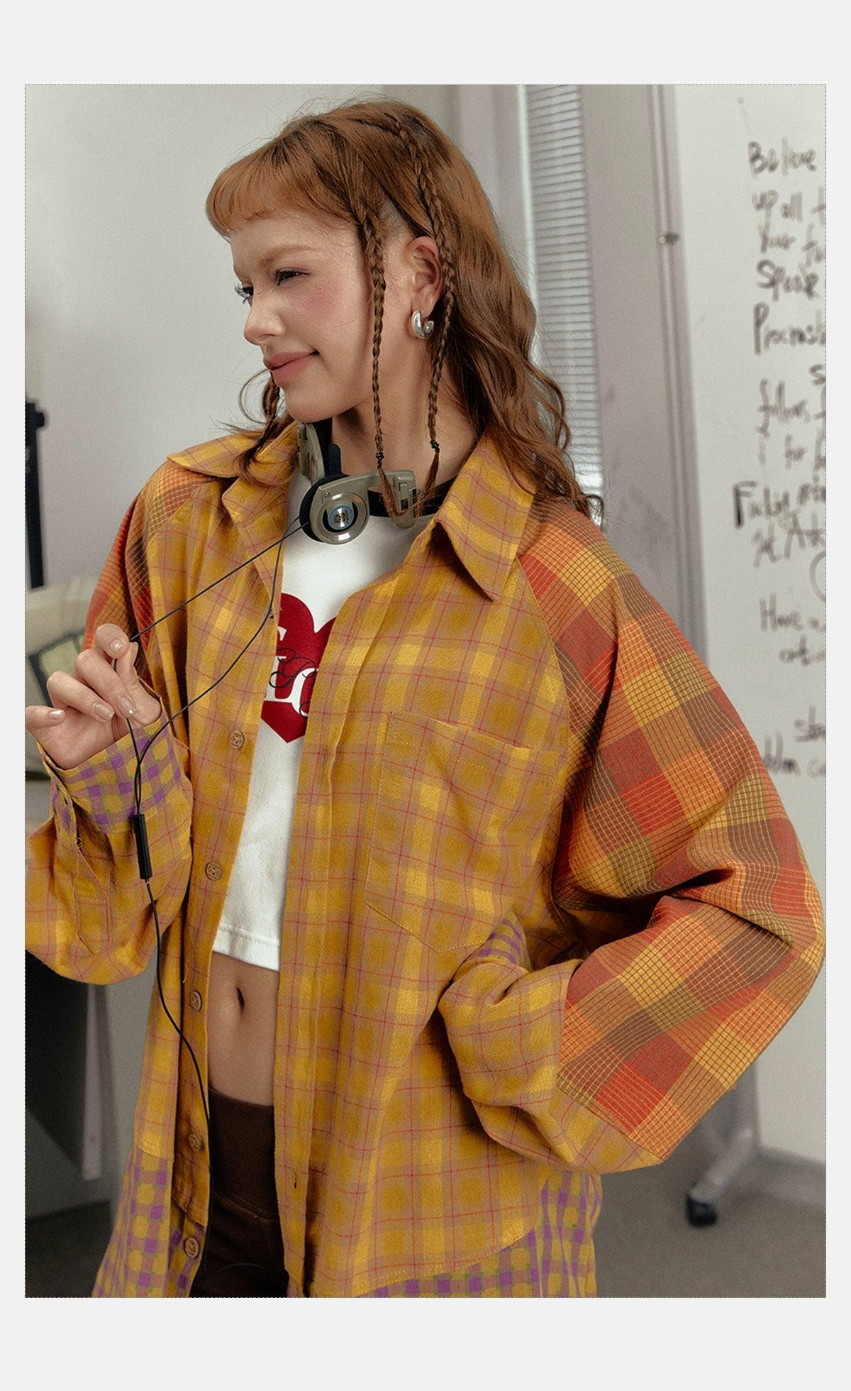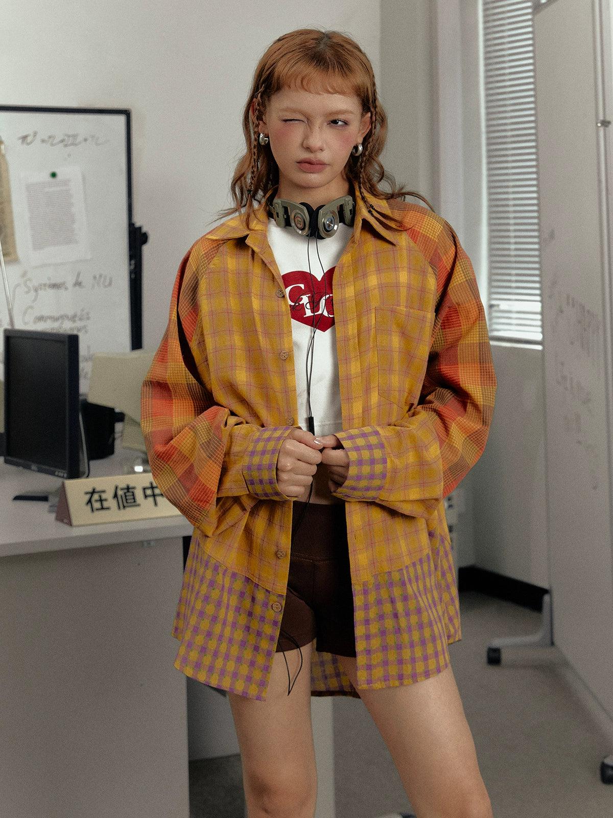Ezek Mustard Plaid Oversized Shirt Jacket - Unisex Colorblock Flannel Shacket With Purple Checks