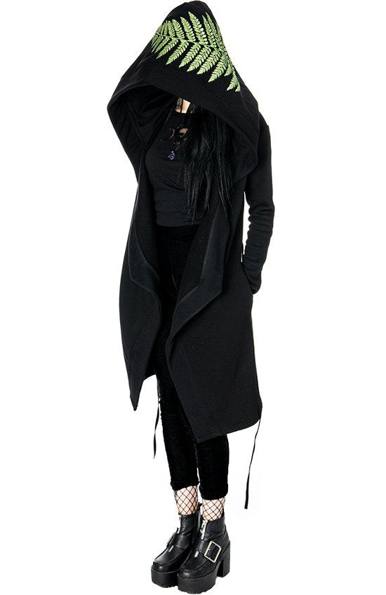 A beautiful. long and witchy draped hoodie which can be tied at the waist or just left open.