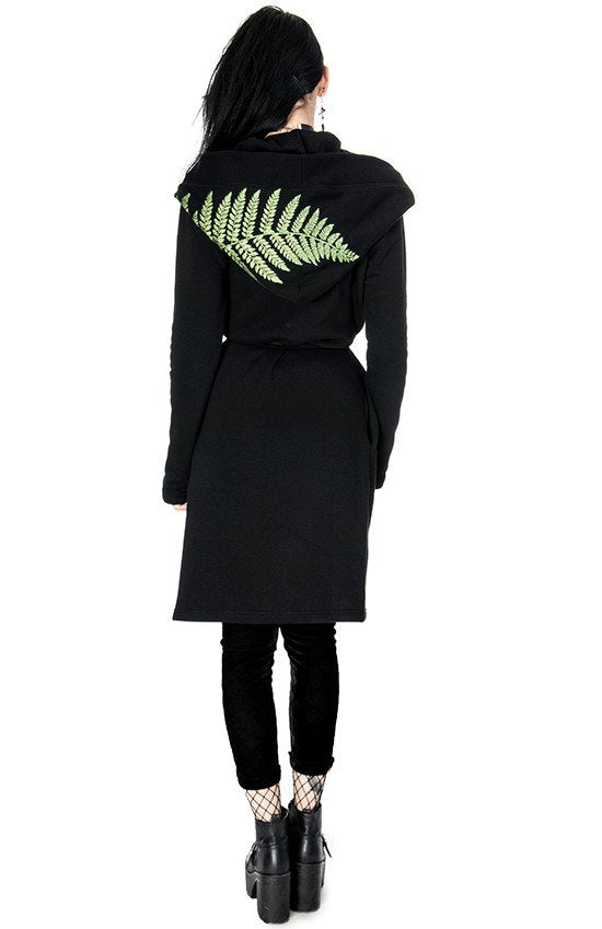 Design details include an oversized hood adorned with gorgeous fern embroidery. a tucked waist and a thick knitted cotton fabric with velvet finish.