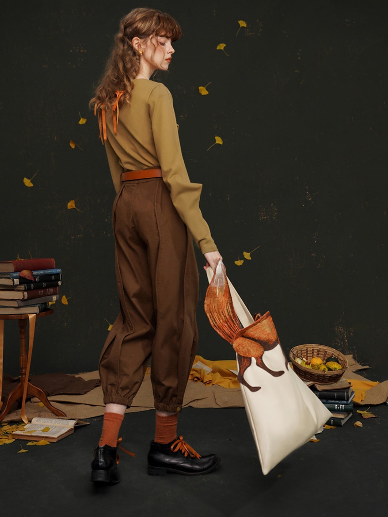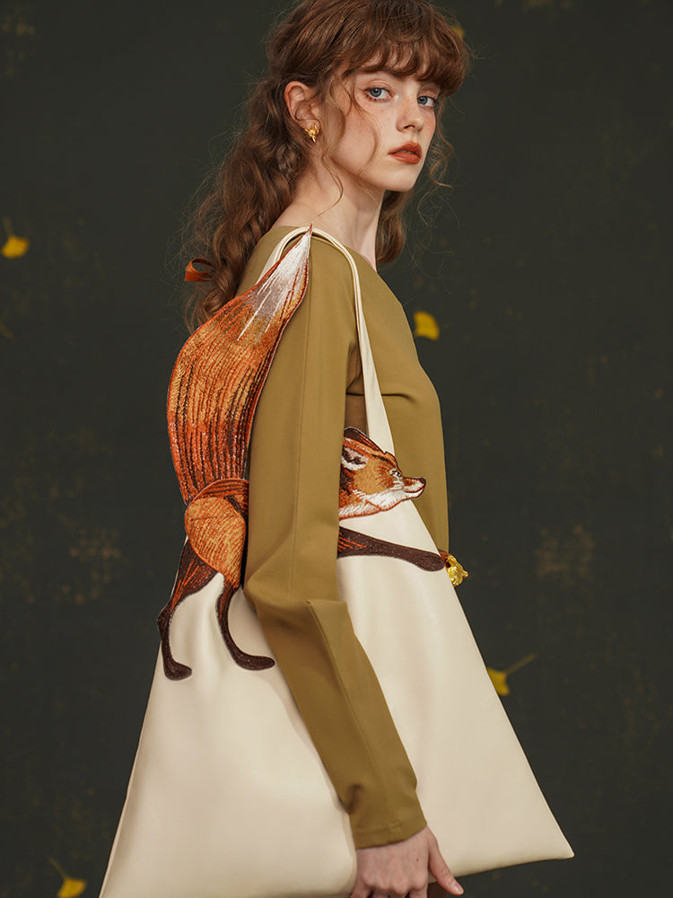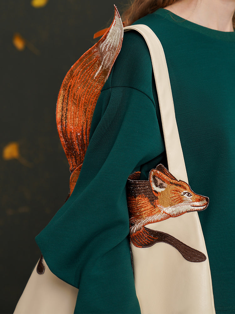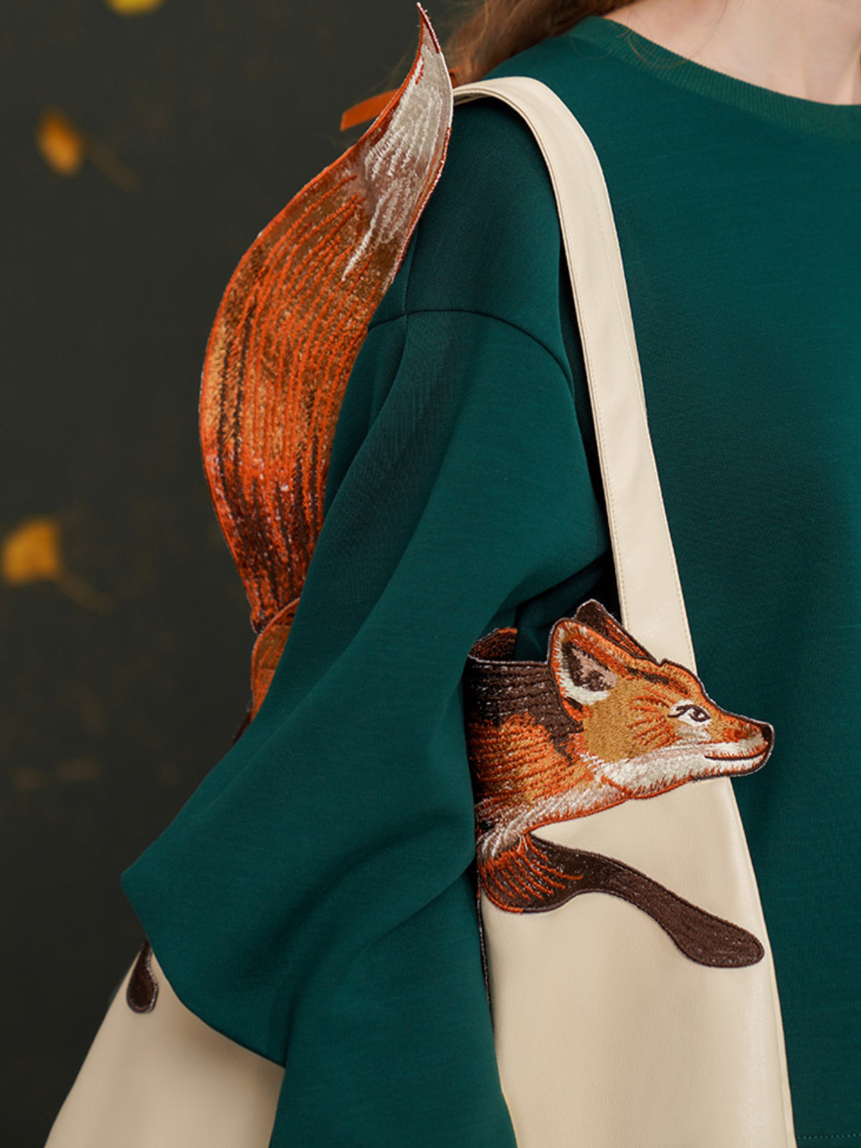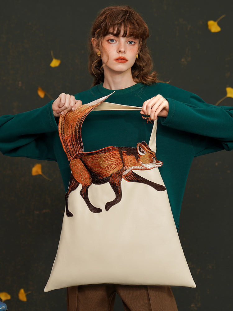 Step into an enchanting world with our Foxy Charm Tote Bag. inspired by Nordic fairytales. This tote bag features a beautifully embroidered red fox. designed to capture the essence of a whimsical storybook illustration. The fox's sharp yet endearing eyes. dynamic walking pose. and fur that appears to glow in the sunlight create a captivating and elegant accessory.