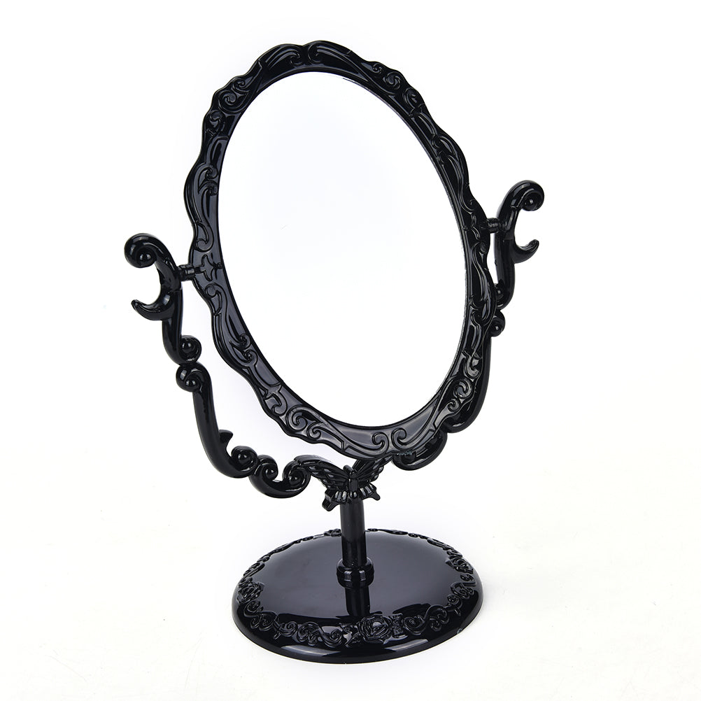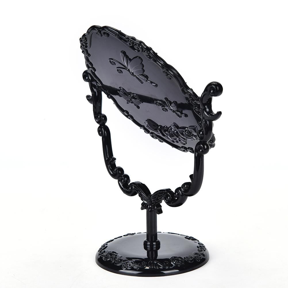 A small romantic goth vintage-style. shiny black rotating table top mirror. with the cutest butterfly and flower design on the back and on the stand.