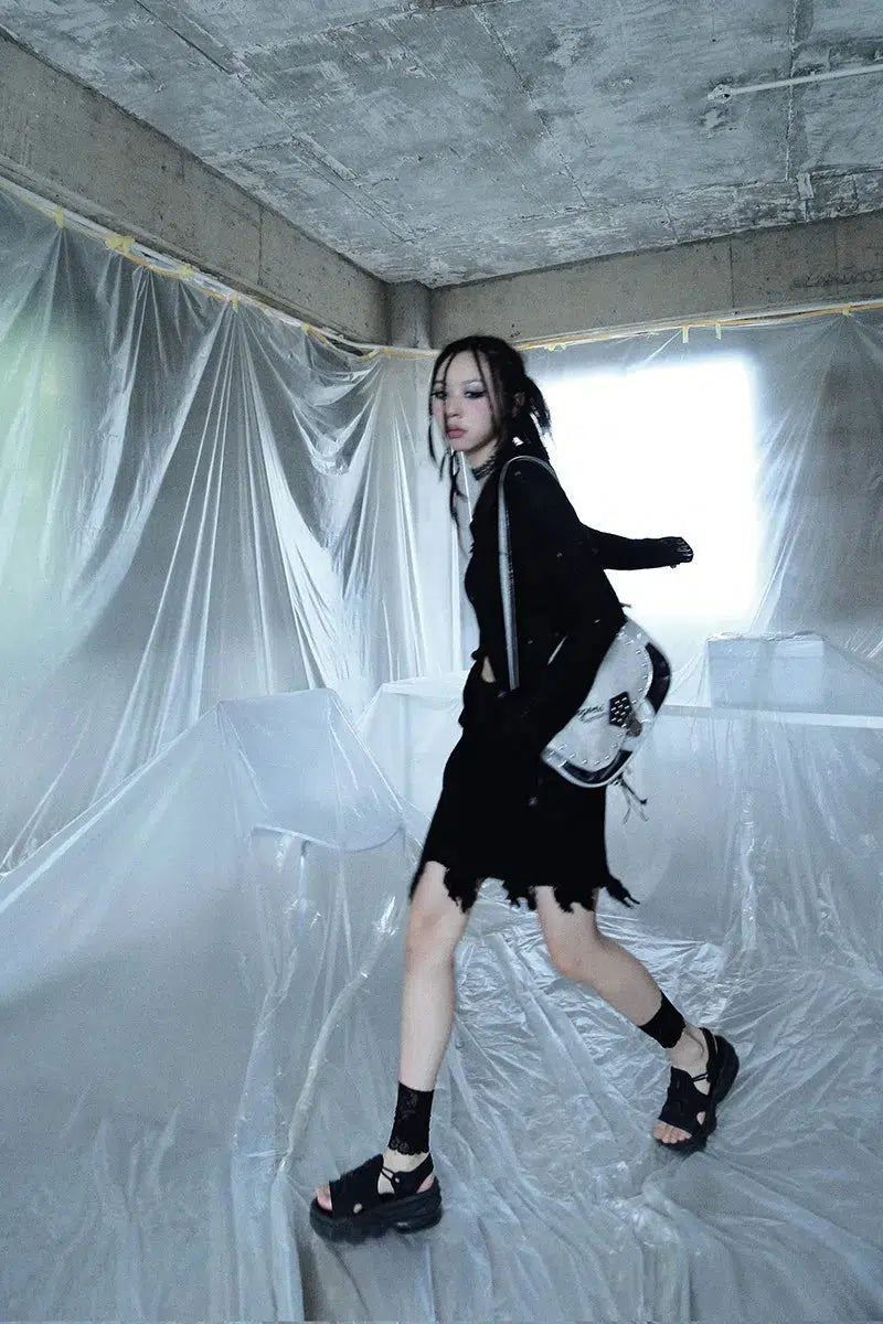 Grunge Distressed Cardigan & Mini Skirt Two Piece Set