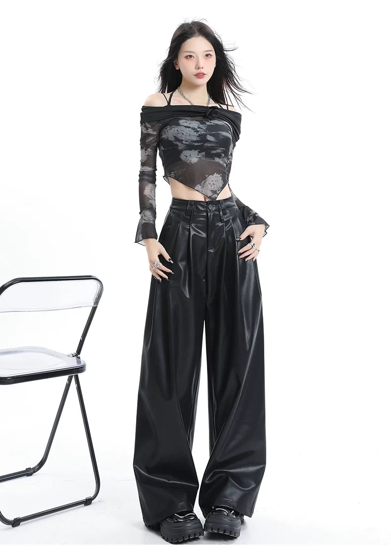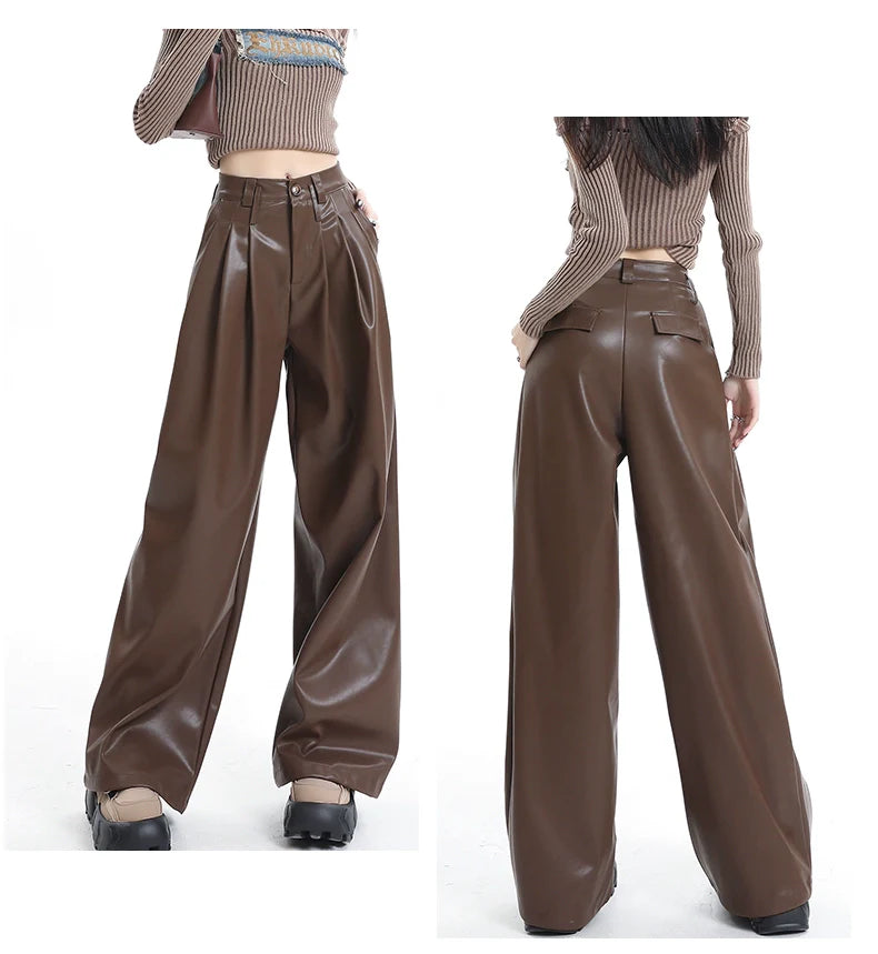 Step up your style with Chiclara's High-Waisted Brown Leather Pants. Made from premium faux leather. these pants feature a sleek finish. high-waisted fit. and wide-leg silhouette. Perfect for casual or dressy occasions. pair them with a cropped top or a blazer for a chic look.