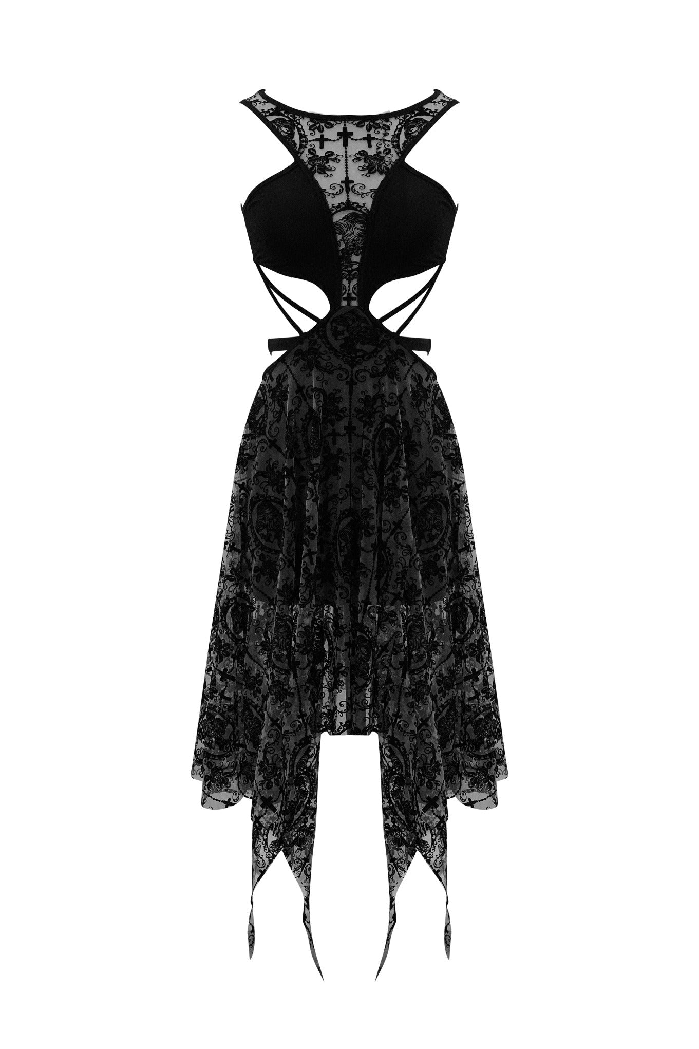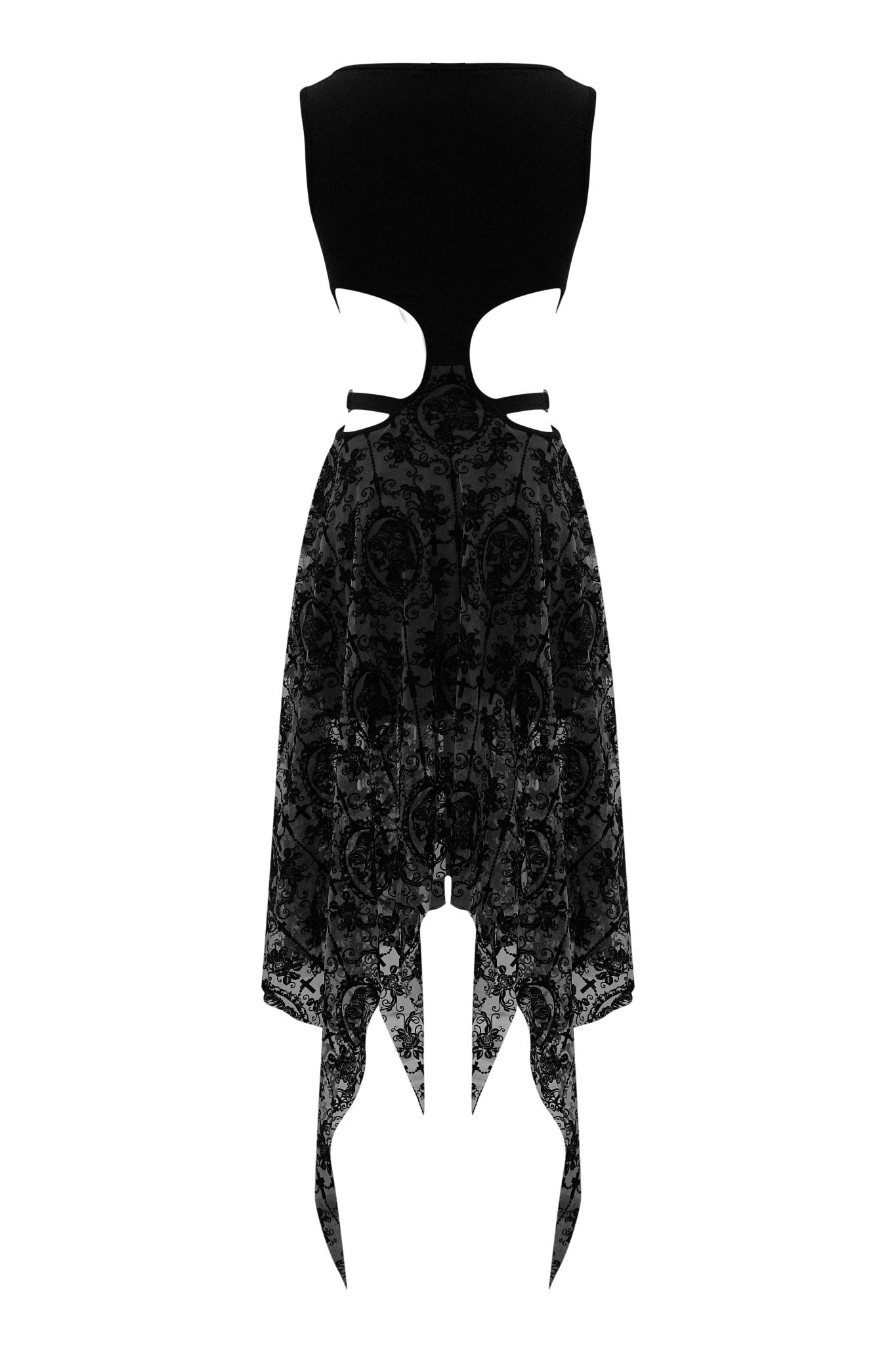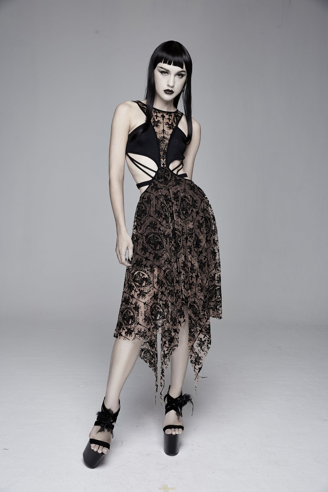 A beautiful. flowing gothic dress with revealing cut-out pieces and a romantic. draped silhouette.