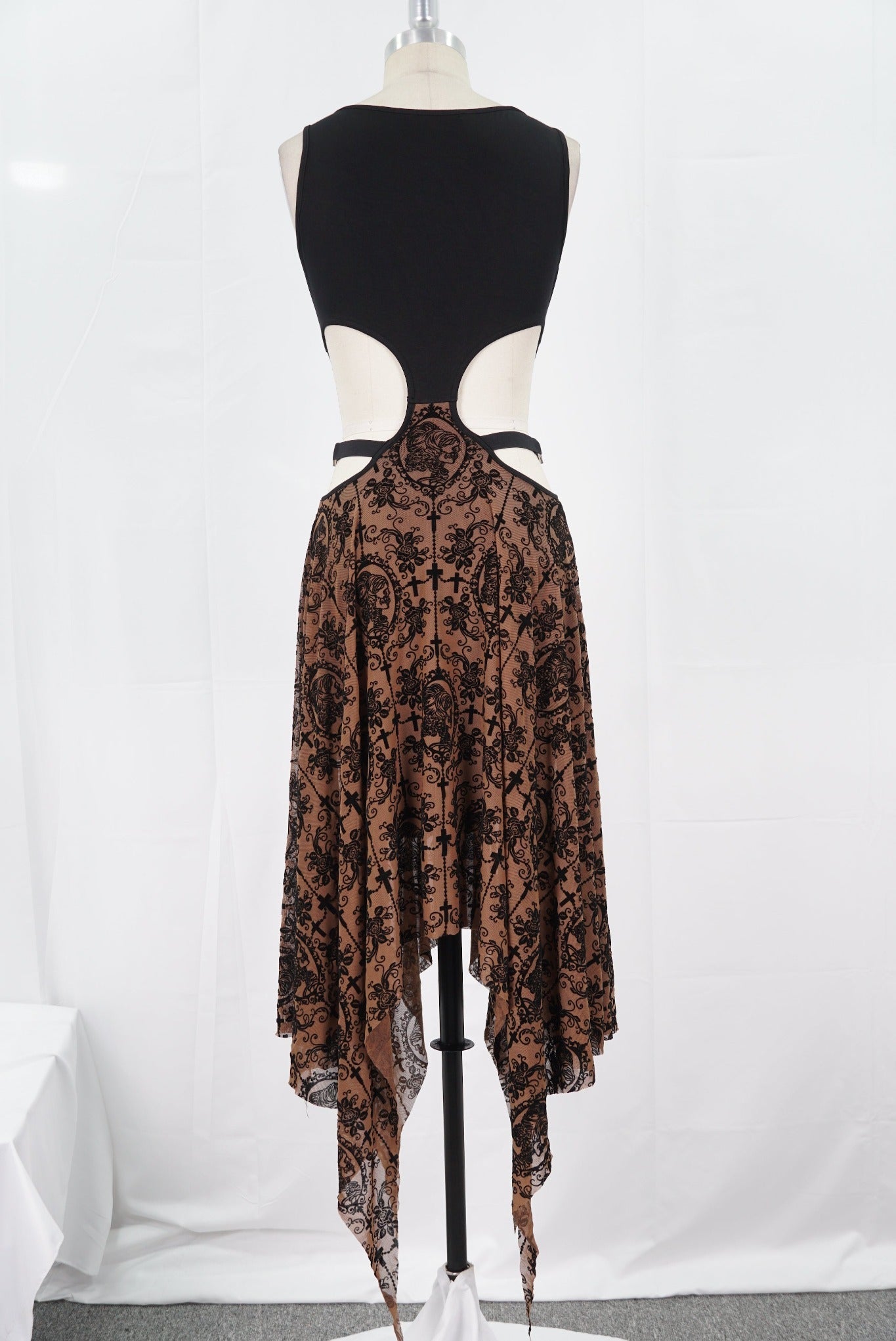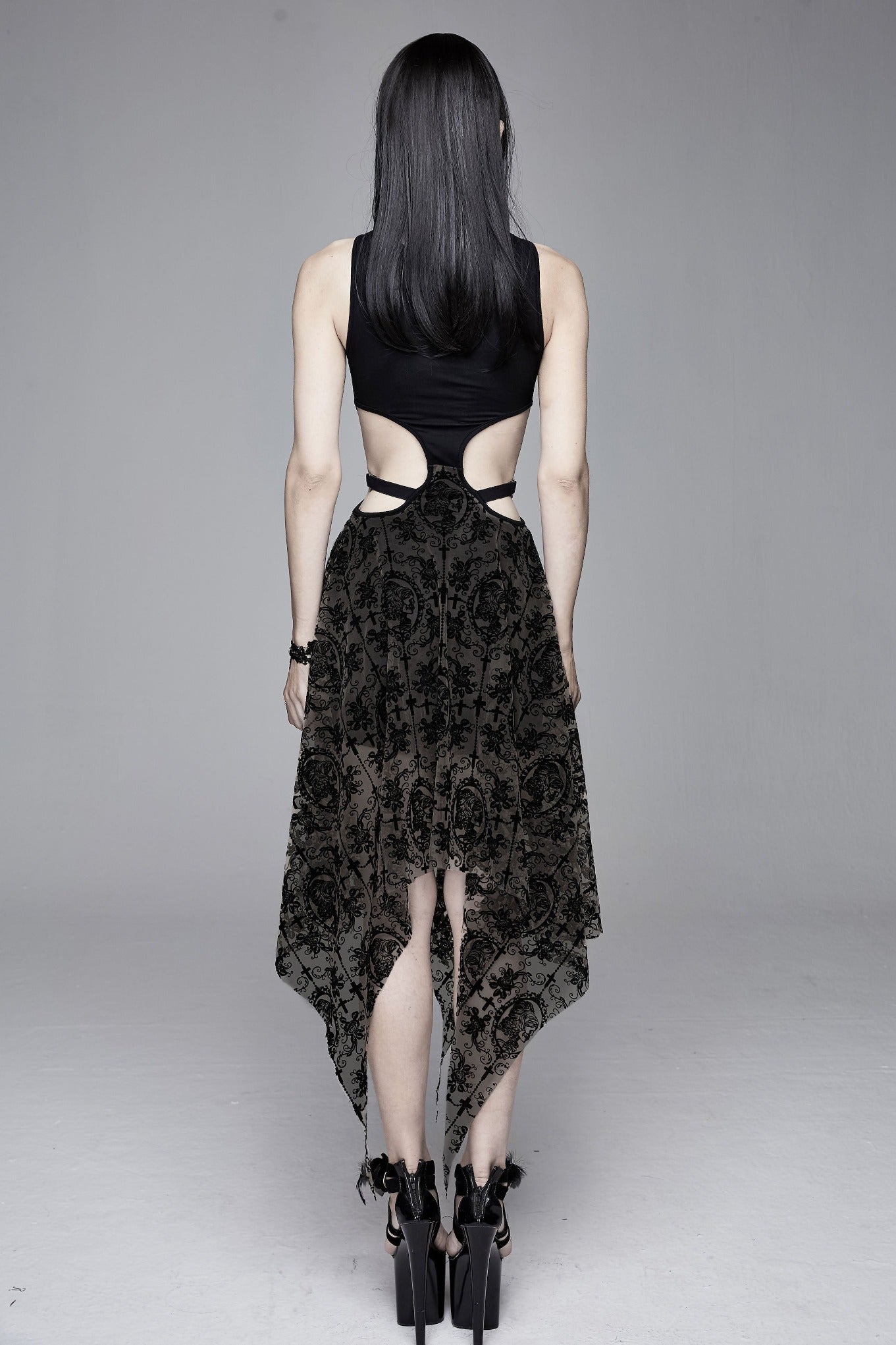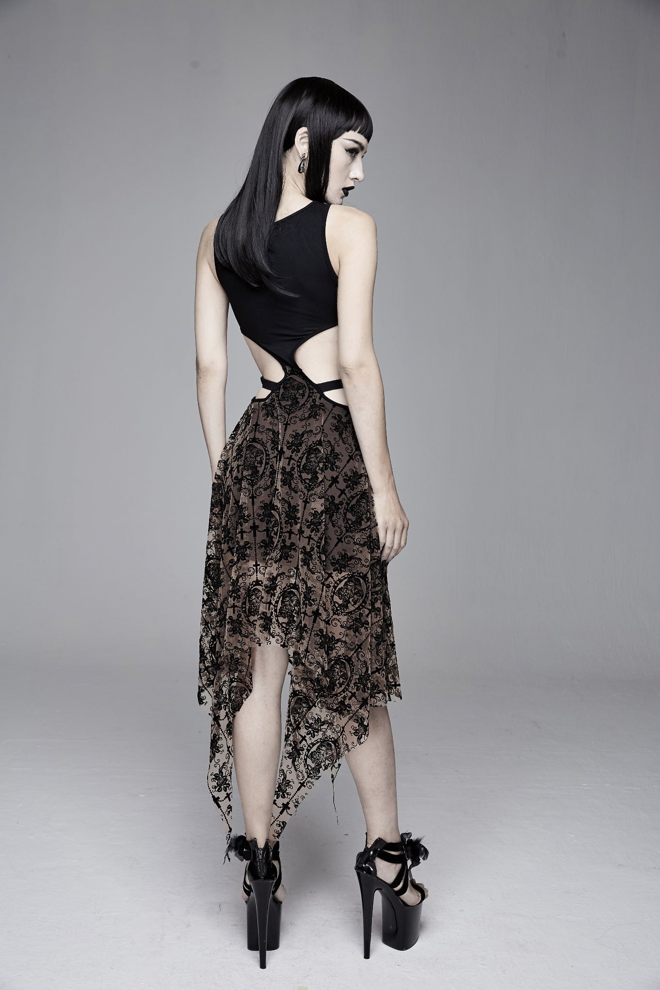 A beautiful. flowing gothic dress with revealing cut-out pieces and a romantic. draped silhouette.