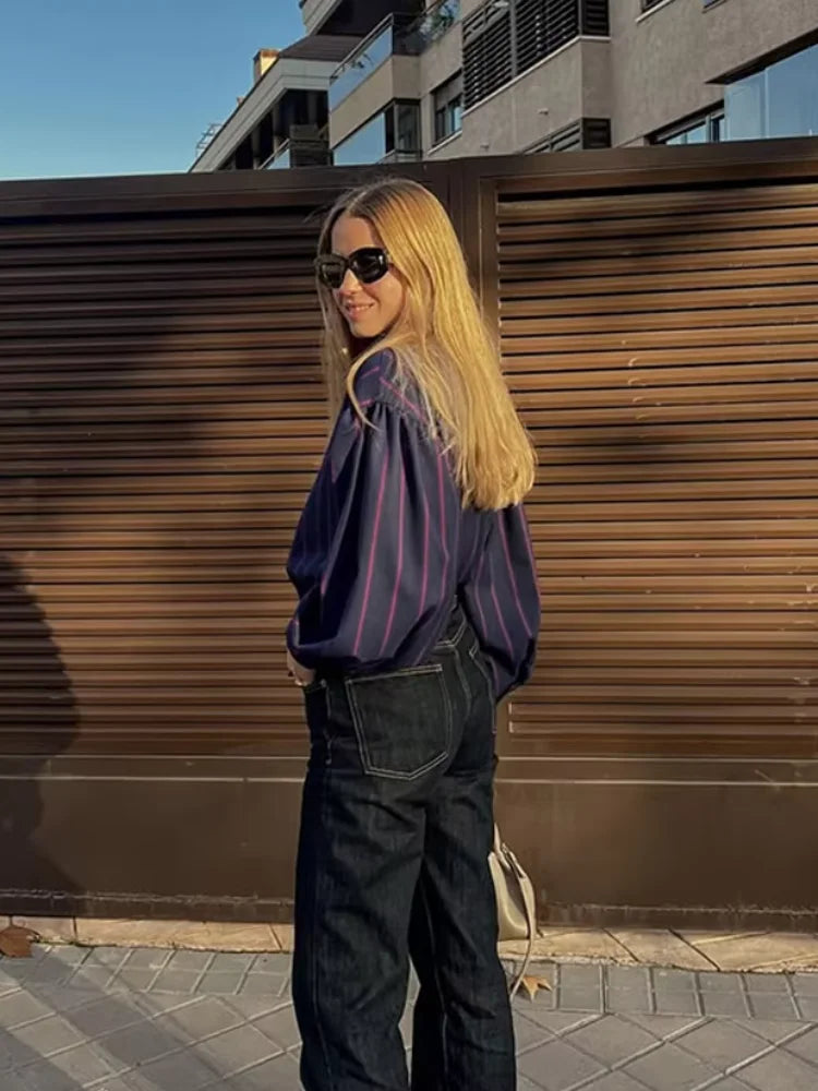 Lace Up Collision Striped Round Neck Blouse
