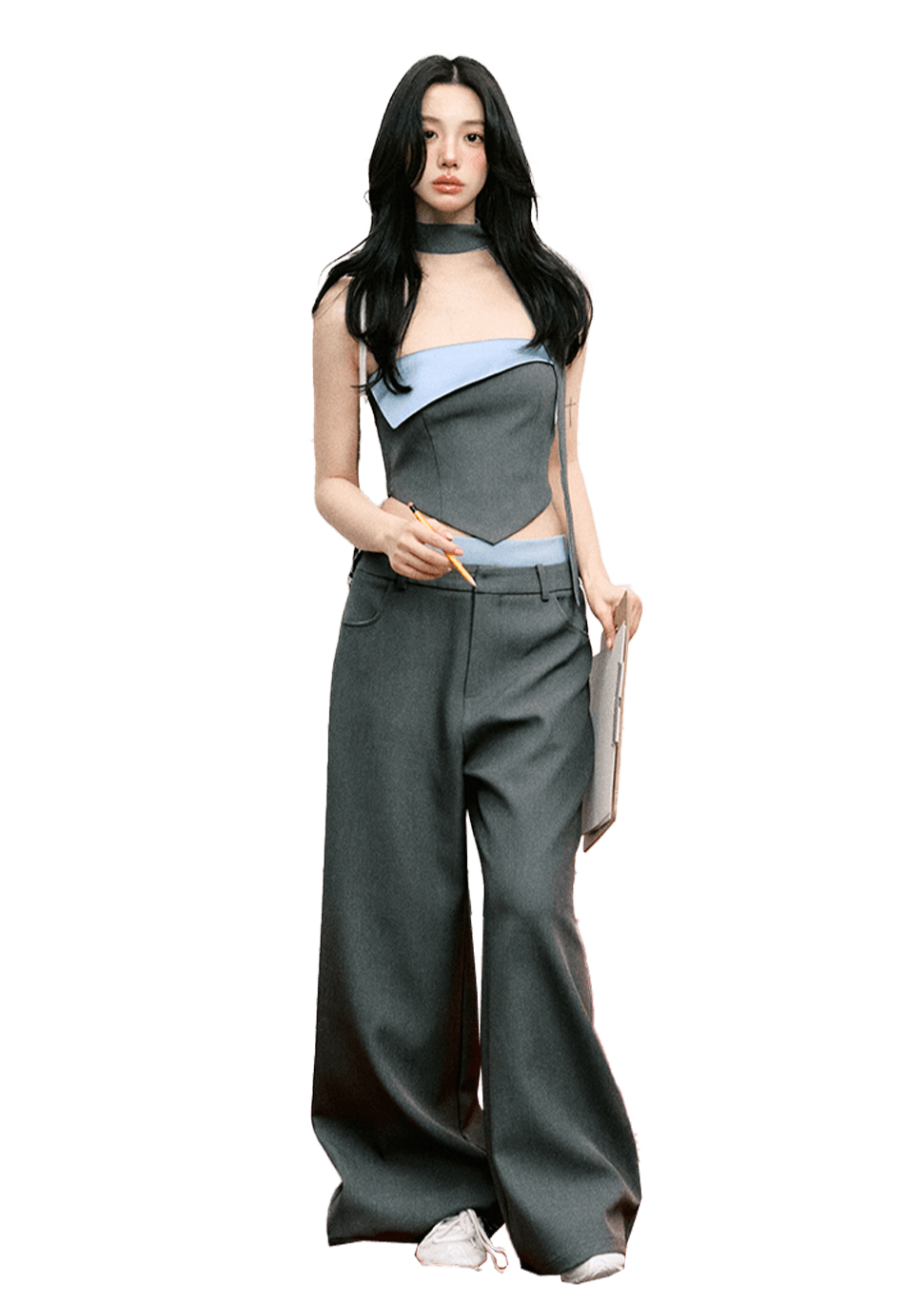 Contrast Color Cuffed Bandeau Top & Wide-Leg With Waistband Pants Set