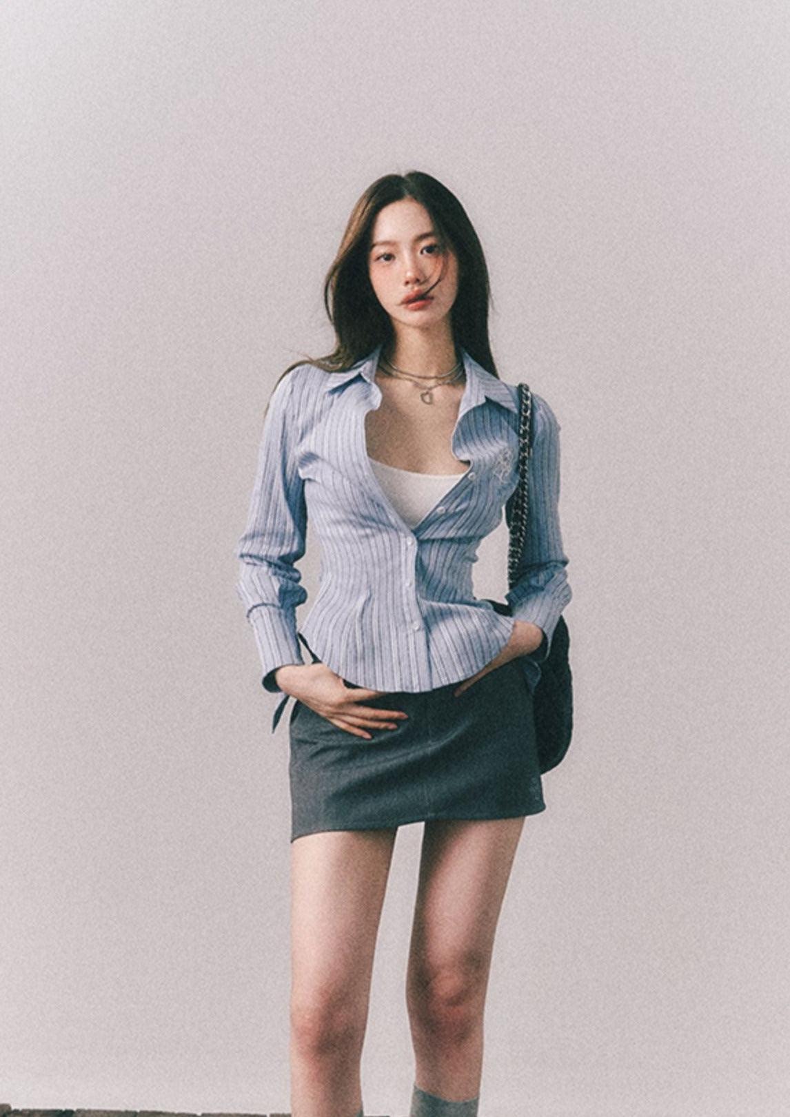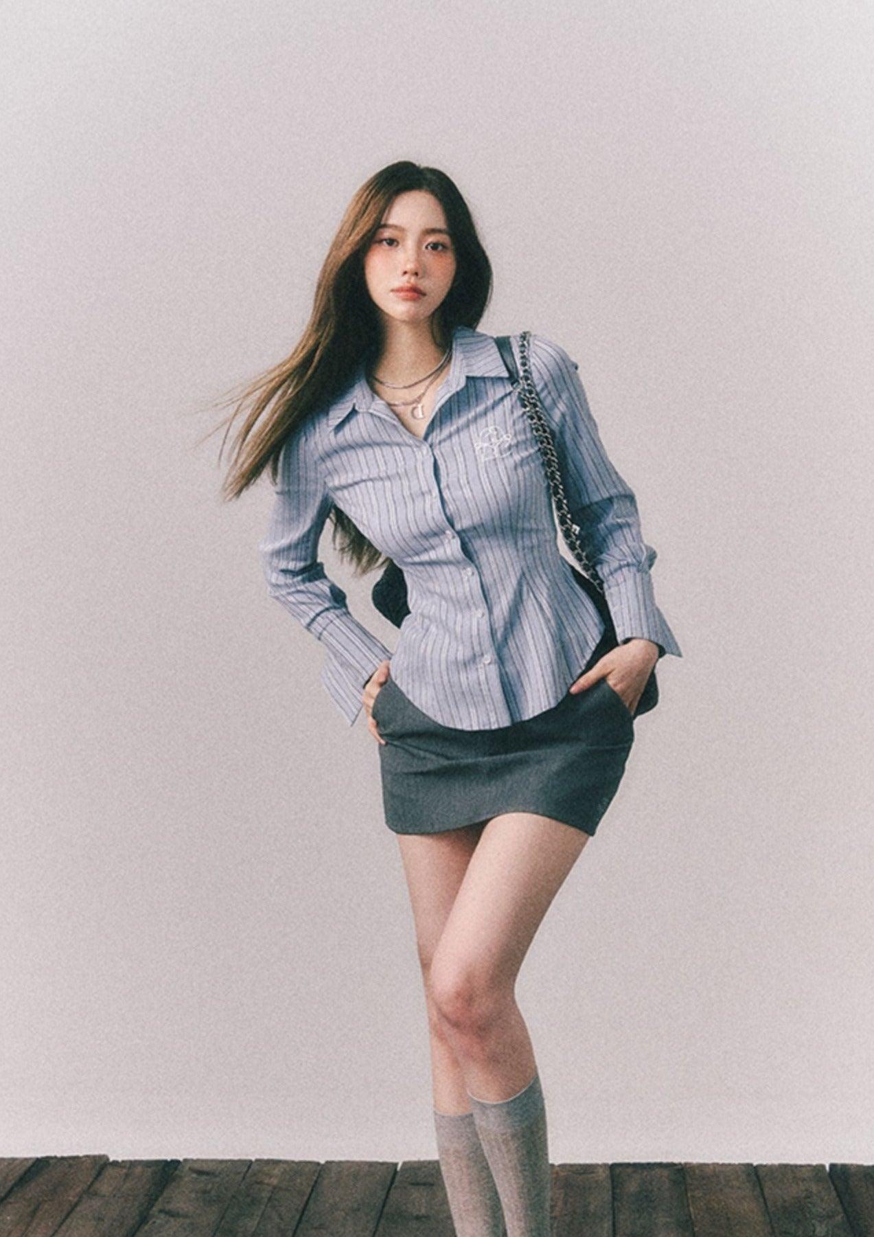 Embroidered Texture Striped Classic Slim Shirt & Skirt Set