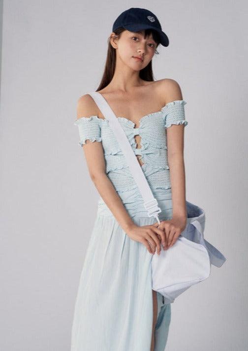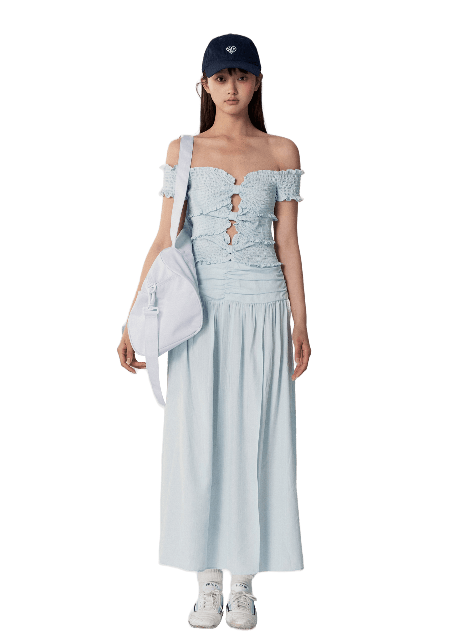 Blue Off-Shoulder Bow-Detail Pleated Long Dress