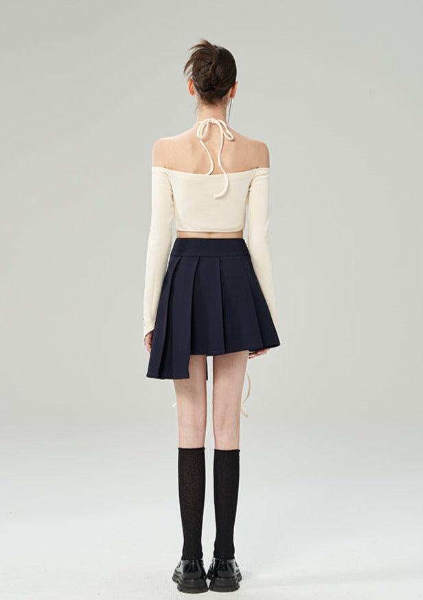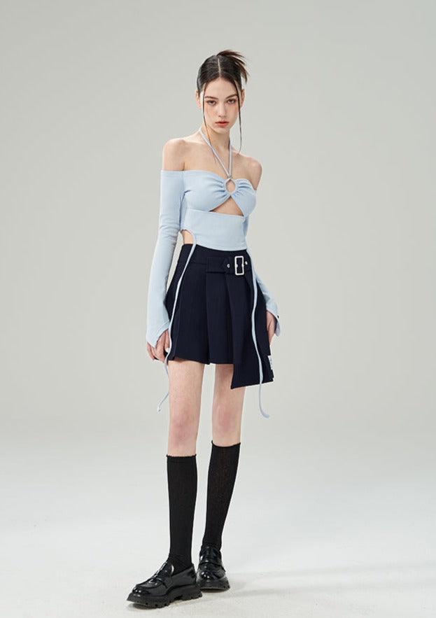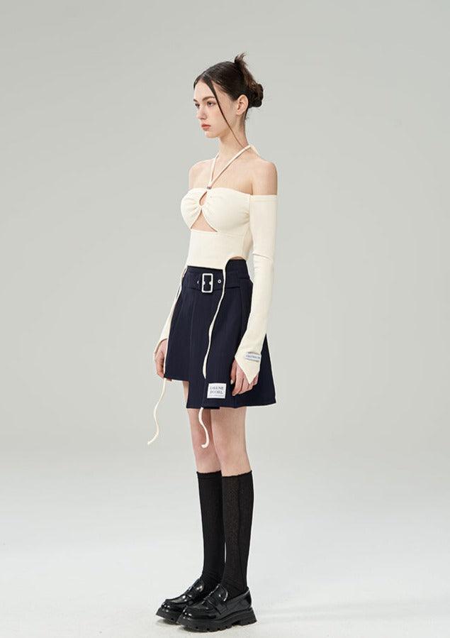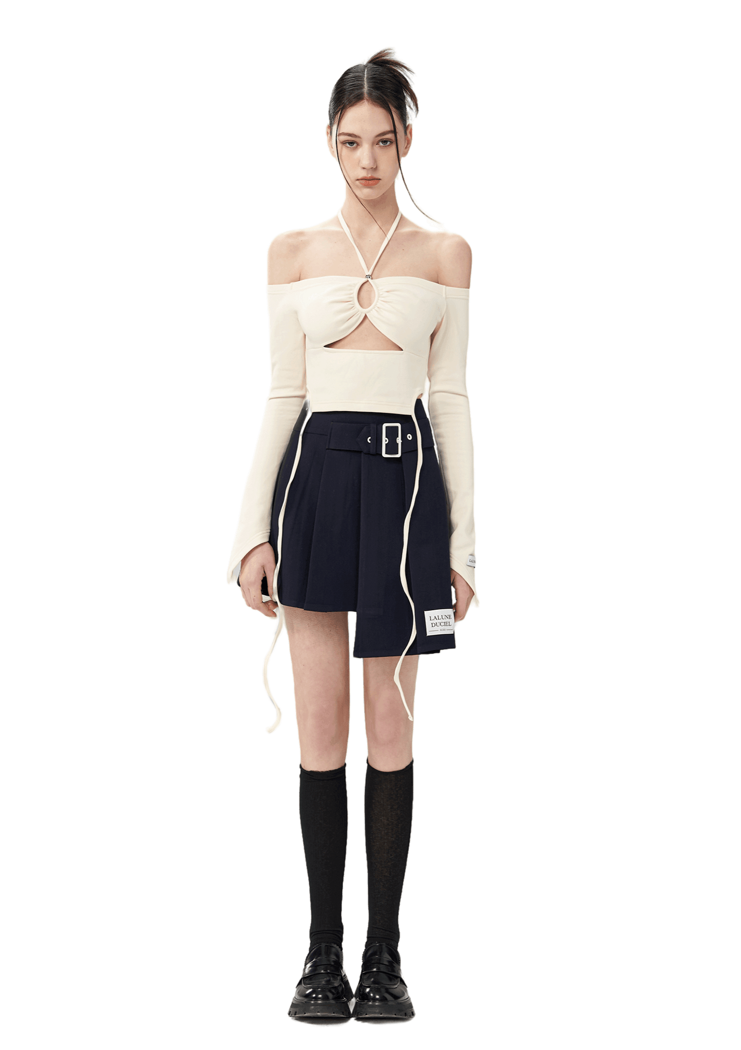 Off Shoulder Long Sleeve Ribbon Halter Neck Top