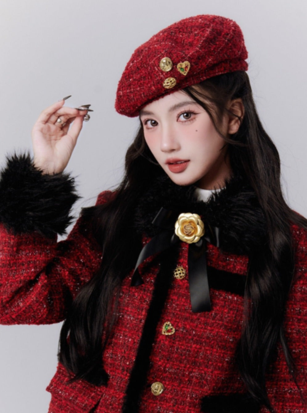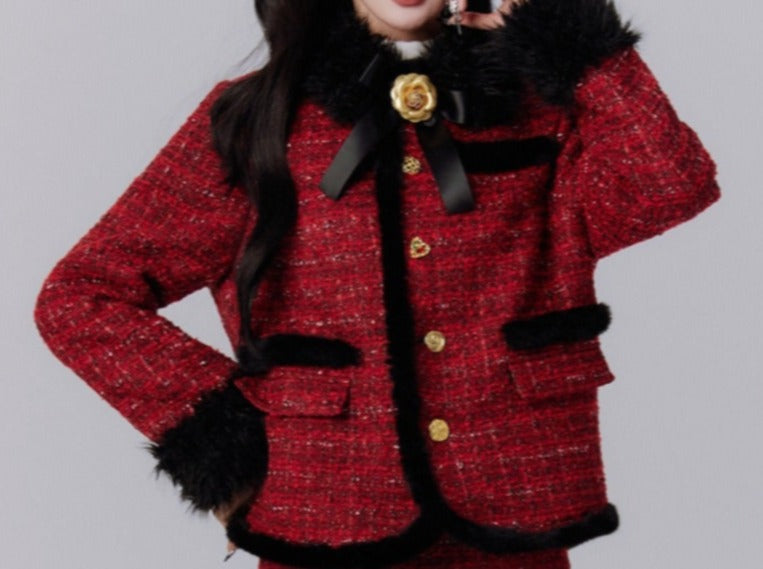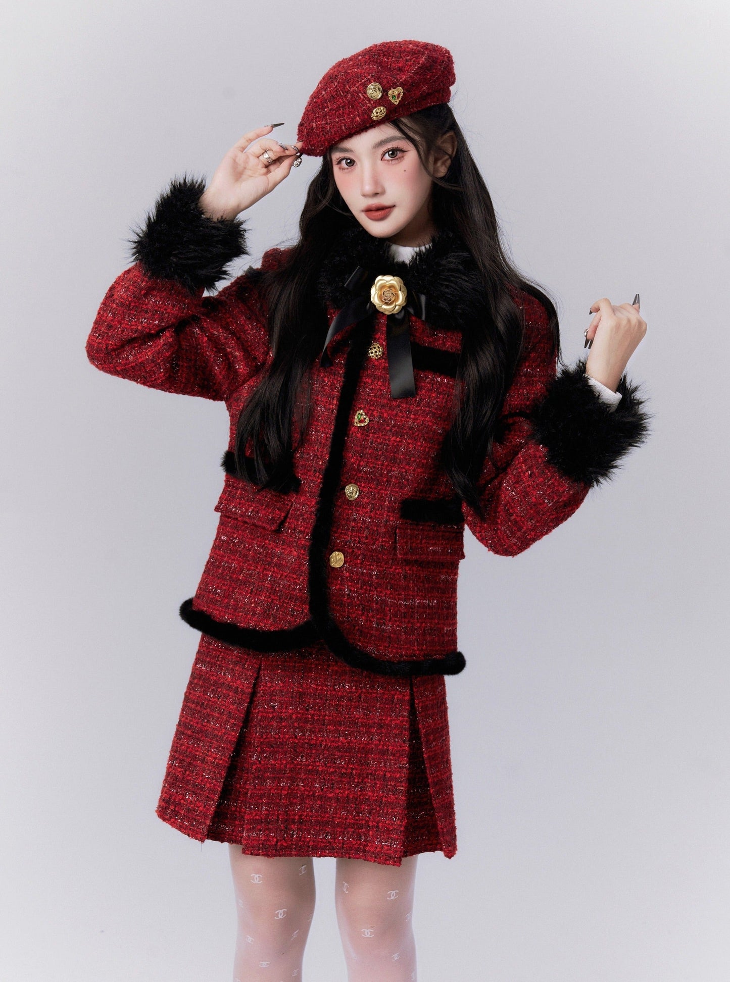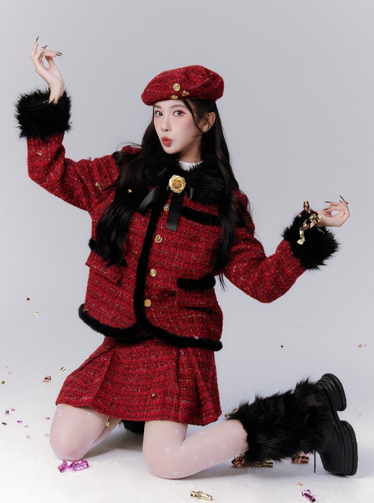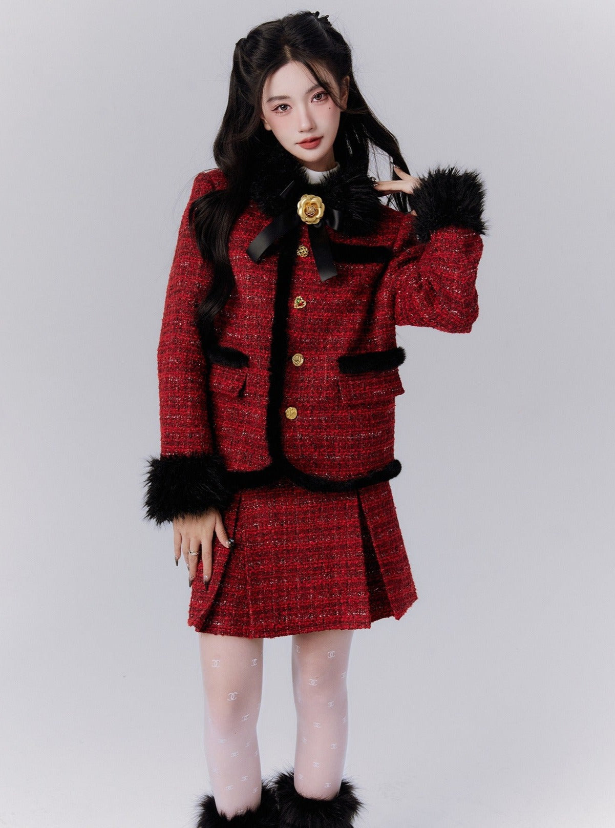 Luxe Burgundy Tweed Set: Fur-Trimmed Blazer and Pleated Mini Skirt