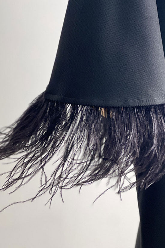 Lift yourself up in fanciful faux feather trim dresses in timeless black. defining boutique sophistication for women this winter. Featuring long sleeves with feather detailed flared cuffs. this luxurious LBD blends timeless charm with modern elegance. Designed to hug curves. this luxury bandage knit gown outfit embodies comfort and style seamlessly. The metallic zip back and back vent add a contemporary edge. perfect for captivating entrances at winter soirées. Embrace opulence with this chic addition to your winter dress collection. where fashion meets sophistication at every curve.