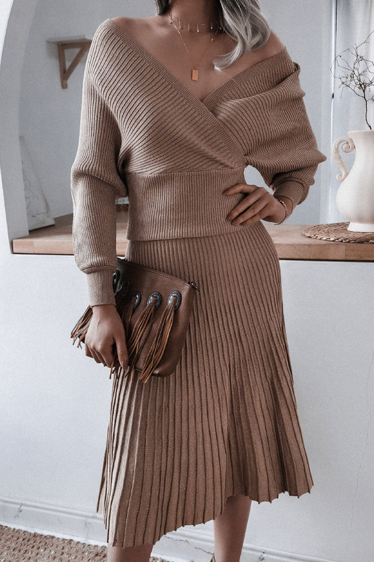 Keep your transitional weather look beautiful with sparkly two-piece sweater dresses. Knitted from shimmering Lurex yarns. this holiday party fall sweater set feels as special as it looks â€?a chic off-the-shoulder pullover sweater with a daring wrap-front V neckline that you can put on or put off for a sexy night-out look. long sleeves with ribbed cuffs. and the fitted banded hemline with the high waist band of the matching textured knitted skirt offering double warmth in winter. and the A-line silhouette with flare hem in a mid-length dress cut for easy movement. this festival knitted skirt set creates a subtle metallic cool effect glisten beautifully from all angles when you try it on.Â