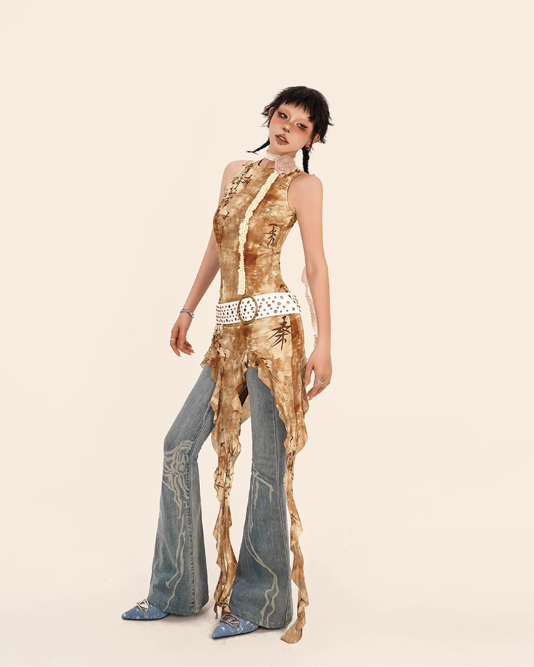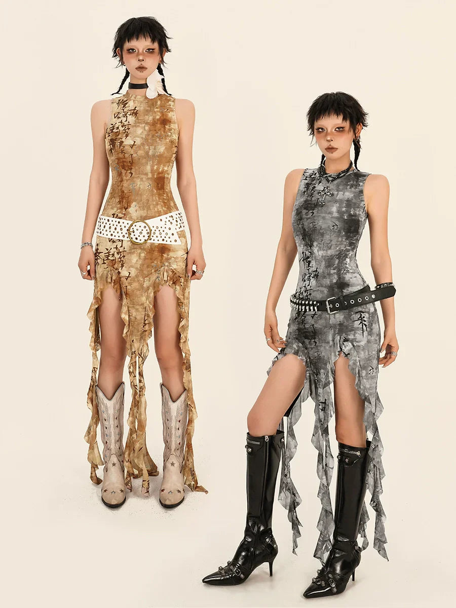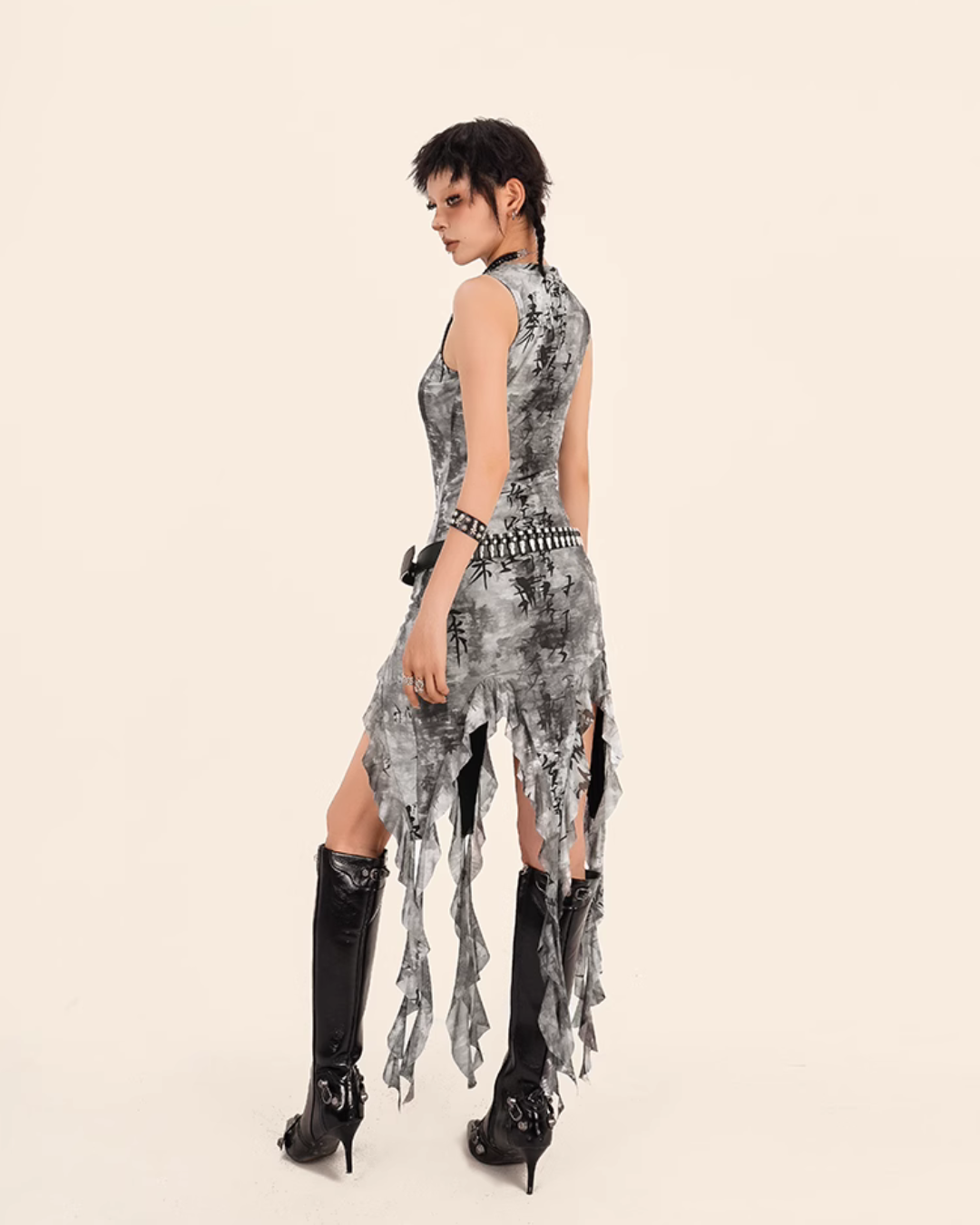 Edgy sleeveless dress with a dramatic high-low hemline. available in earthy brown or urban grey. Features a distressed. tie-dye-like pattern throughout. evoking a post-apocalyptic aesthetic. The form-fitting bodice contrasts with the tattered. asymmetrical skirt that cascades into long tendrils.
