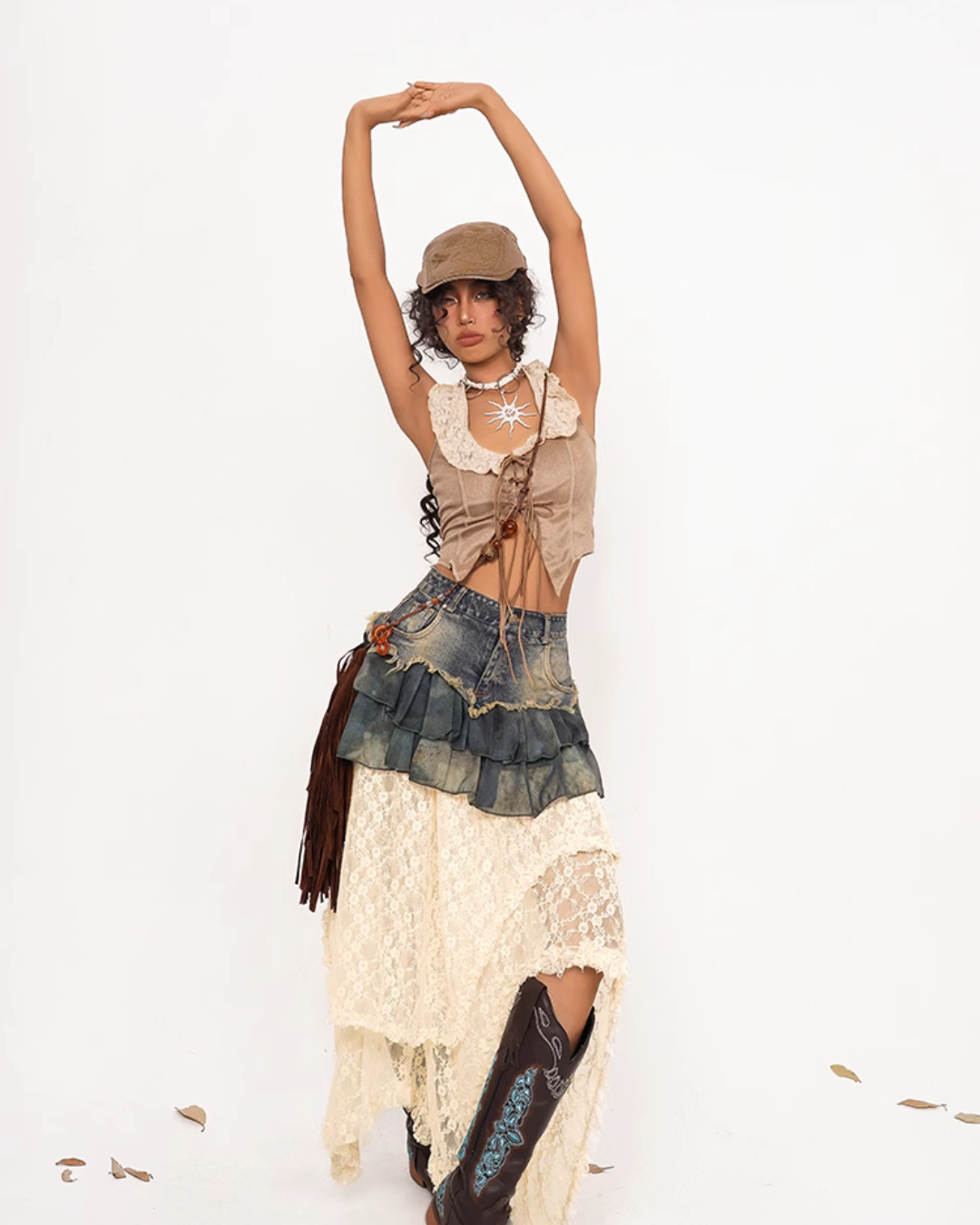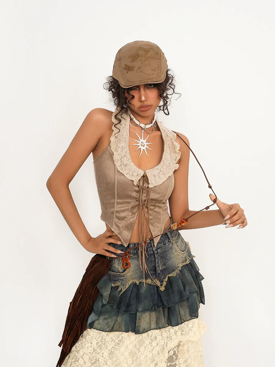 Charming sleeveless vest in a soft taupe color. reminiscent of Victorian-era styling. Features a unique oversized lace collar in cream. adding a romantic and feminine touch. The vest has a front lace-up closure with delicate ties. allowing for adjustable fit. Made from what appears to be a velvet or velveteen fabric. giving it a luxurious texture. Paired with a tan newsboy cap for a playful. vintage-inspired look.