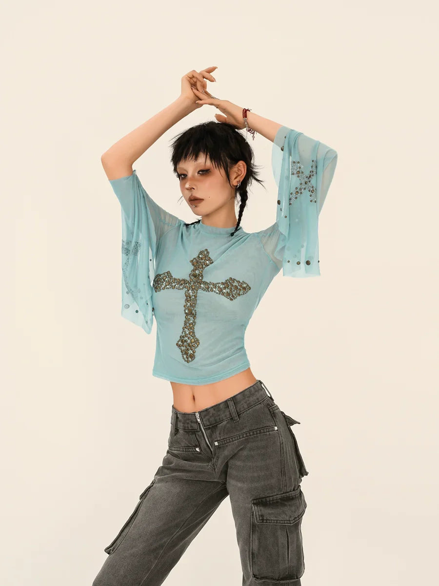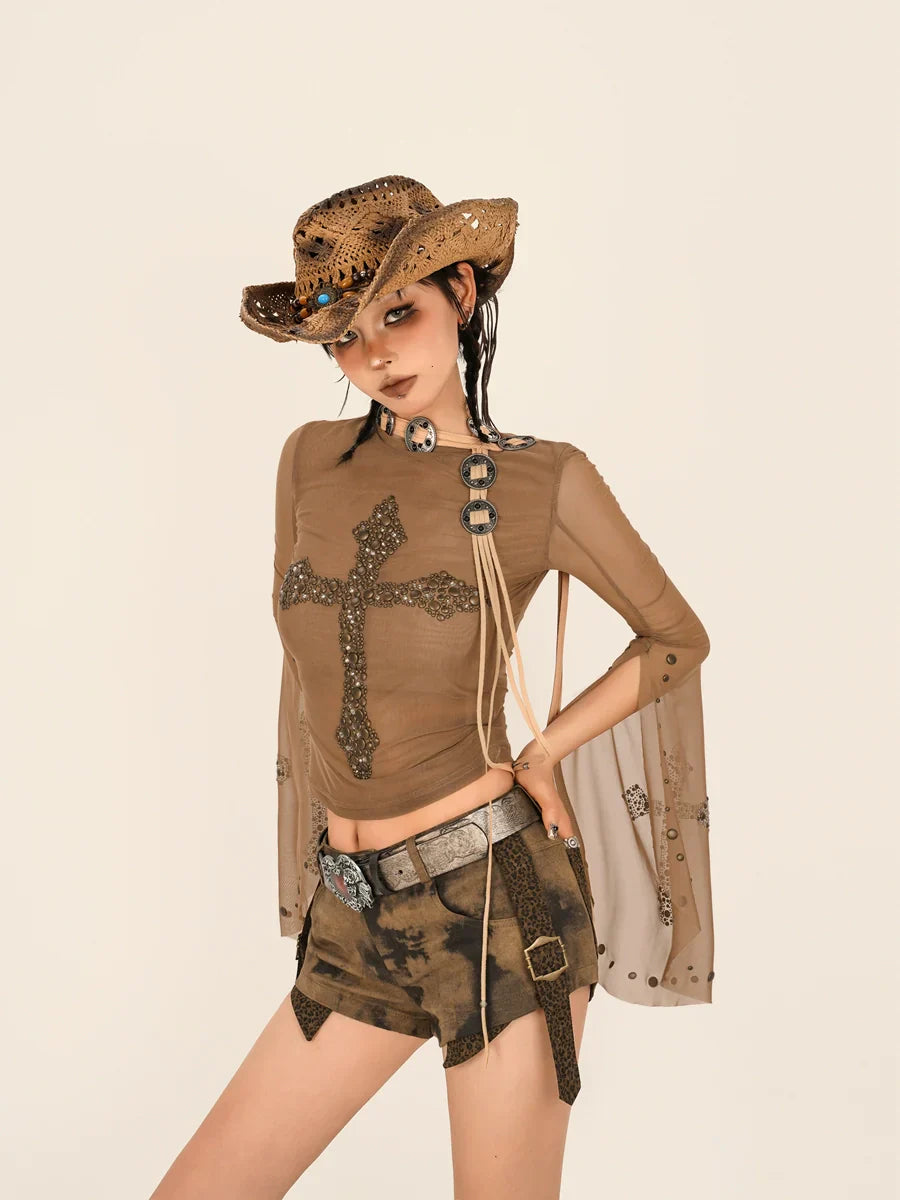 Form-fitting suede dress in warm camel color with a decorative cross embellishment. Features long sleeves and a high neckline for a modest yet stylish look. Perfect for country-western events. bohemian-themed parties. or pairing with boots for a chic frontier-inspired outfit.