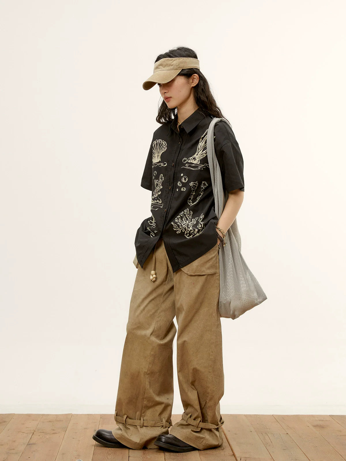This stylish short-sleeve shirt features an original hand-drawn oceanic Hawaiian print. striking a perfect balance between versatility and design. The relaxed fit makes it ideal for casual outfits. The stark contrast between the print colors and the fabric base creates a unique. artistic look that's perfect for summer wear.