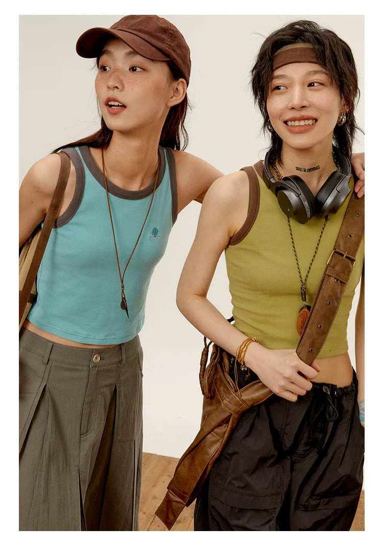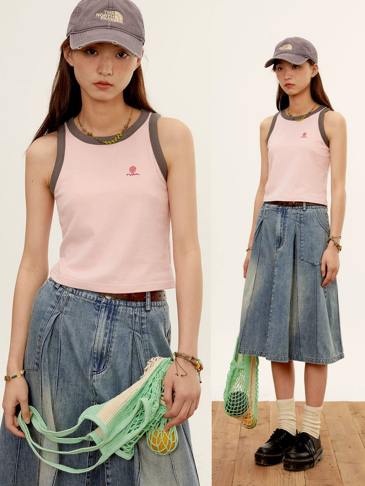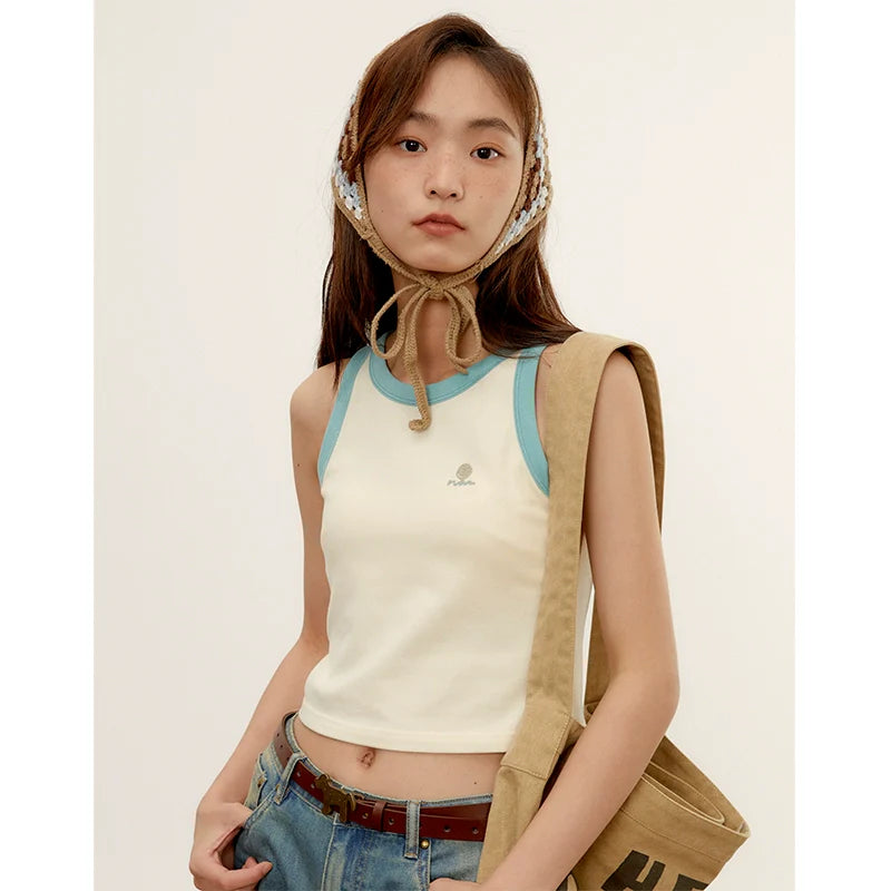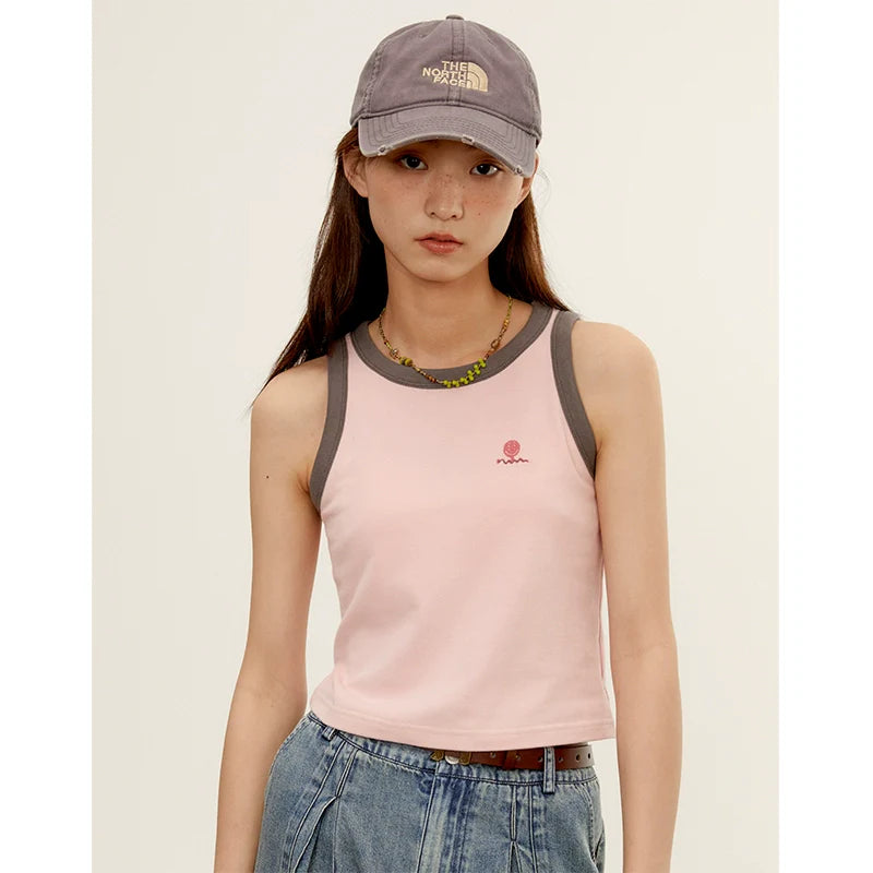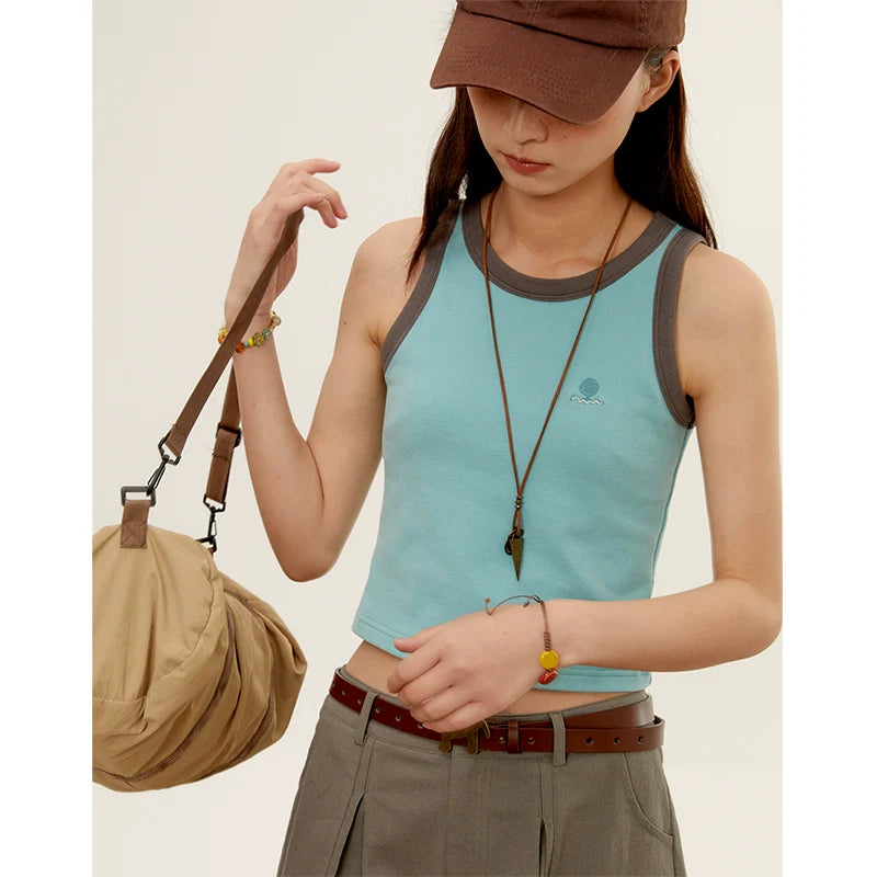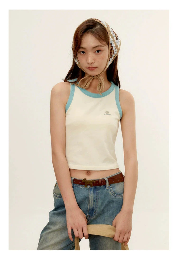 This slightly elastic. contrast-color fitted racerback tank top is incredibly slimming. It perfectly divides body proportions. offering effortless summer color coordination. The matching embroidery colors add a playful touch. Available in four color options.