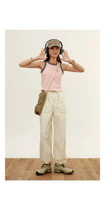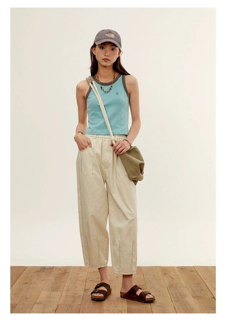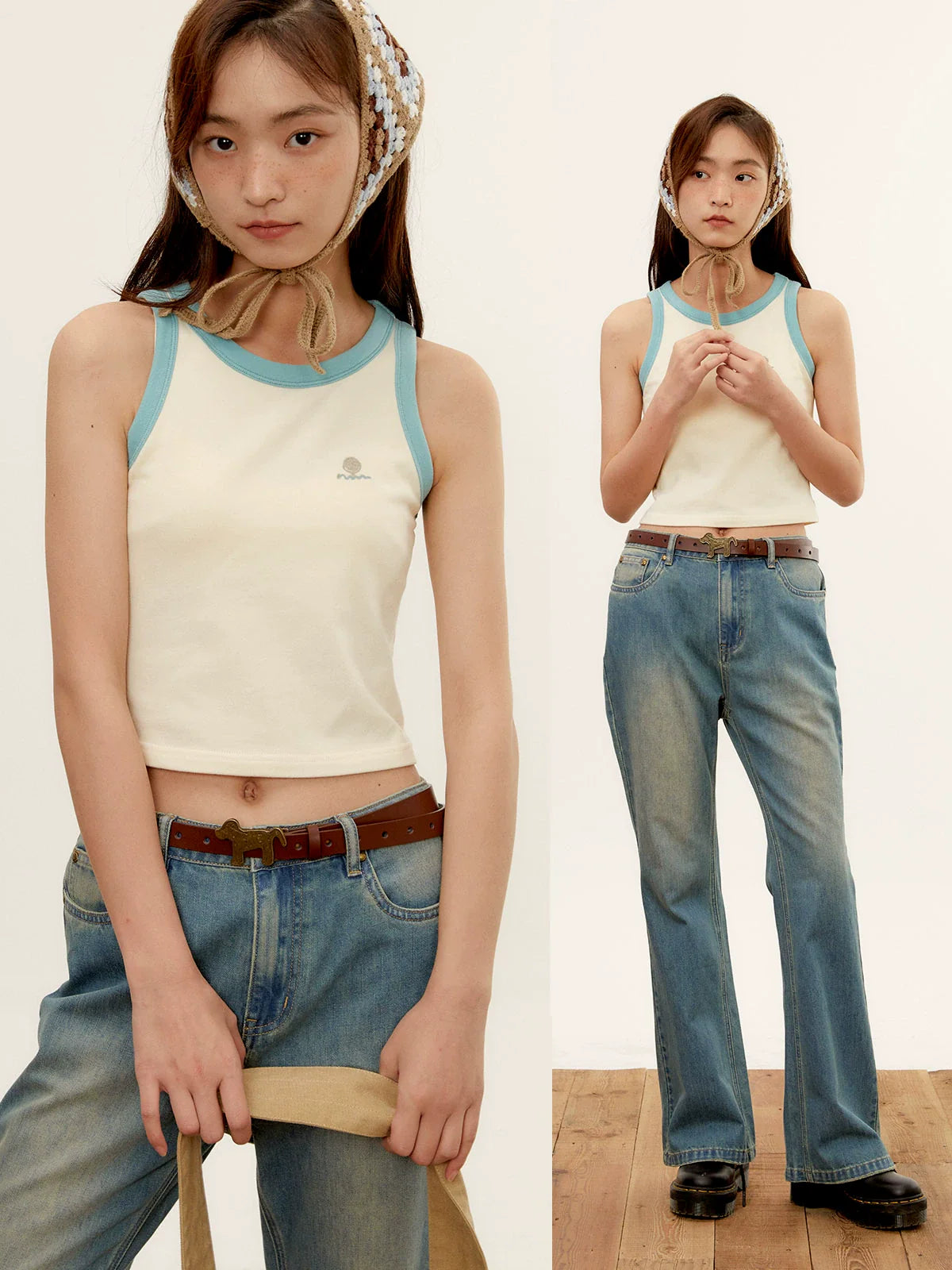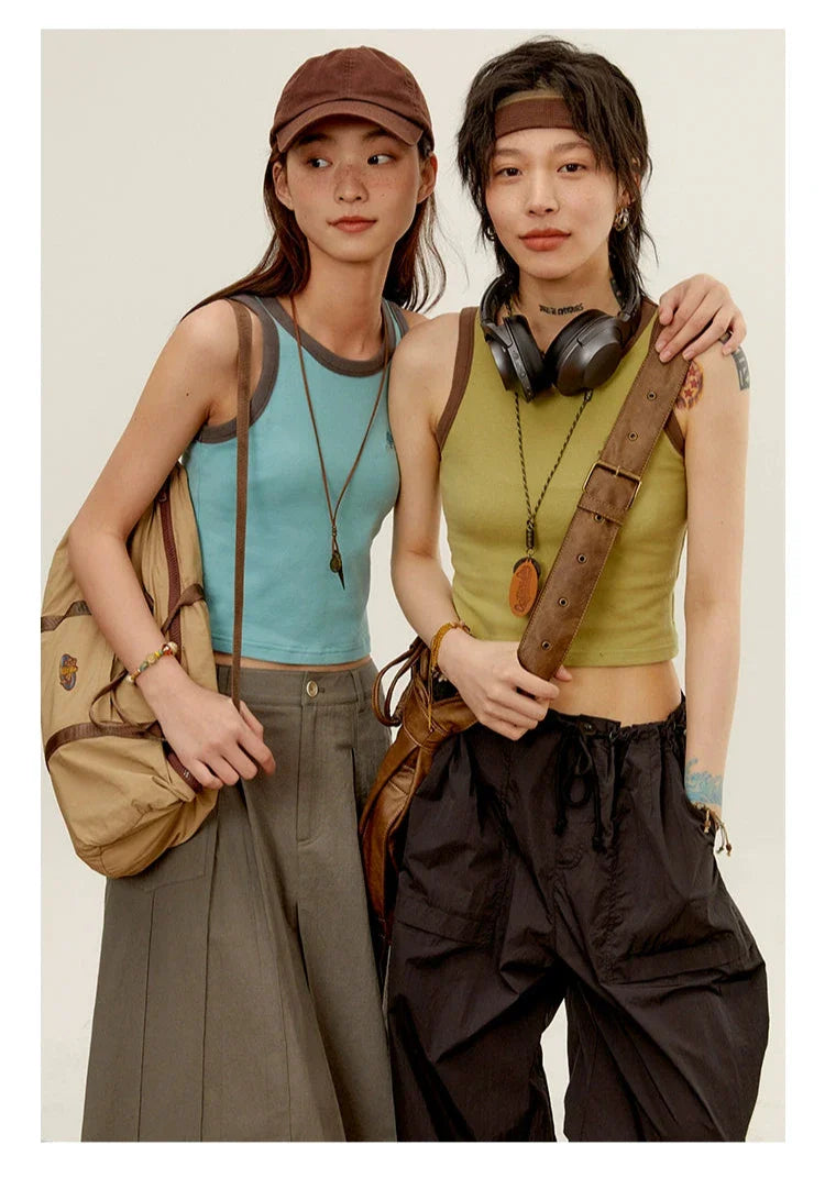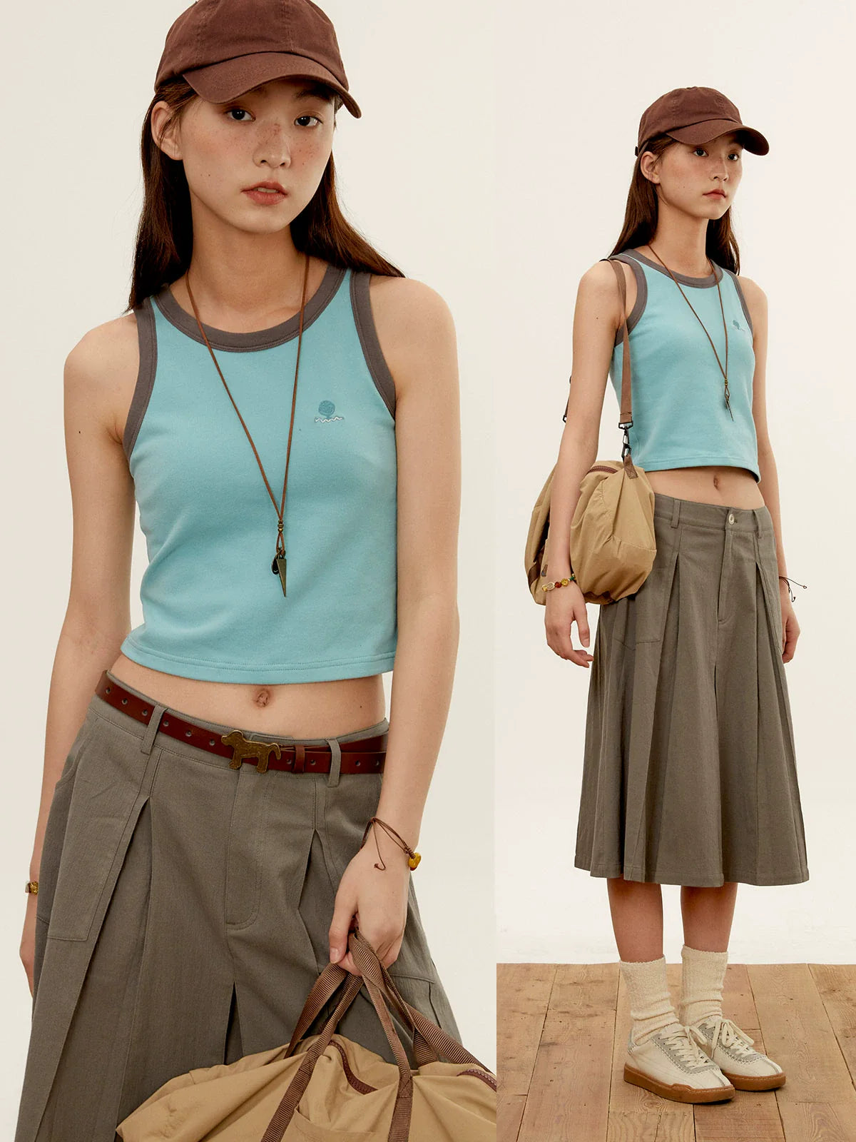 This slightly elastic. contrast-color fitted racerback tank top is incredibly slimming. It perfectly divides body proportions. offering effortless summer color coordination. The matching embroidery colors add a playful touch. Available in four color options.