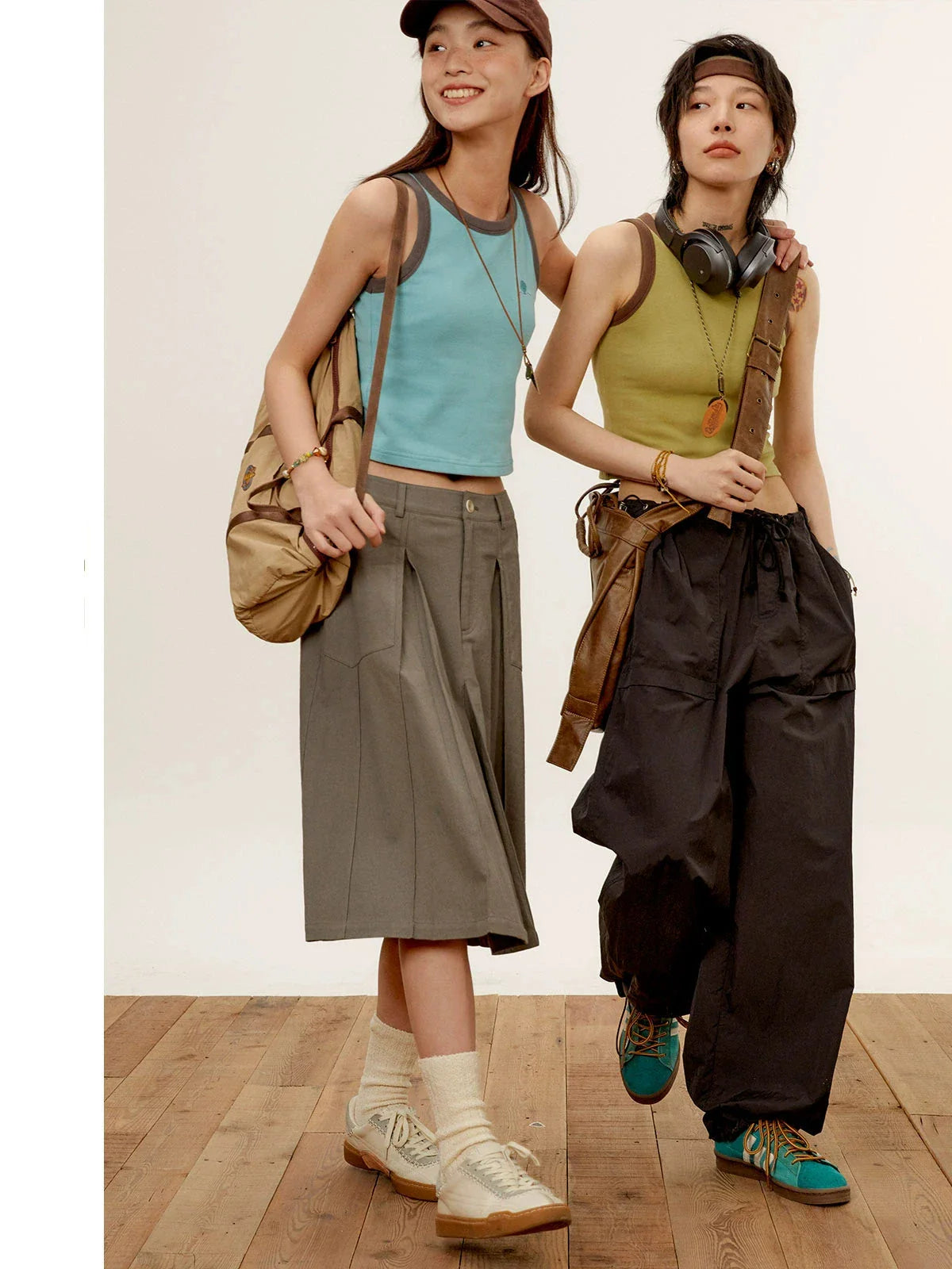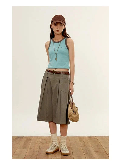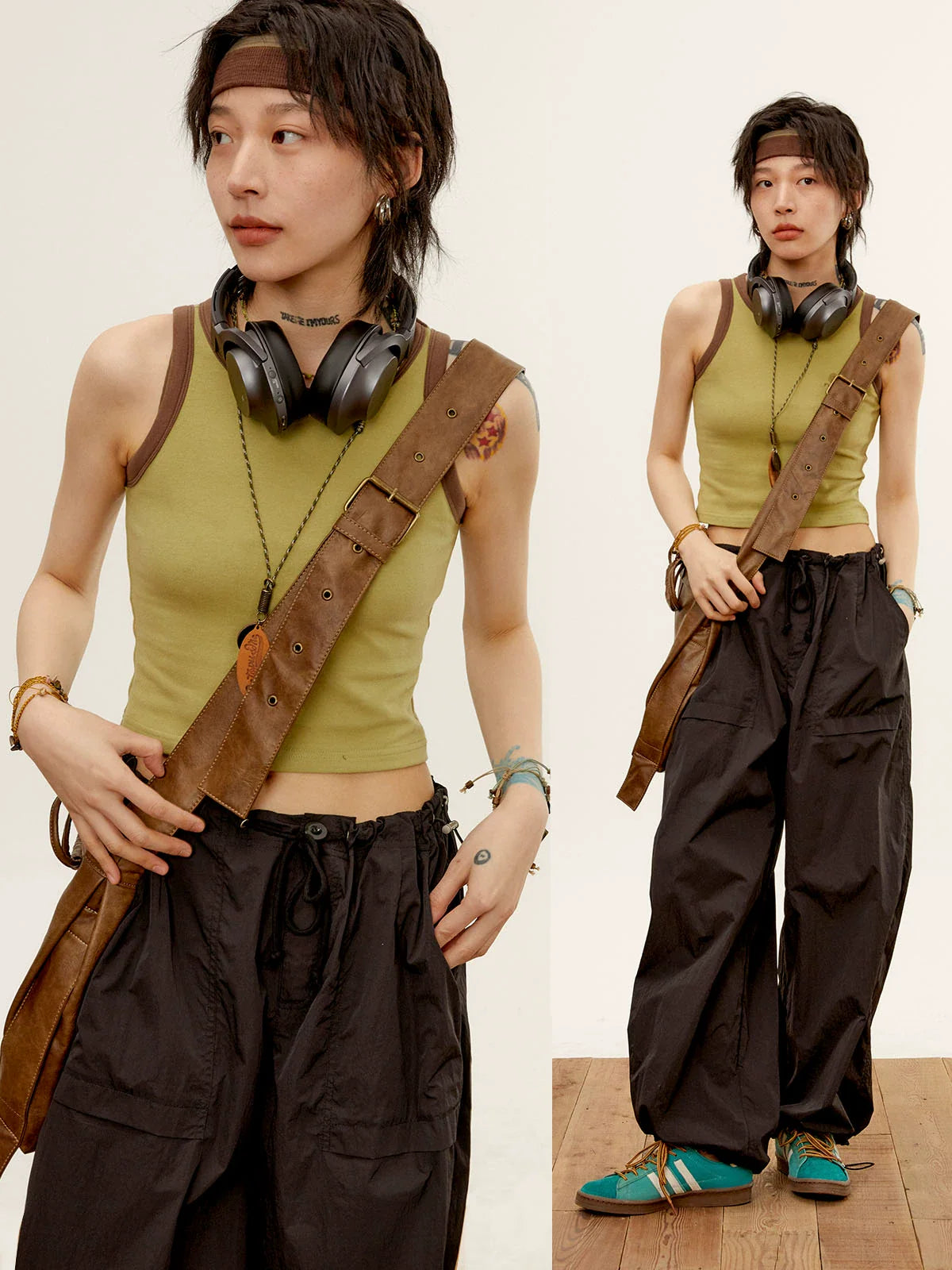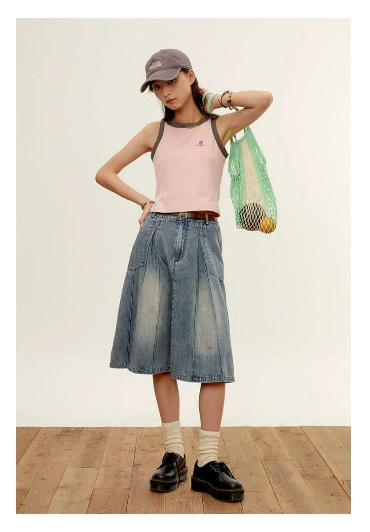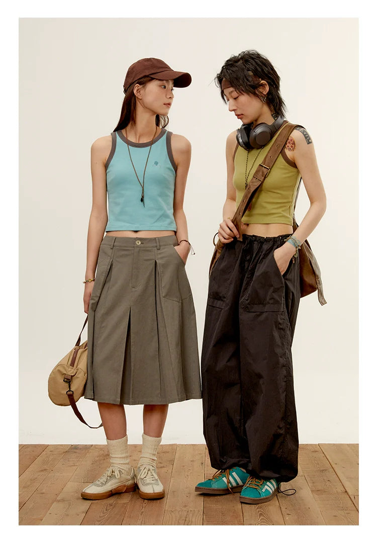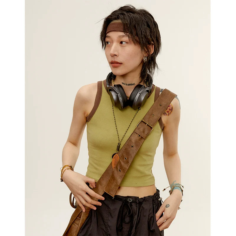 This slightly elastic. contrast-color fitted racerback tank top is incredibly slimming. It perfectly divides body proportions. offering effortless summer color coordination. The matching embroidery colors add a playful touch. Available in four color options.