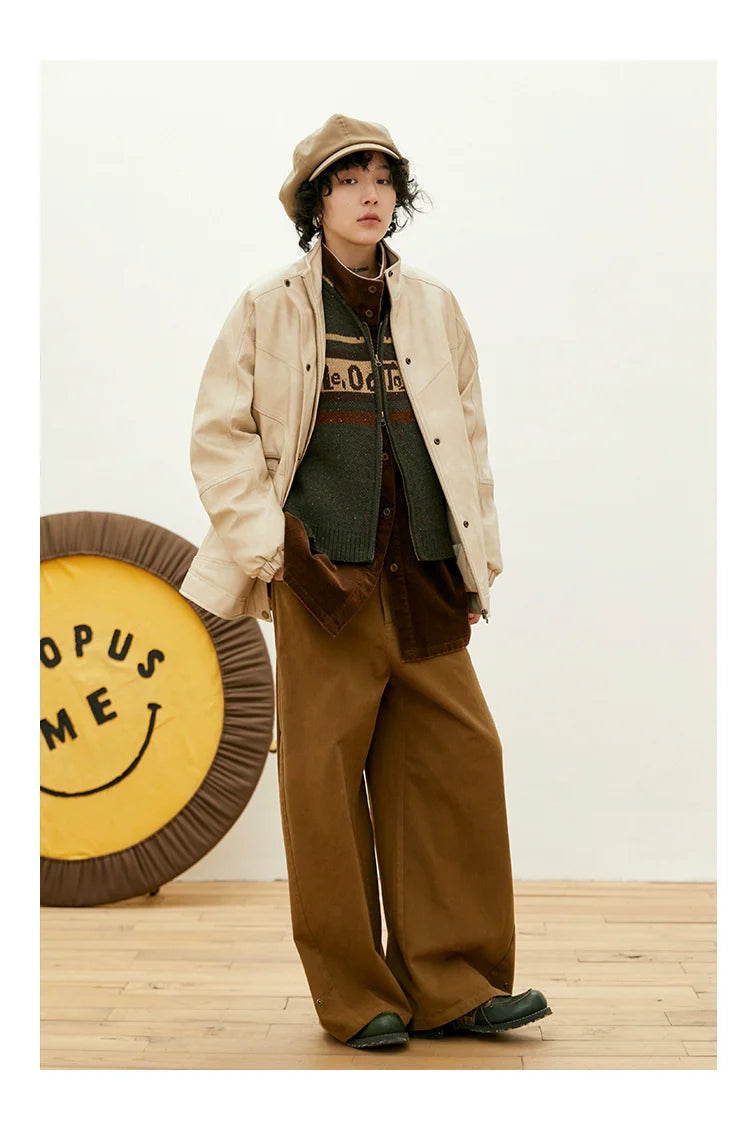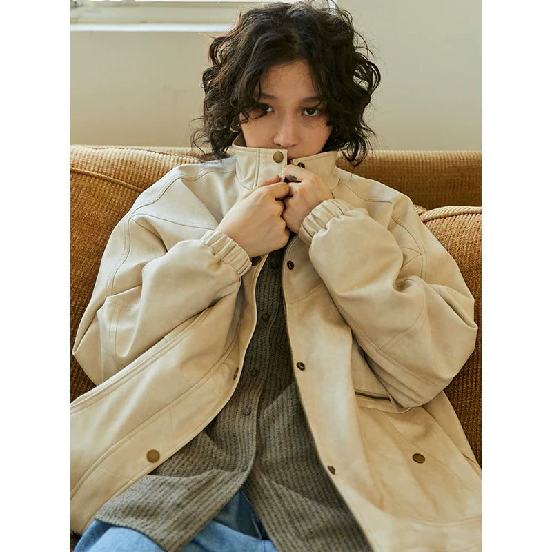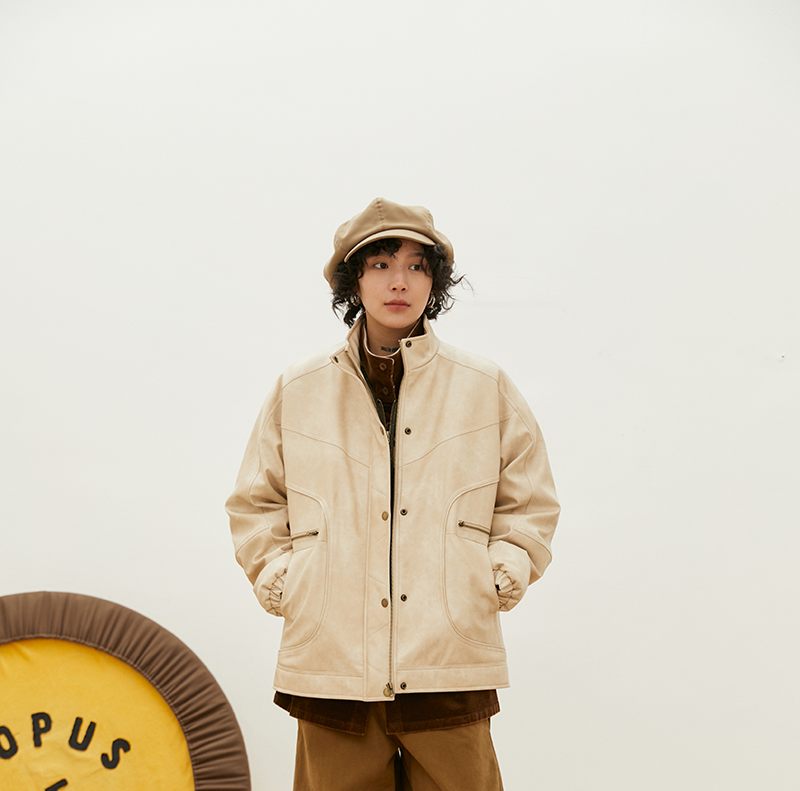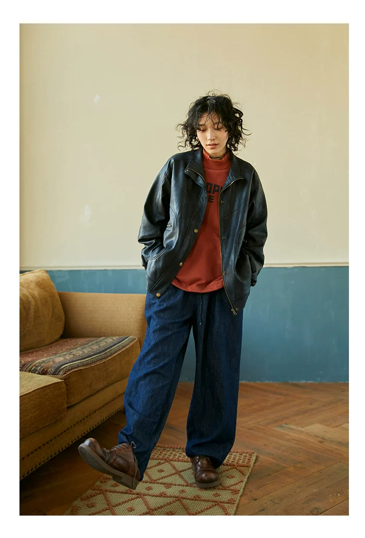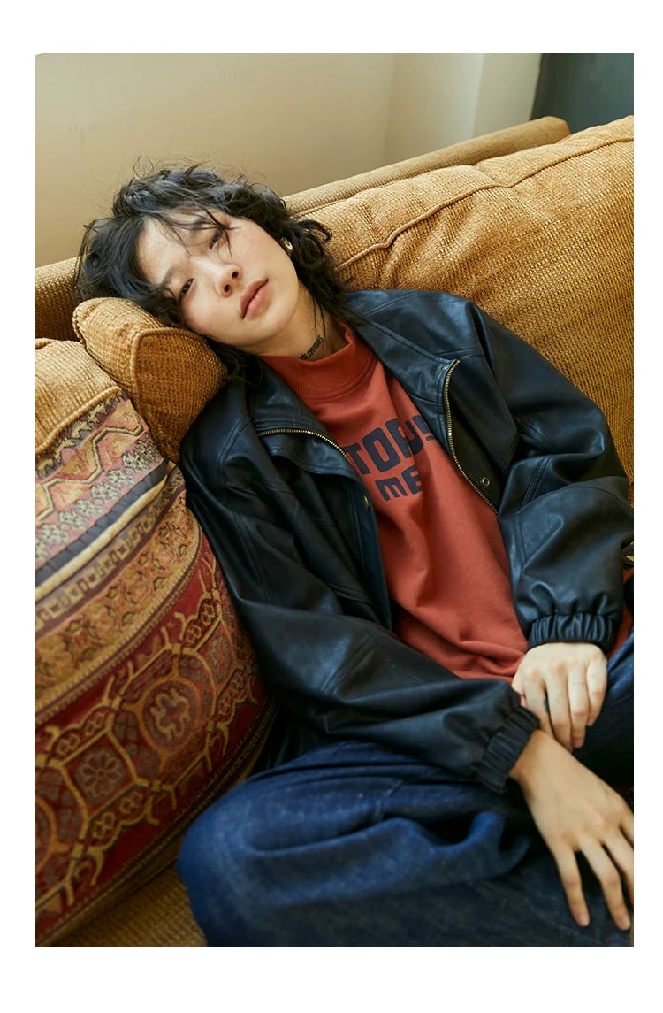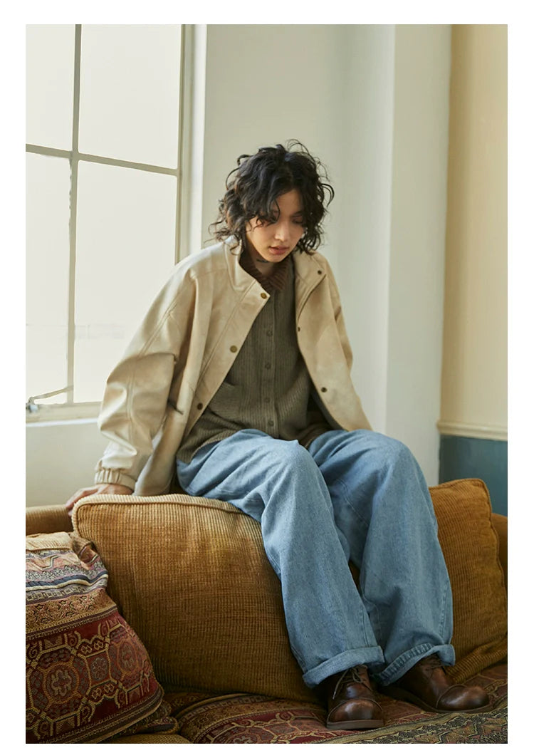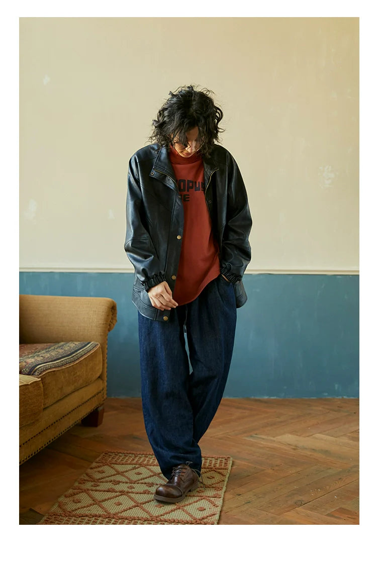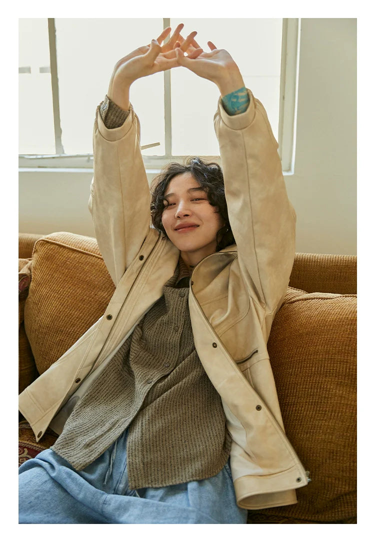 This leather jacket comes with an inherently cool. wind-resistant quality. Made from high-quality PU leather. it offers a soft. slightly elastic touch for comfortable wear. Special processing techniques create a two-tone faded. washed effect. enhancing its vintage appeal. The collar can be worn up or folded down. allowing for versatile styling options.