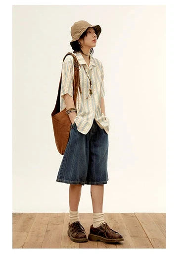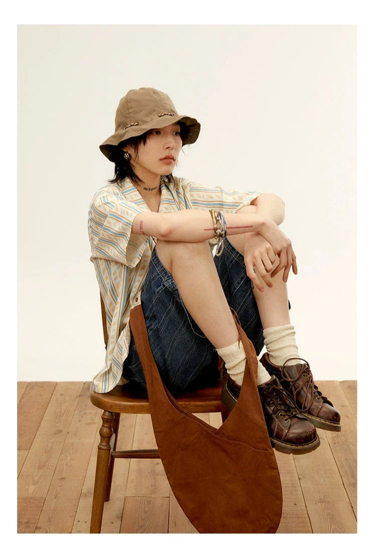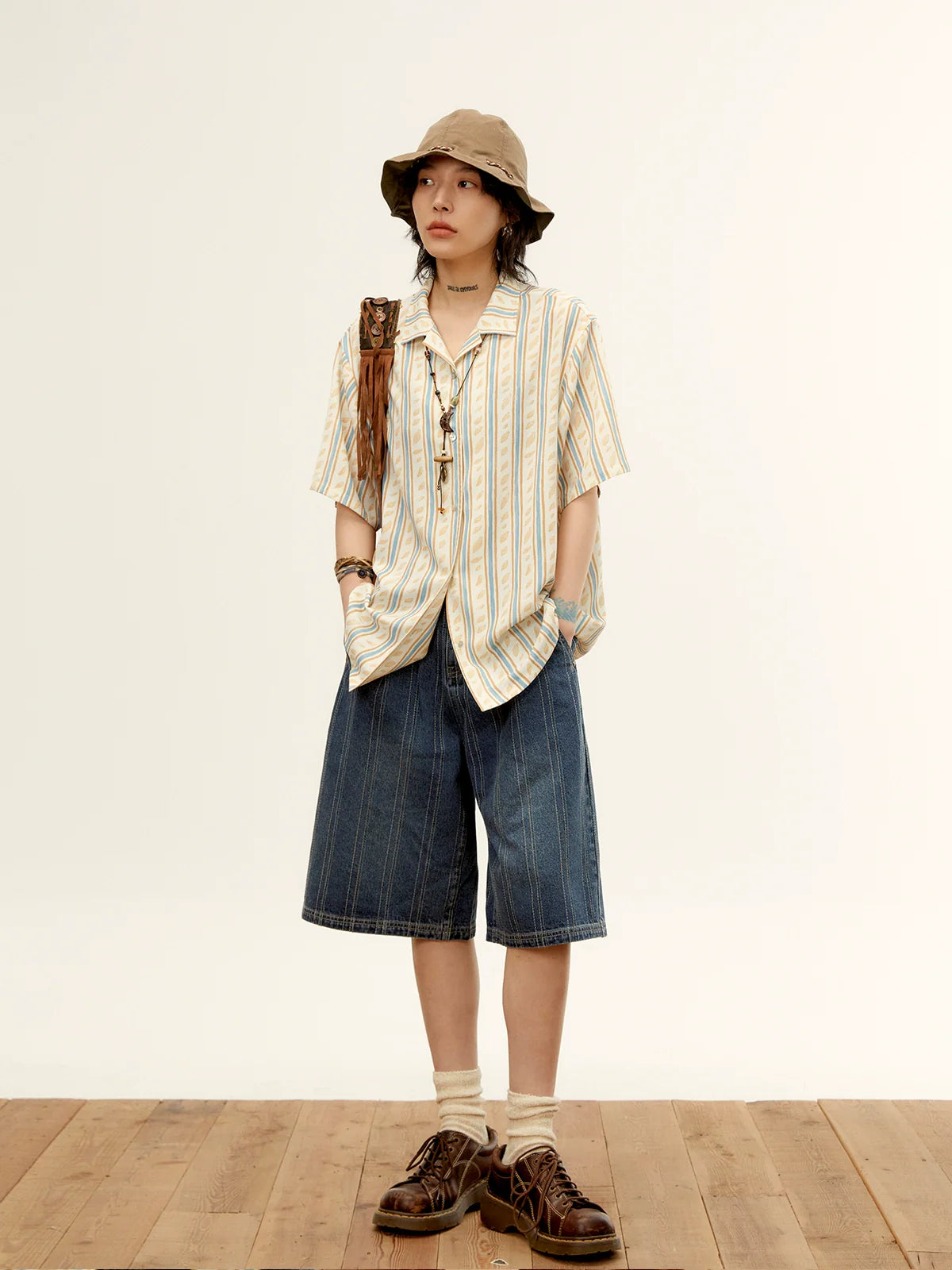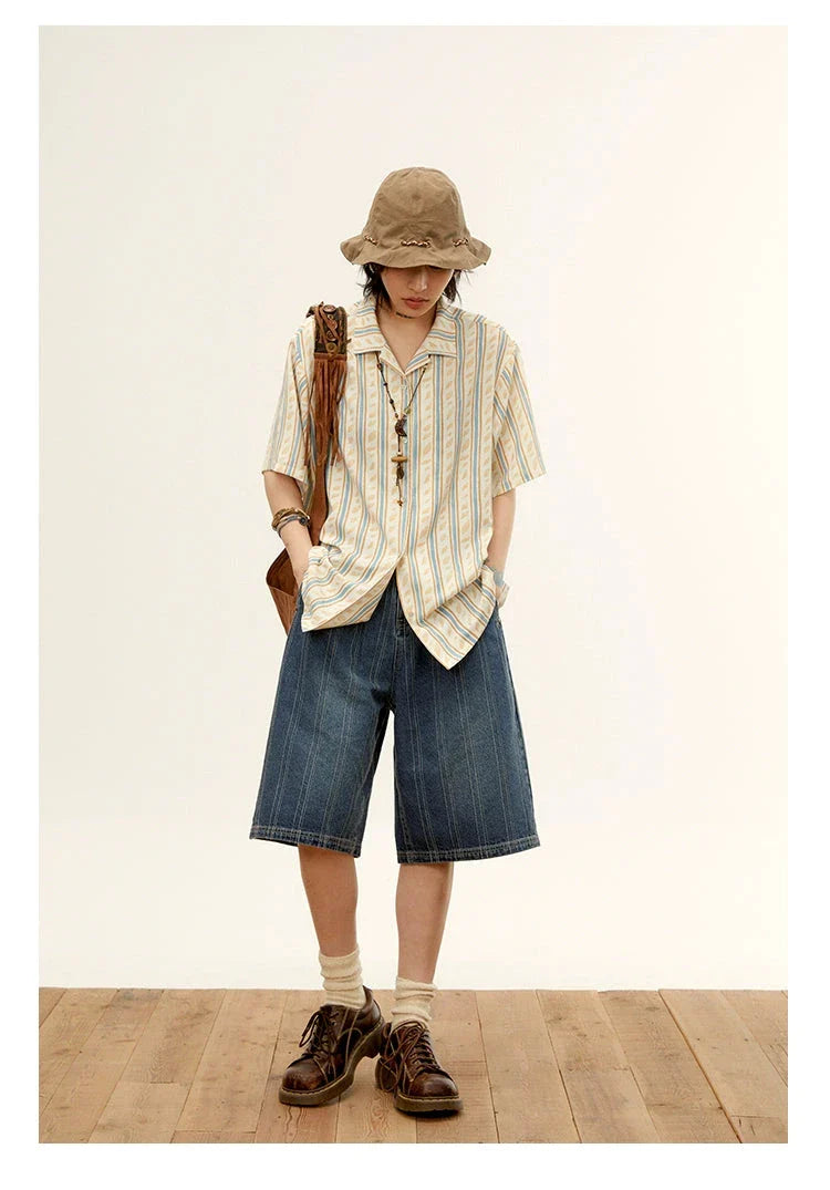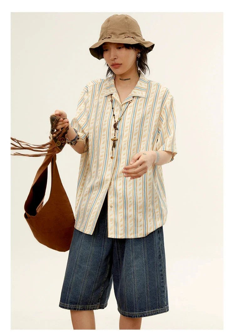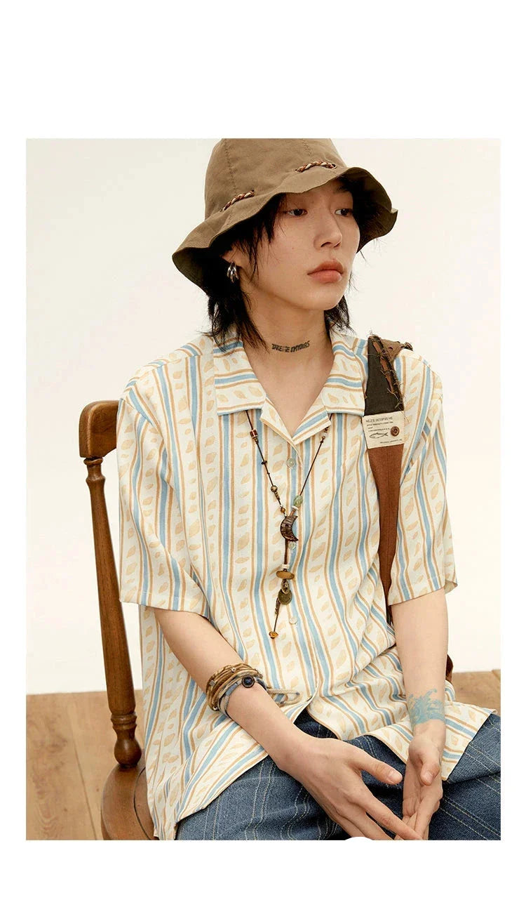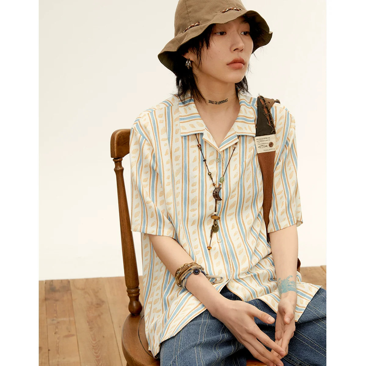This shirt features an original. refreshing watercolor-style hand-drawn stripe pattern. The combination of solid and transparent elements creates a layered. cool visual effect that enriches the overall appearance. This basic. loose-fit Cuban collar shirt is simple yet far from monotonous. versatile yet special.